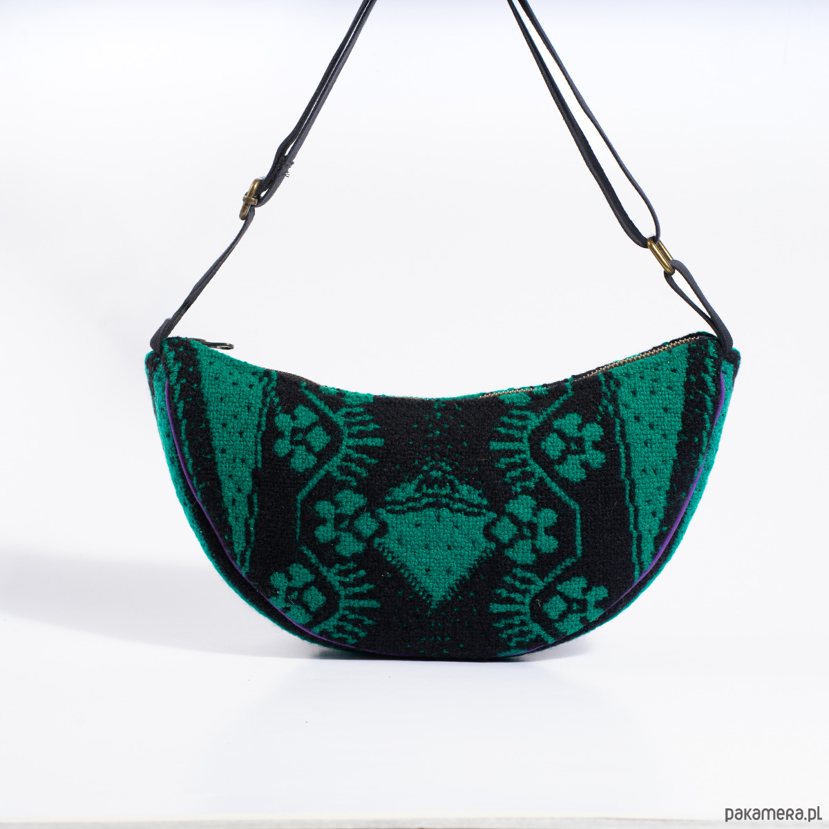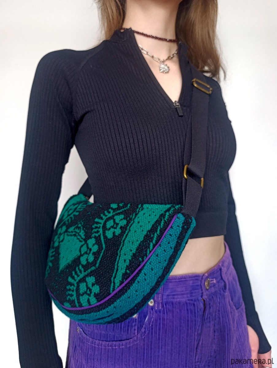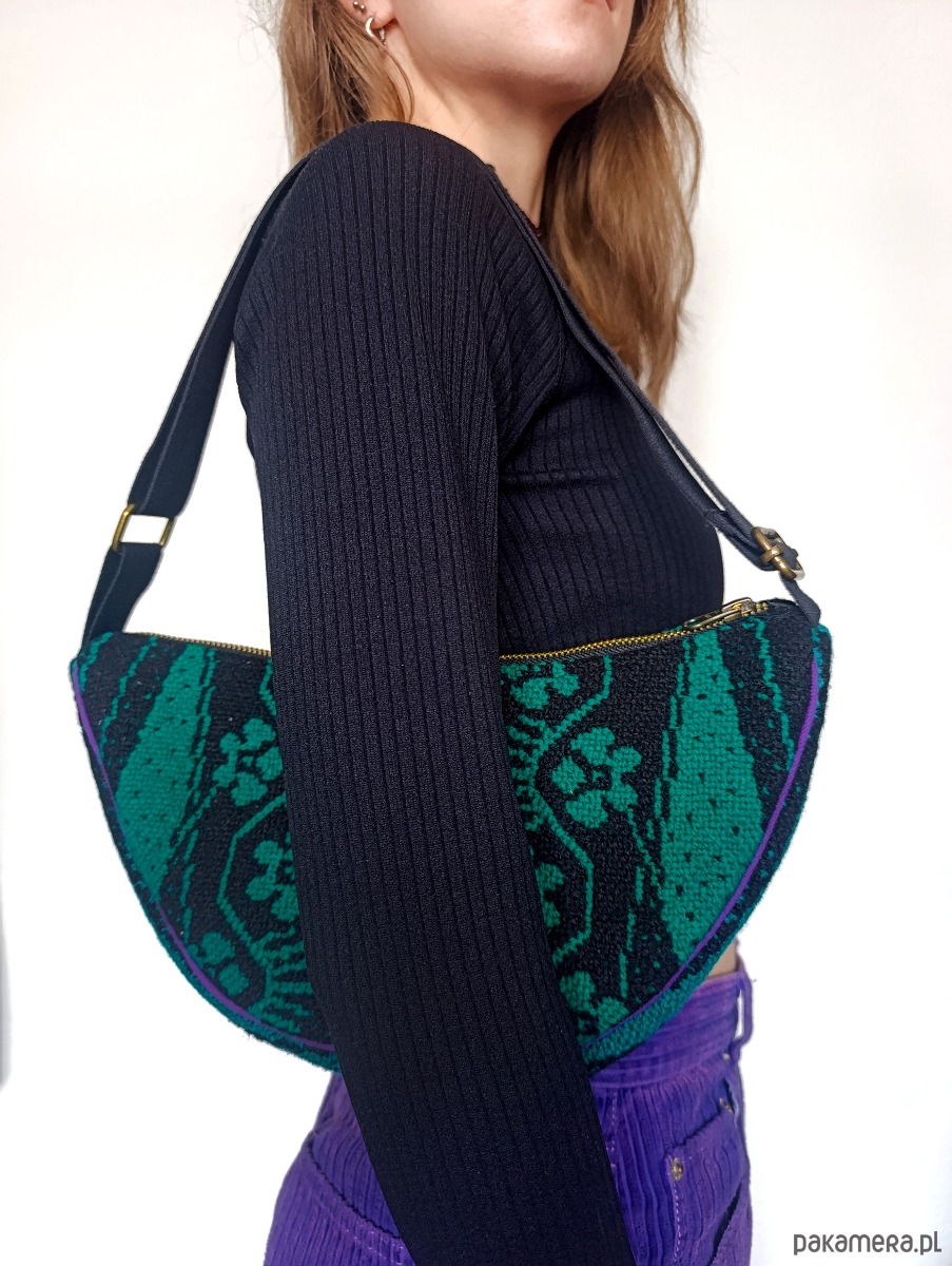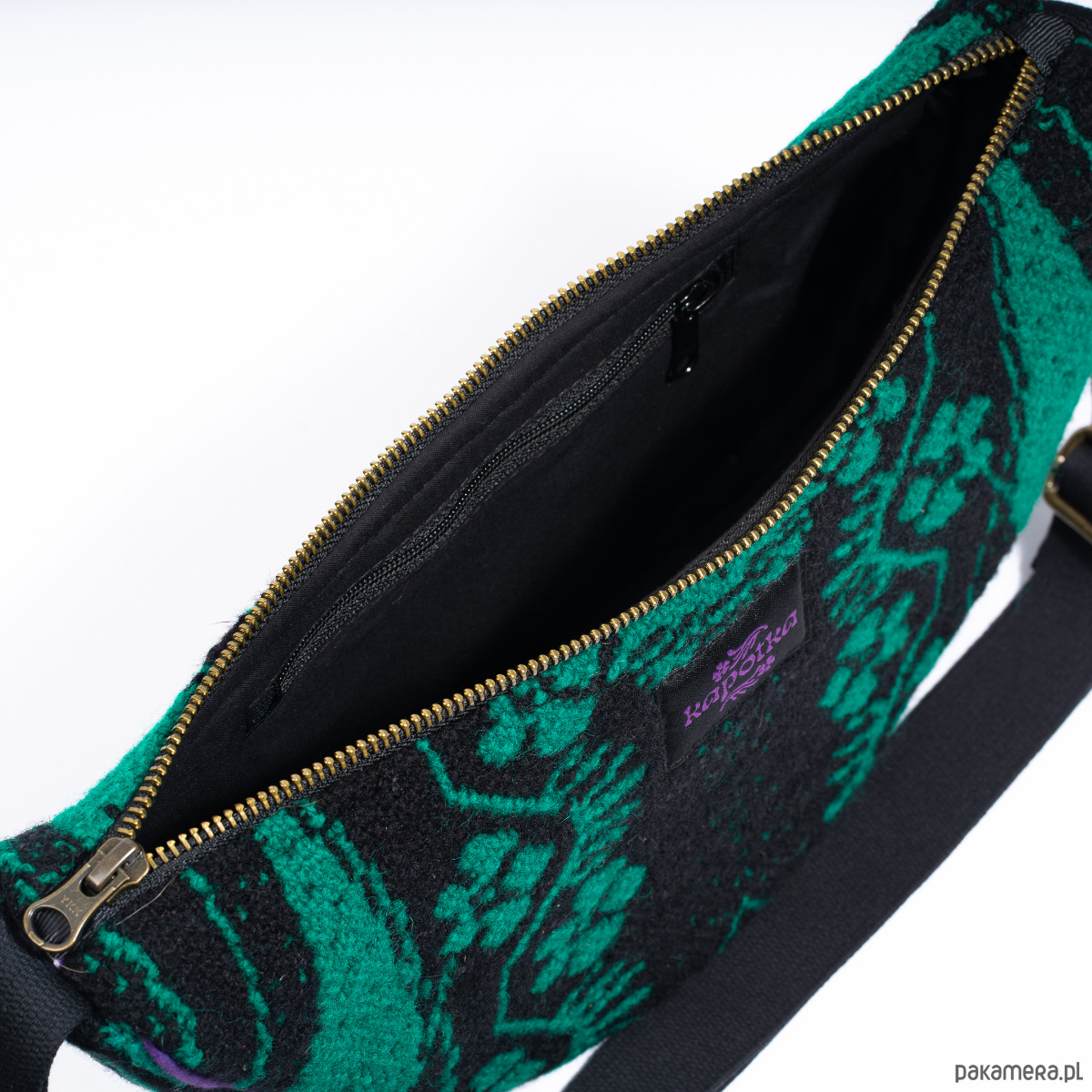 "Upcyclingowa torebko - nerka na ramię z pięknej żakardowej, ludowej tkaniny, w kolorze zielono-czarnym. Z regulowanym paskiem, dzięki czemu można nosić na krótkim, na ramieniu, albo na dłuższym na skos. W środku mała kieszonka. Wykończona bawełniana podszewką. Zapinana na porządny metalowy zamek firmy YKK. Czarny pasek, miękki i wytrzymały, z parcianej taśmy bawełnianej. Elementy kaletnicze pochodzą od polskiego producenta, są metalowe i wysokiej jakości. w kolorze starego złota.