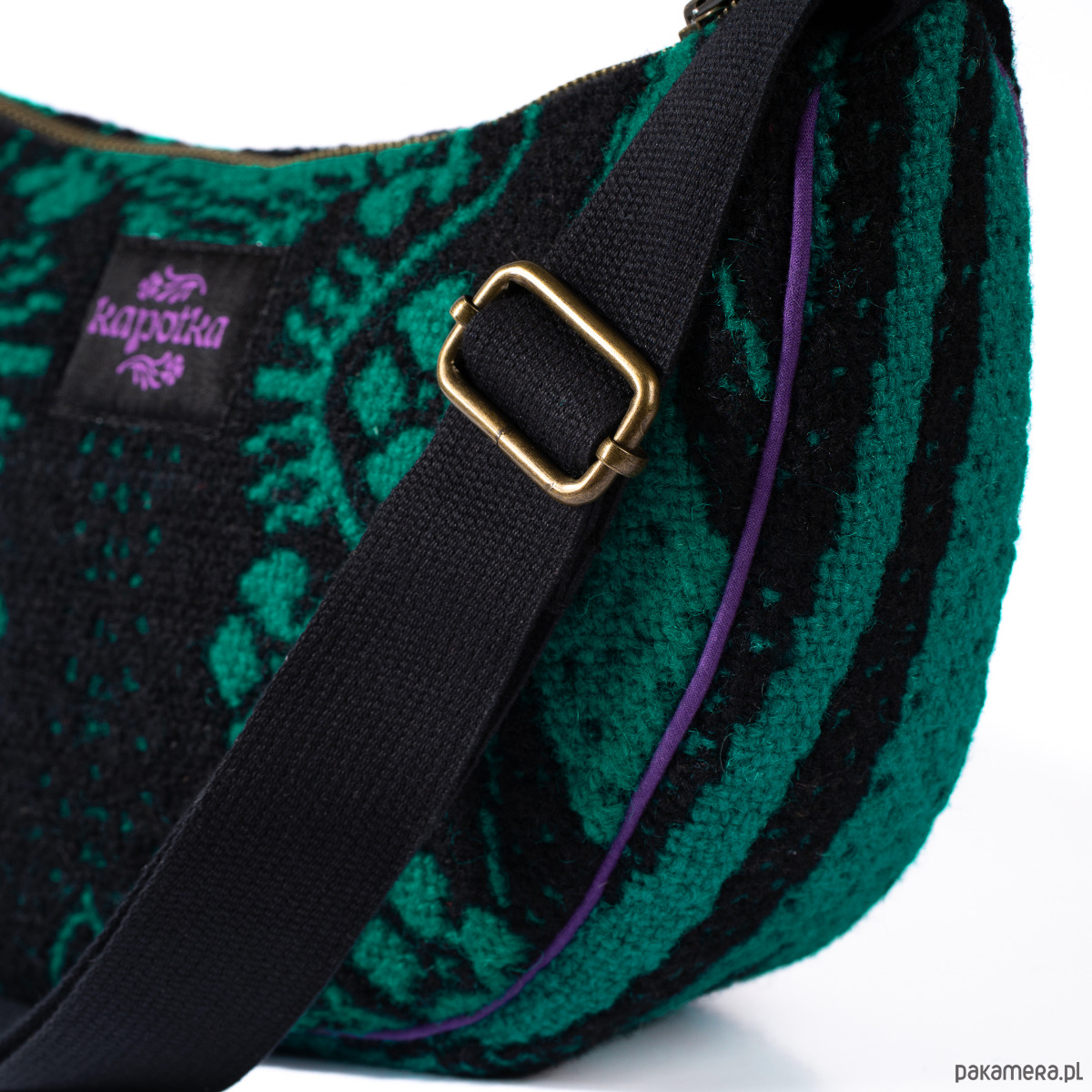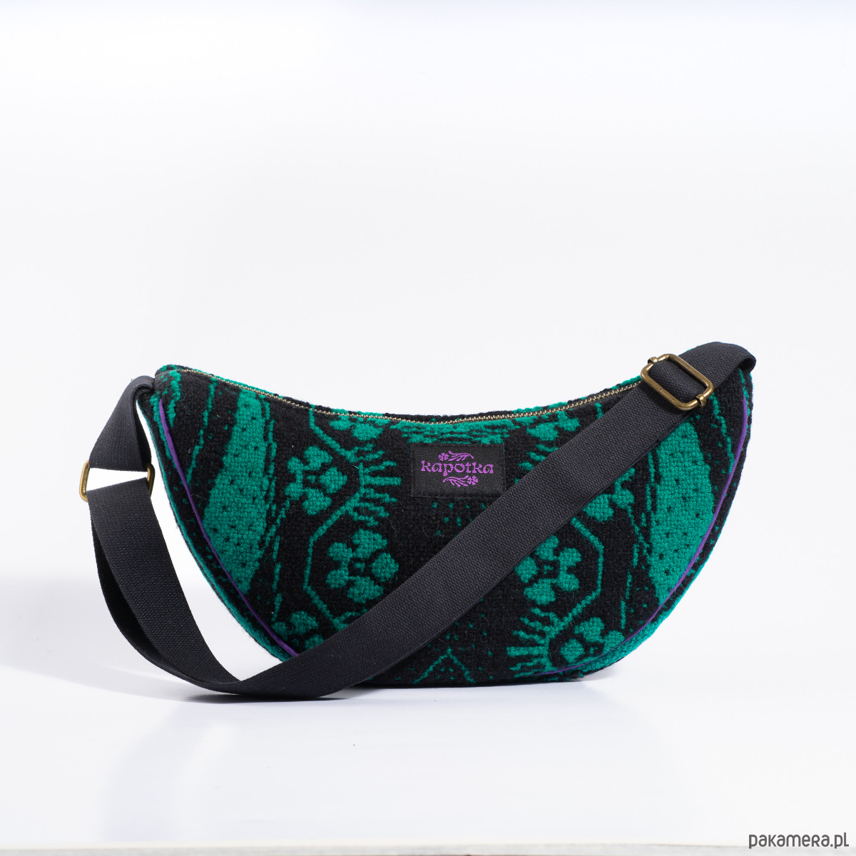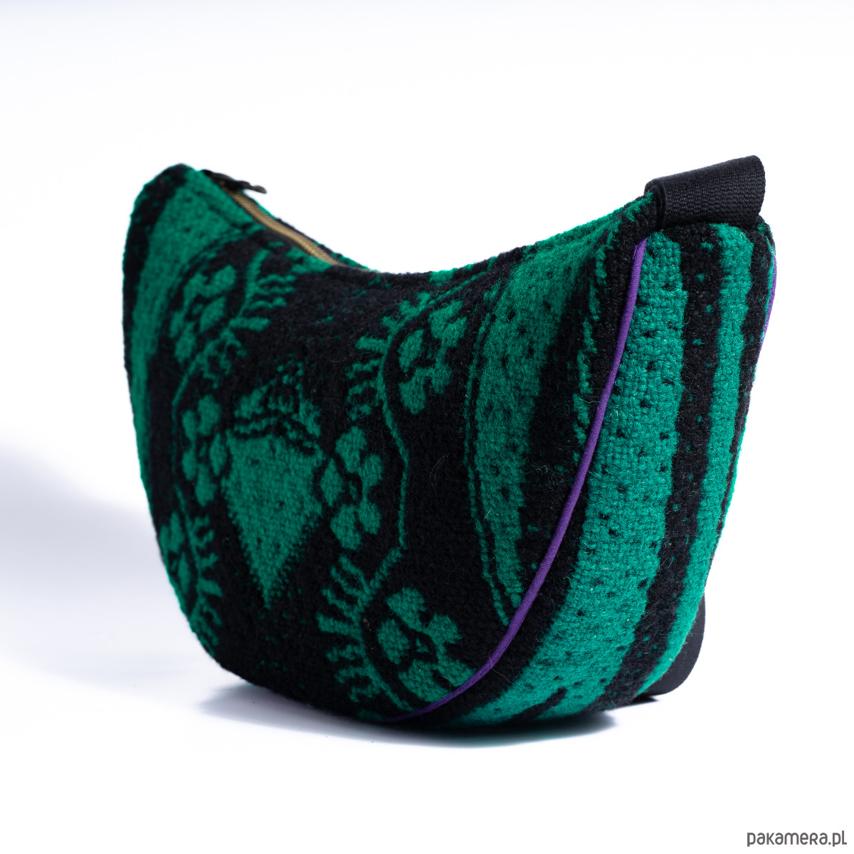 "Upcyclingowa torebko - nerka na ramię z pięknej żakardowej, ludowej tkaniny, w kolorze zielono-czarnym. Z regulowanym paskiem, dzięki czemu można nosić na krótkim, na ramieniu, albo na dłuższym na skos. W środku mała kieszonka. Wykończona bawełniana podszewką. Zapinana na porządny metalowy zamek firmy YKK. Czarny pasek, miękki i wytrzymały, z parcianej taśmy bawełnianej. Elementy kaletnicze pochodzą od polskiego producenta, są metalowe i wysokiej jakości. w kolorze starego złota.