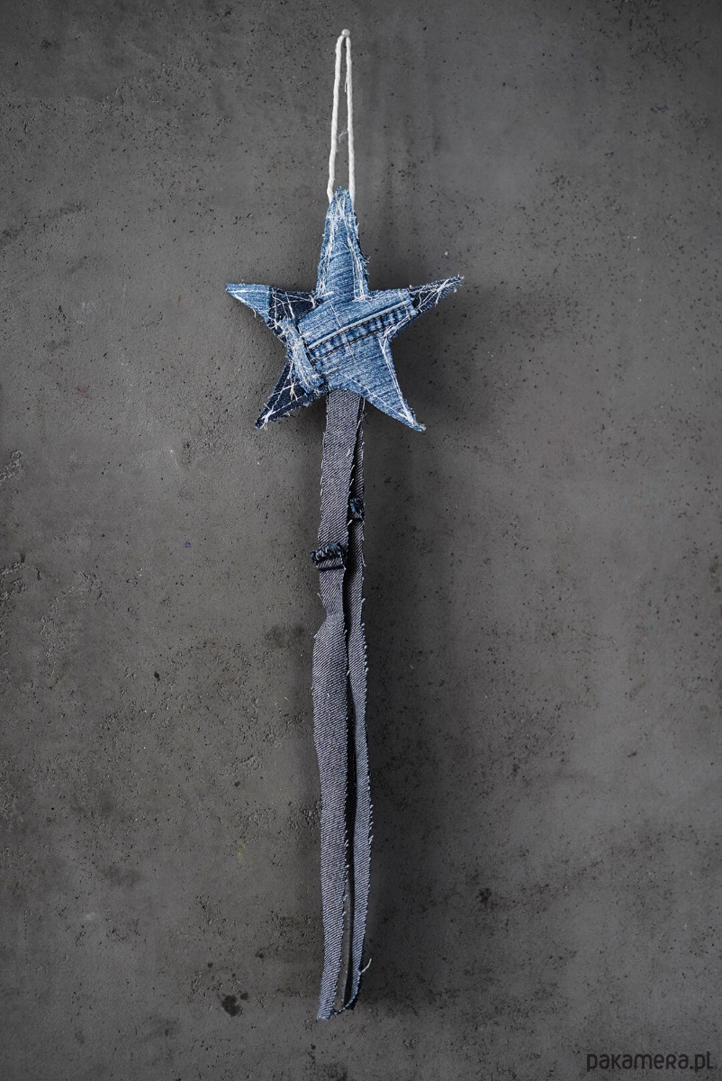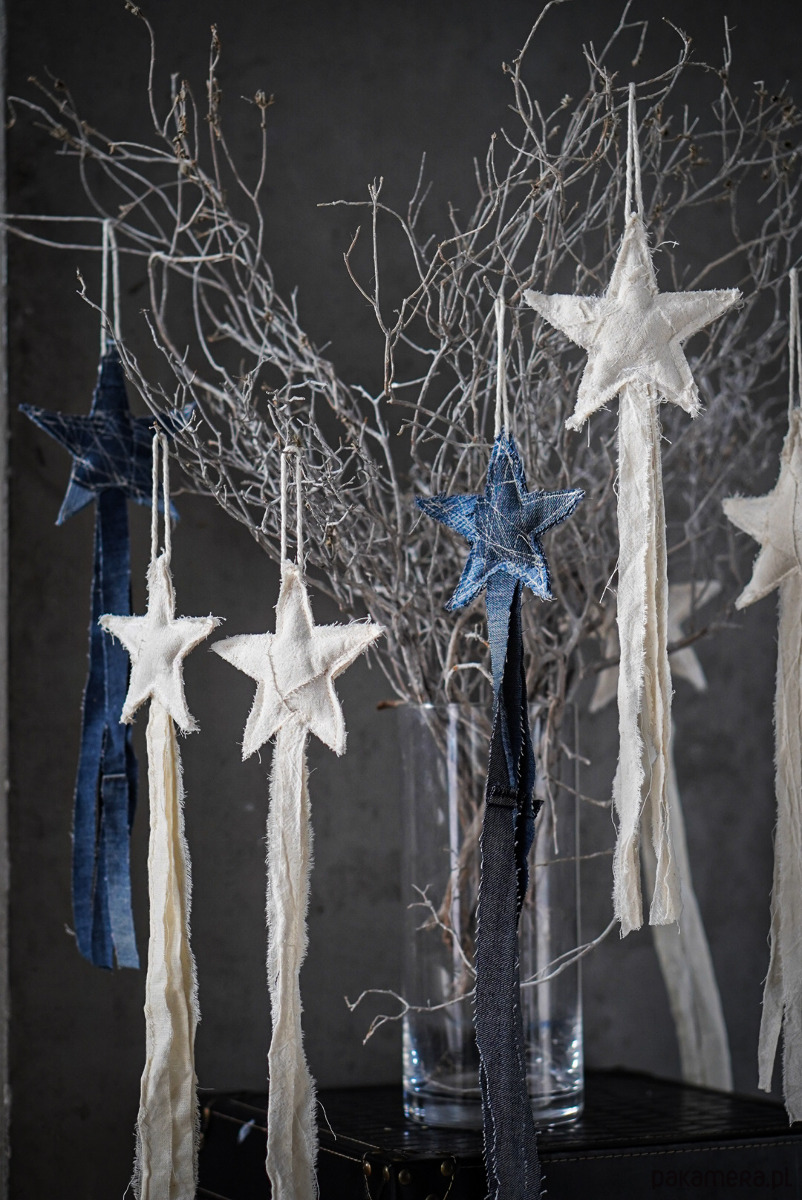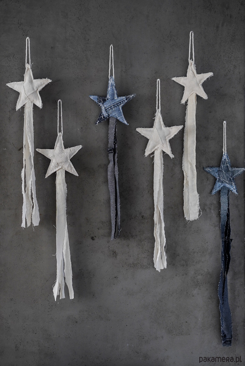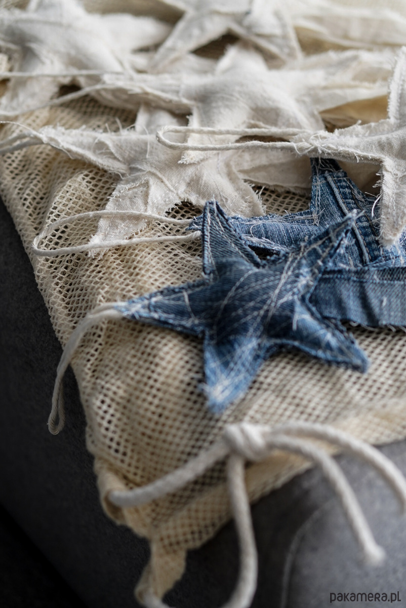 Ozdoby szyte z odzyskanych tkanin – denim i surowa bawełna.