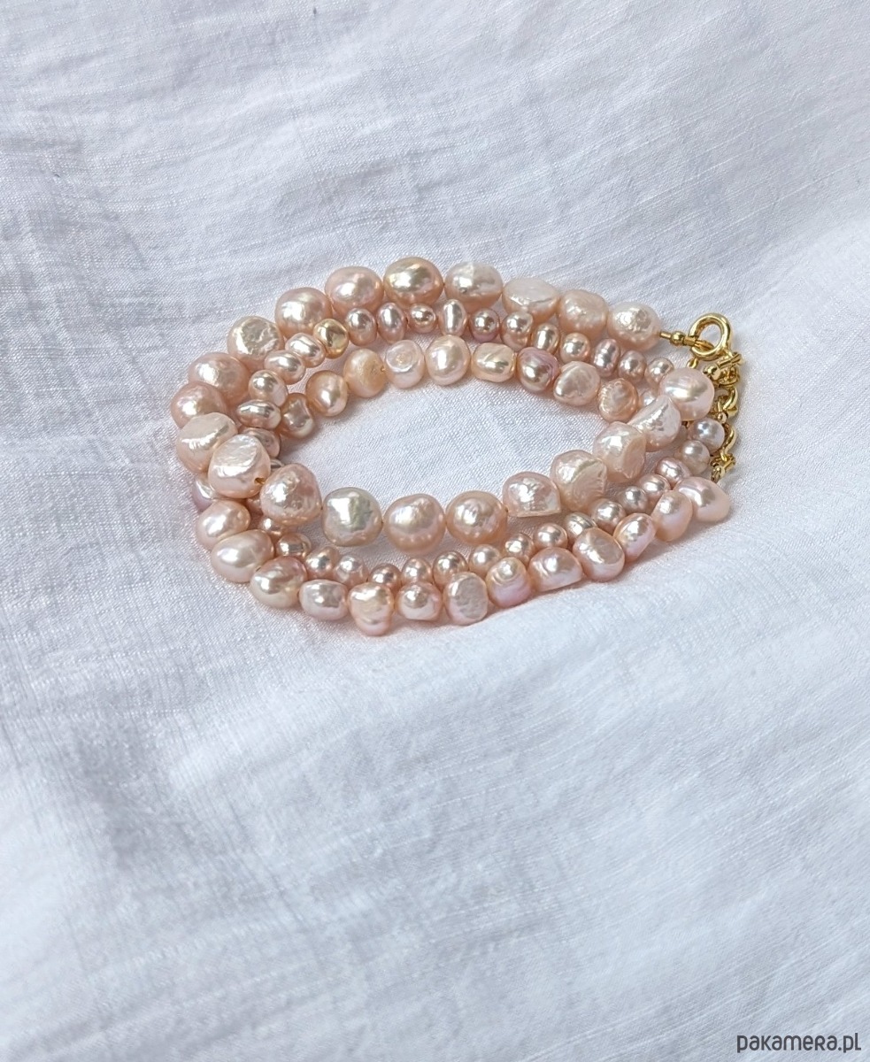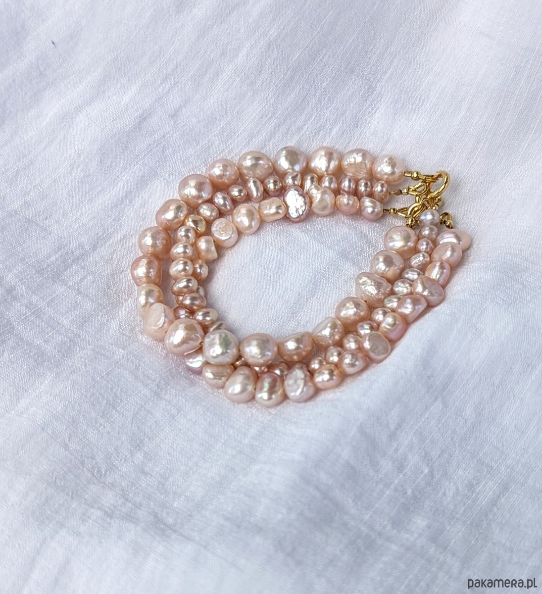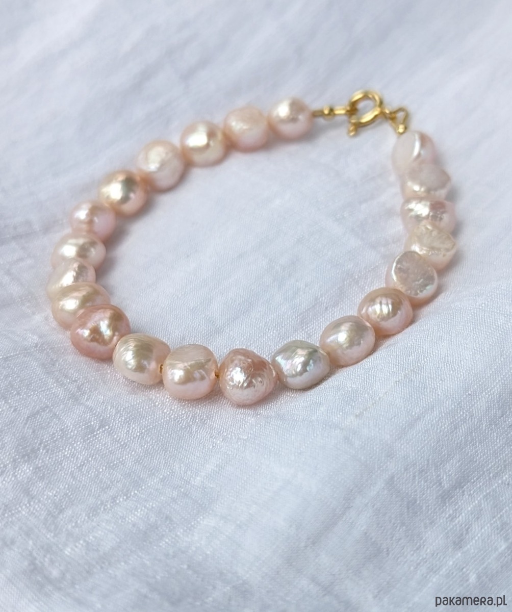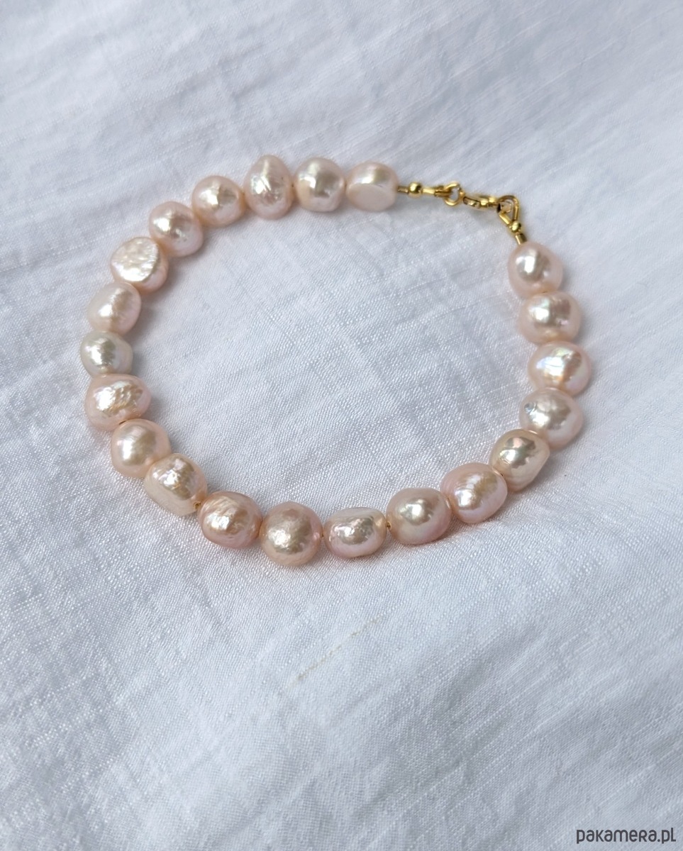 Bransoletka z perełek średniej wielkości o nieregularnym kształcie, zbliżonym do kulistego. Niektóre perły są z jednej strony spłaszczone lub lekko chropowate. To biżuteria dla kobiety, która lubi mieć coś specjalnego, nieidealnego, uroczego. Kolor w odcieniach bladego różu, blask zmienia się w zależności od światła.