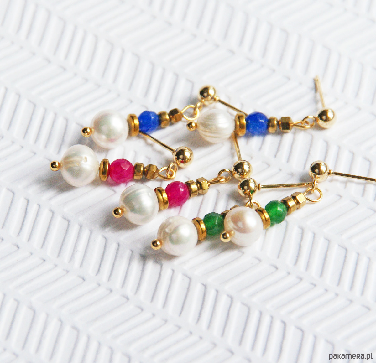 Urocze kolczyki pozłacane : perły & jadeit : MAGENTA : różowe