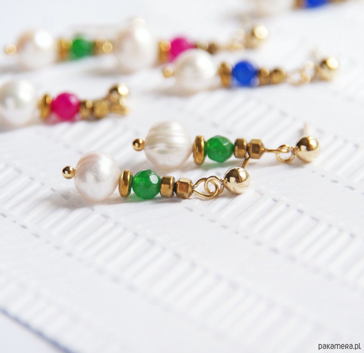 Urocze kolczyki pozłacane : perły & jadeit : zieleń