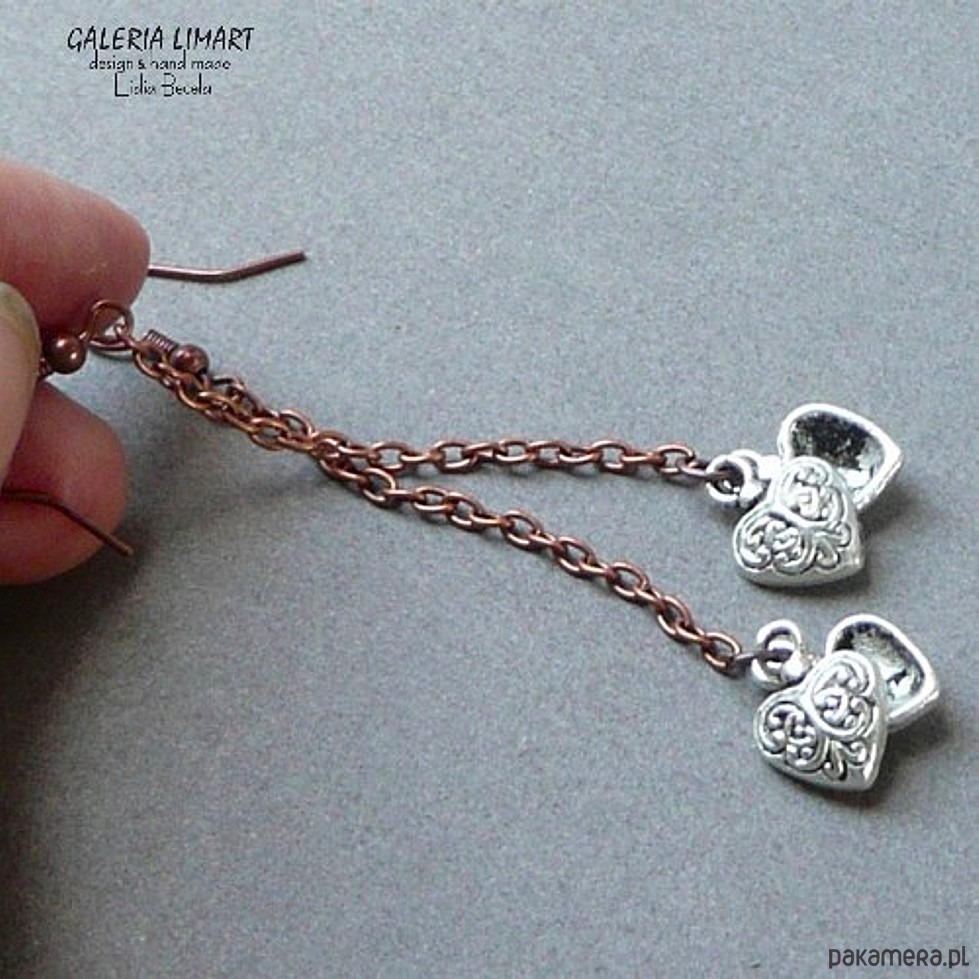 Urocze długie ok. 8 cm kolczyki z miedzianego łańcuszka i dwóch serduszek (każdy kolczyk) typu bali z tzw. srebra tybetańskiego, utrzymane w duchu bardzo modnej biżuterii Boho (bohemy, cyganerii artystycznej, new hippie style). Styl BOHO świeci tryumfy w całym modowym świecie.