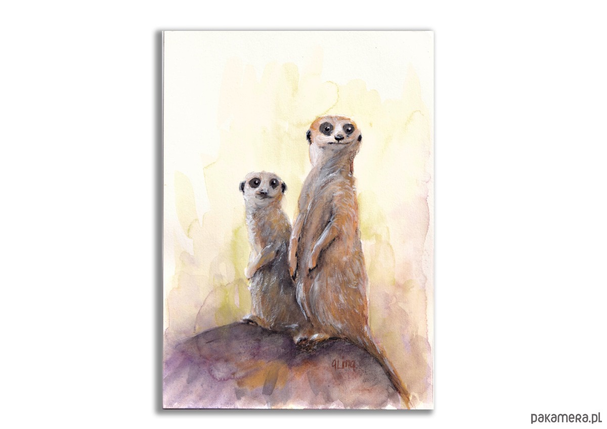 Ręcznie malowany obraz przedstawiający dwie stojące surykatki na skale. Obraz wykonany techniką akwarelową, na białym, wysokogatunkowym 300g papierze (15x 20cm).