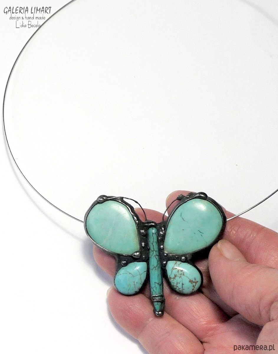 Okazały, spektakularny turkusowy naszyjnik w kształcie uroczego motyla zawieszonego na stalowej obroży. Autorsko oprawiony w technice Tiffany.