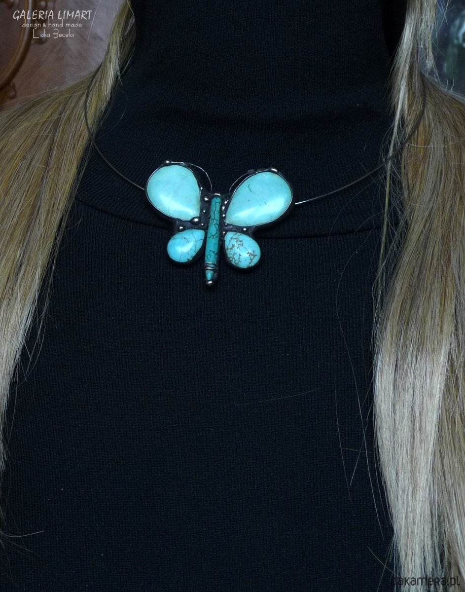 Uroczy motyl z howlitu turkusowego w naszyjniku handmade prezent z klasą