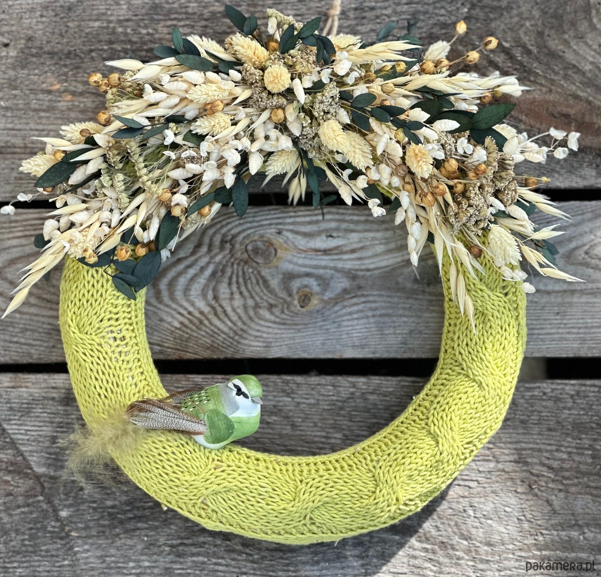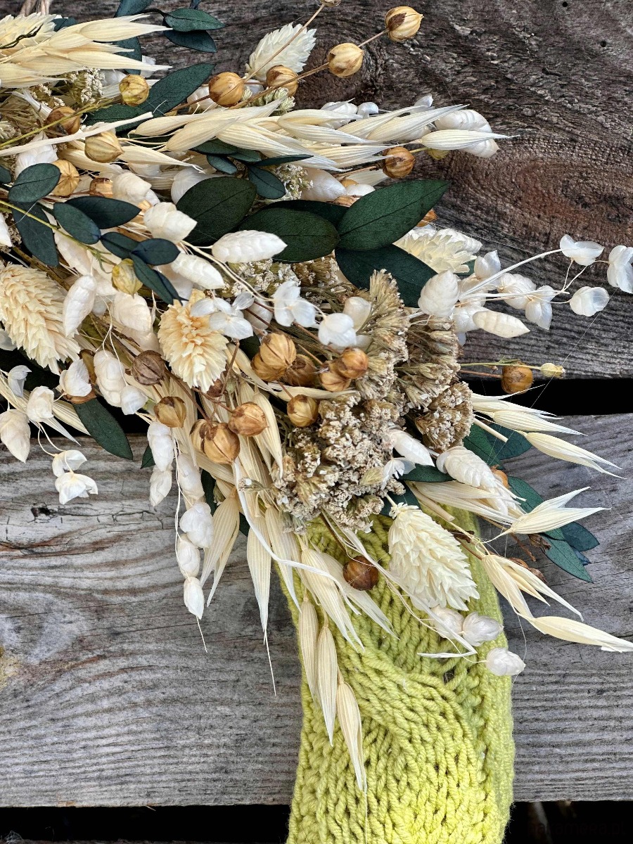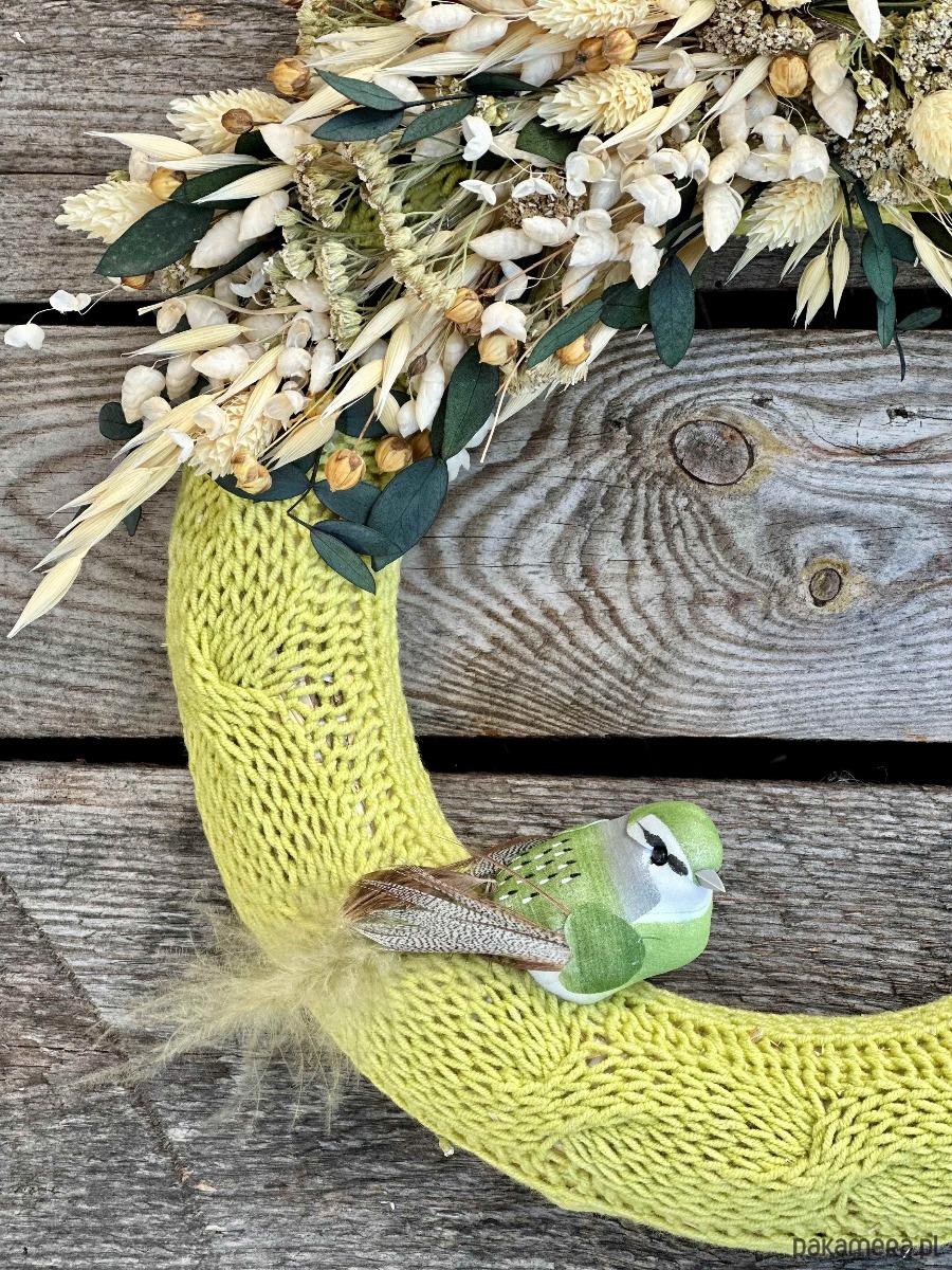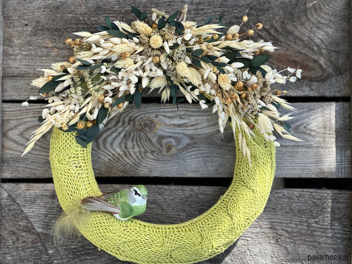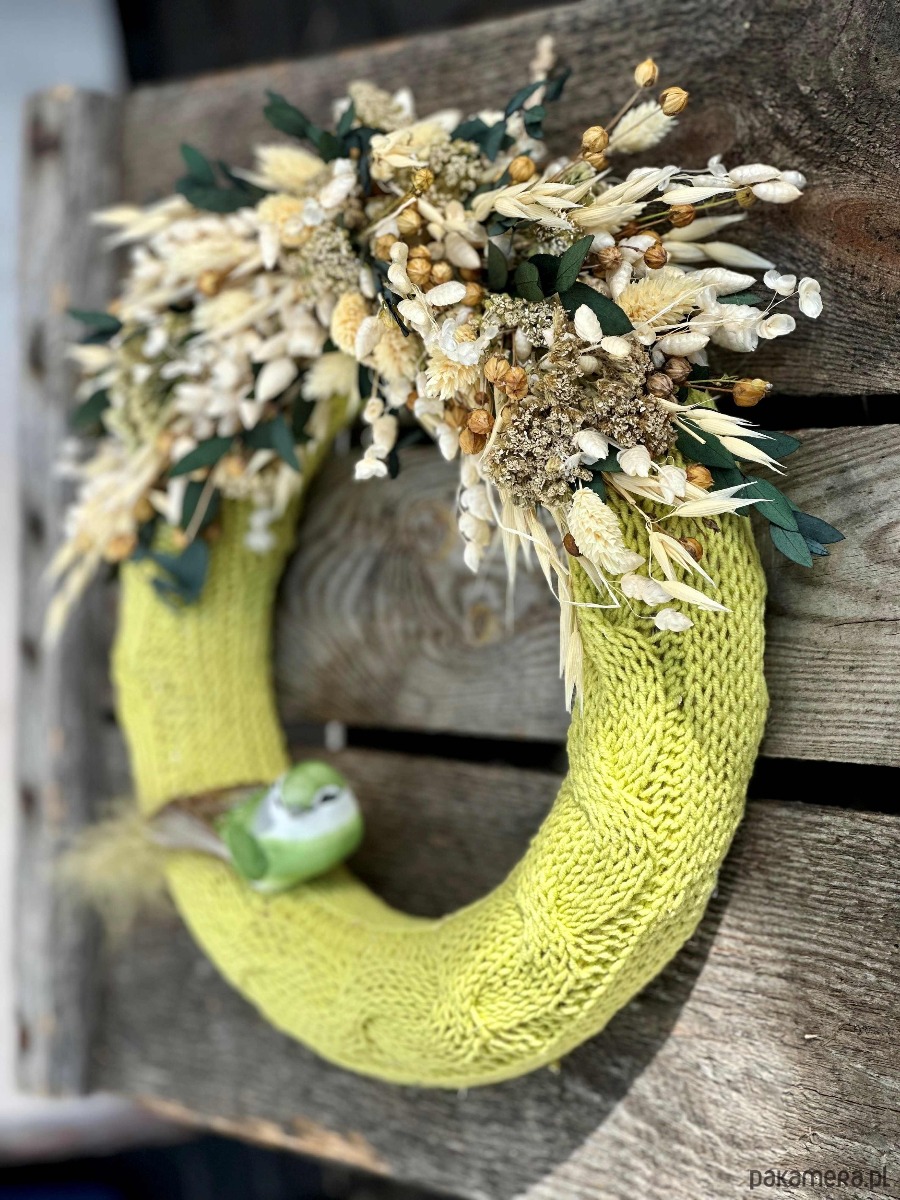Wianek w ręcznie robionym, zielonym sweterku z włóczki, ozdobiony naturalnymi, suszonymi kwiatami.