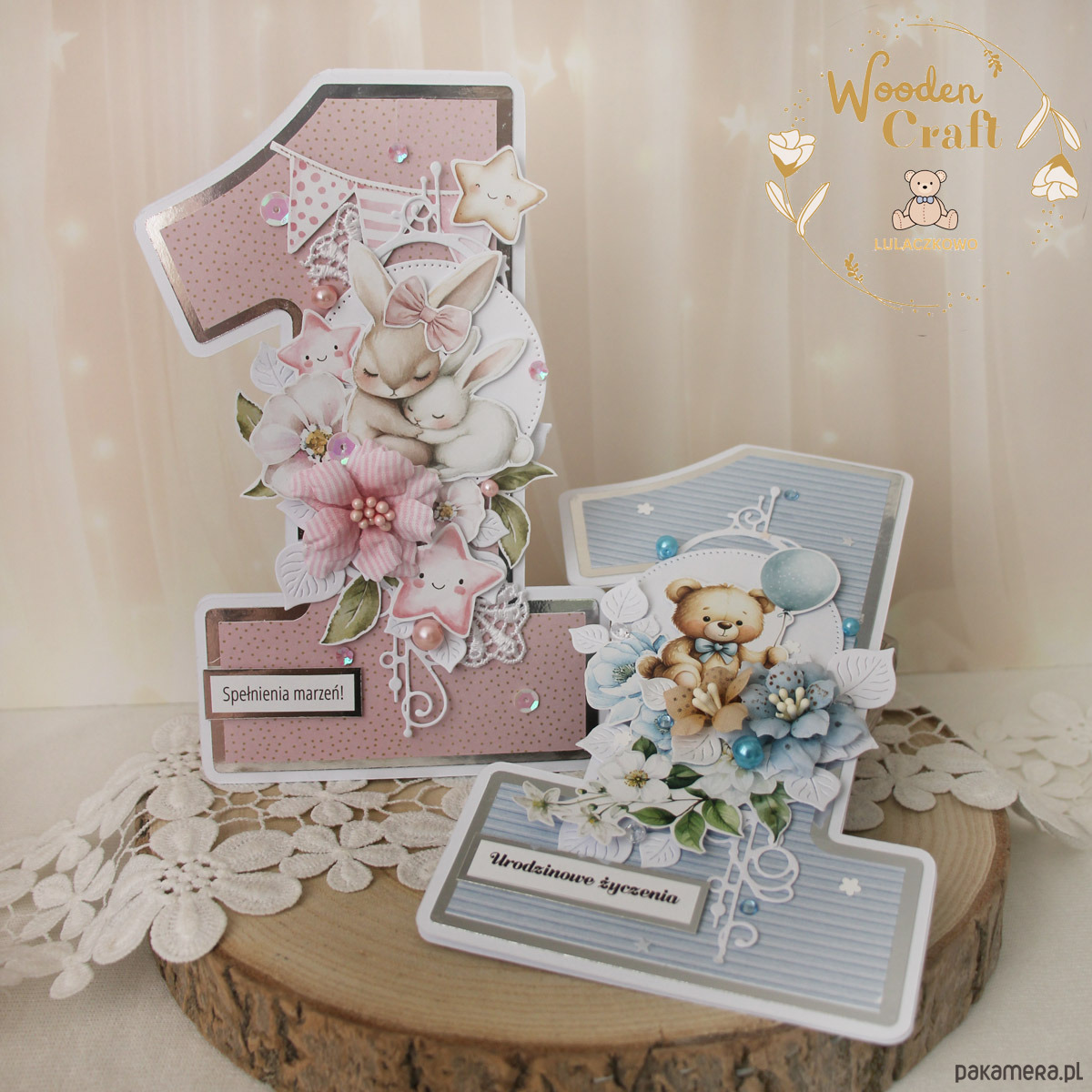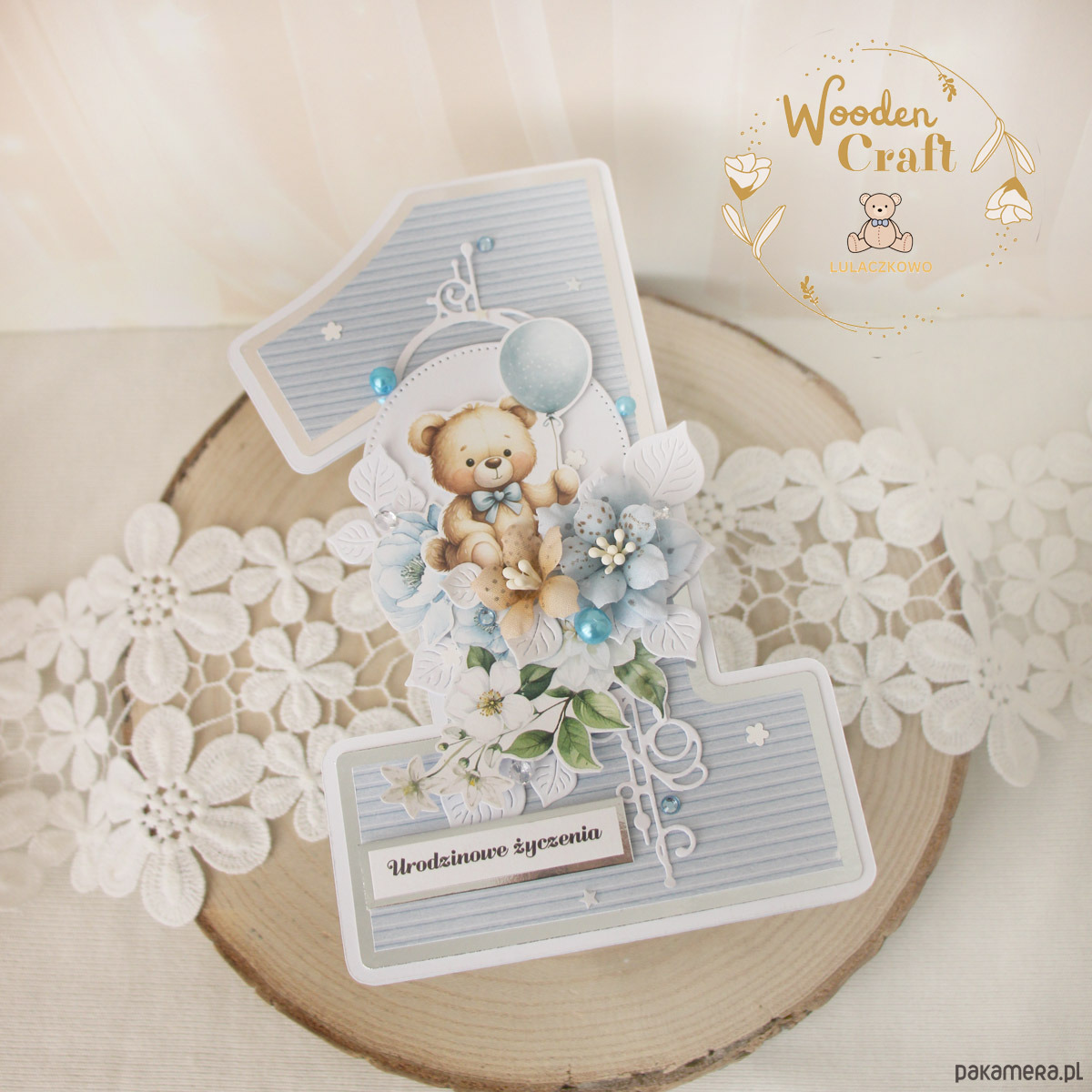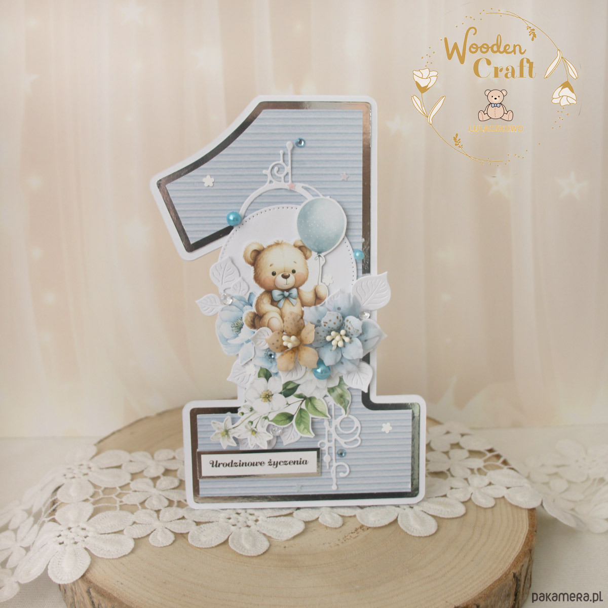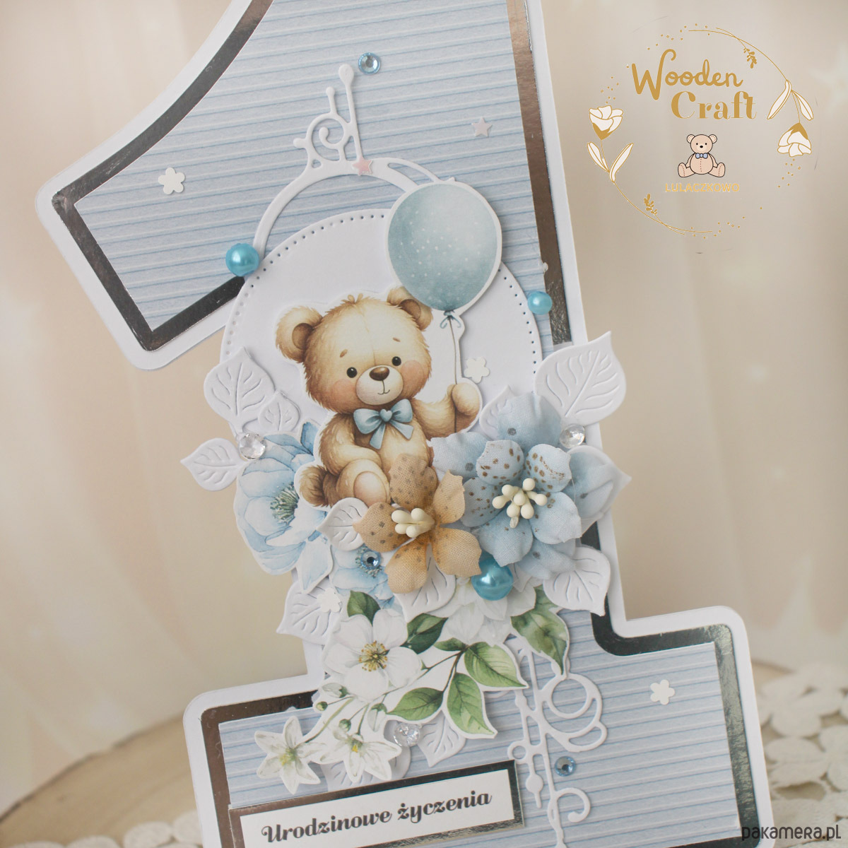 Urocza i nietuzinkowa, dziecięca kartka na roczek, w kształcie cyferki jedynki, wykonana z mixu kolekcji papierów dziecięcych, utrzymana w odcieniach błękitu, beżu i bieli z dodatkiem błyszczących, srebrnych akcentów. Kartka wykonana ręcznie z dbałością o każdy szczegół. Na środku znajduje się grafika uroczego pluszowego misia z balonikiem, ozdobiona kompozycją kwiatową z ręcznie wykonanymi, materiałowymi kwiatami, dodatkowo zdobiona kryształkami, perełkami i cekinami, a także napisem "Urodzinowe Życzenia" (na życzenie mogę dodać również imię dziecka, lub całkowicie zmienić napis na inny).