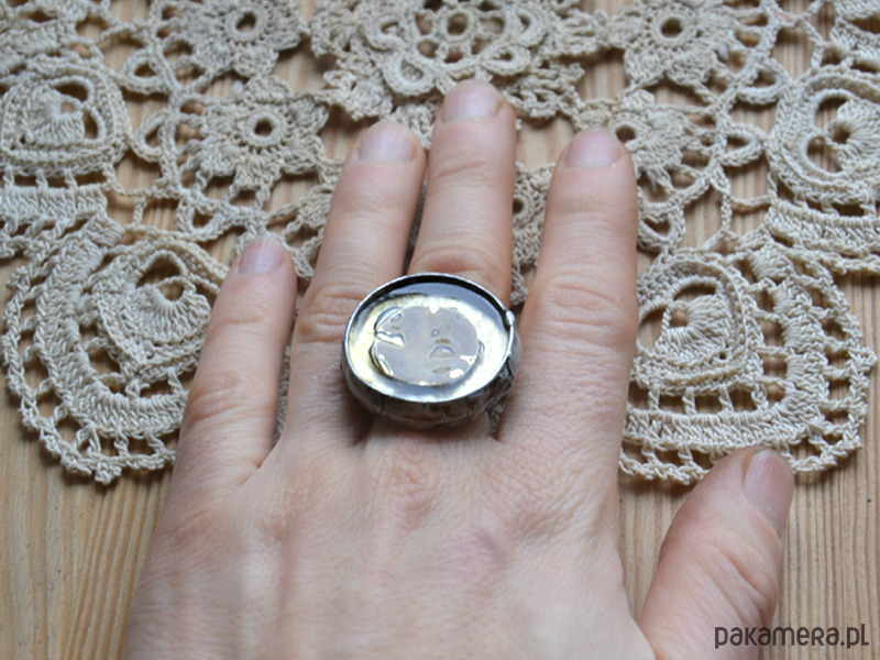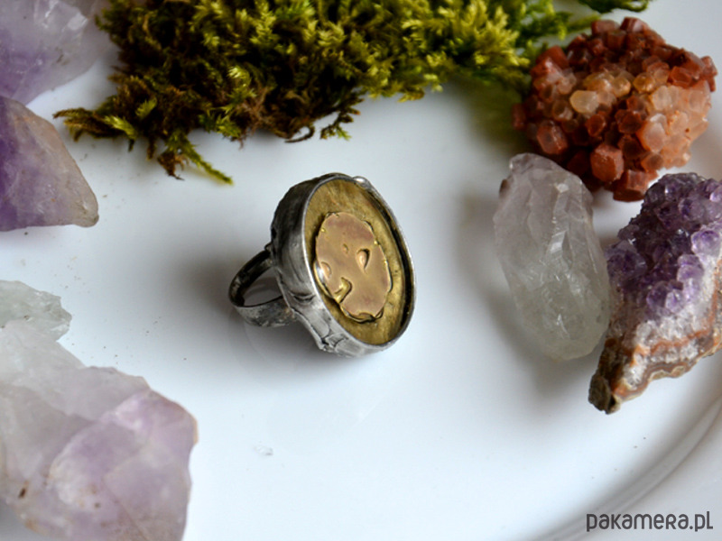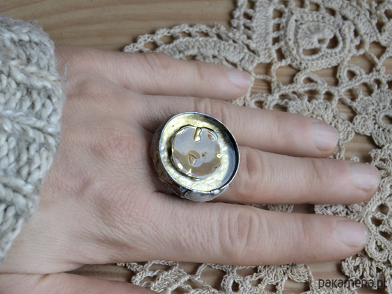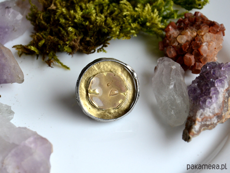 Przedstawiam duży, bardzo efektowny pierścionek ze szkłem w odcieniach złota. Średnica szkła wraz ze stylizowaną na stare srebro oprawą to ok. 3 cm. Obrączka regulowana. Pierścień wykonany w technice szkła stapianego w połączeniu z techniką Tiffany. Biżuteria w 100% wykonana ręcznie, poszczególne sztuki mogą się minimalnie między sobą różnić.