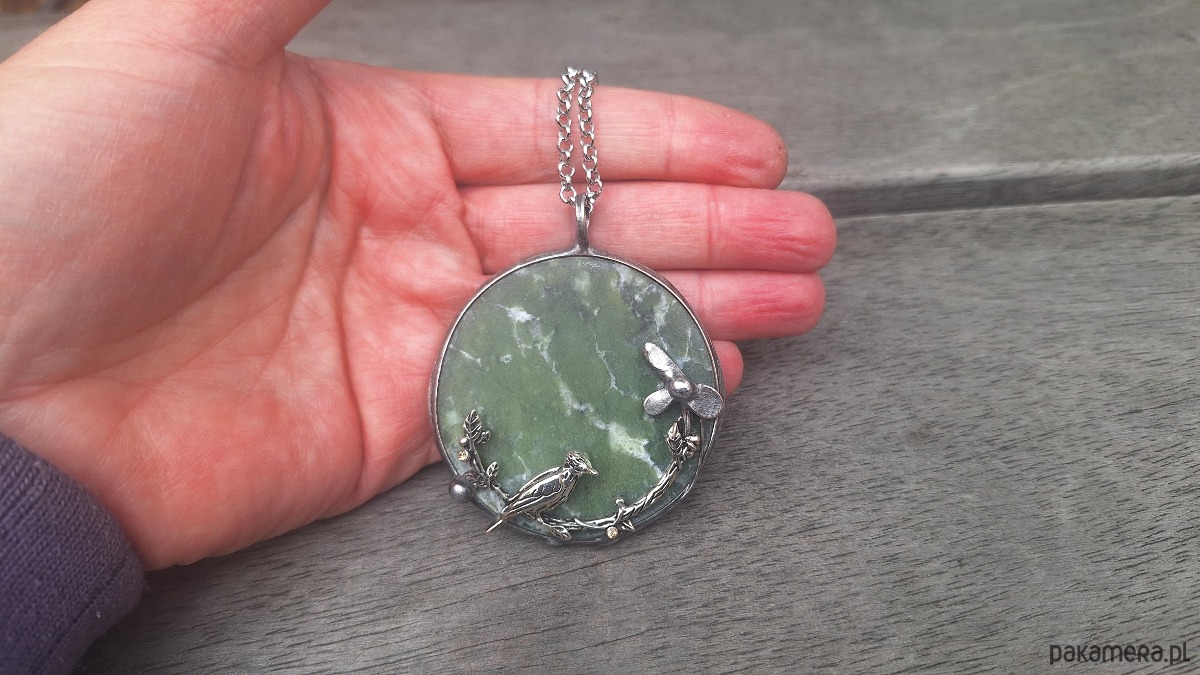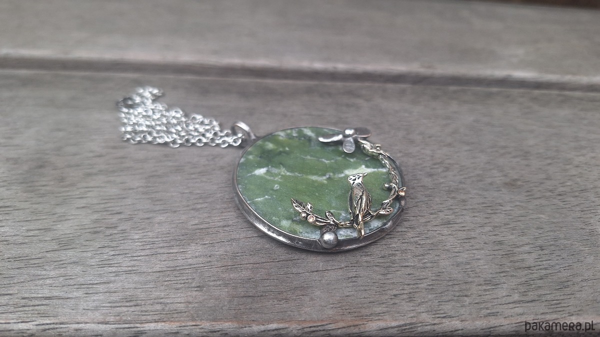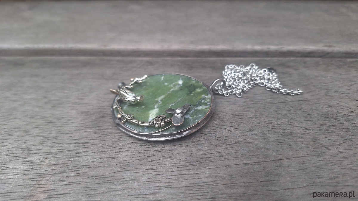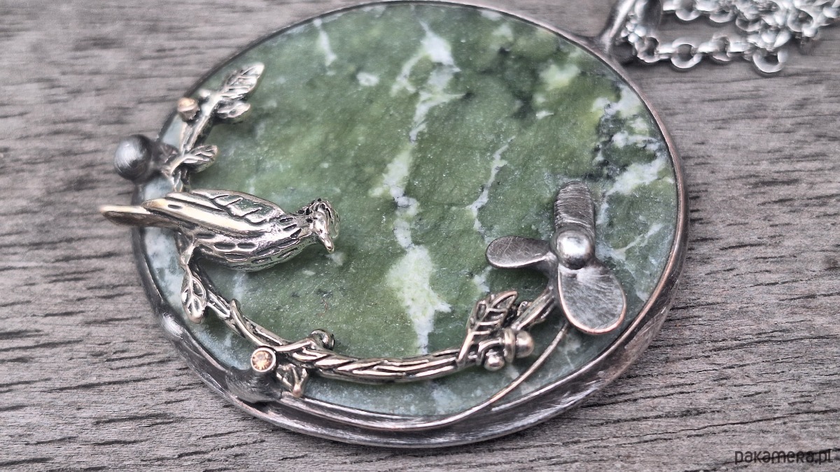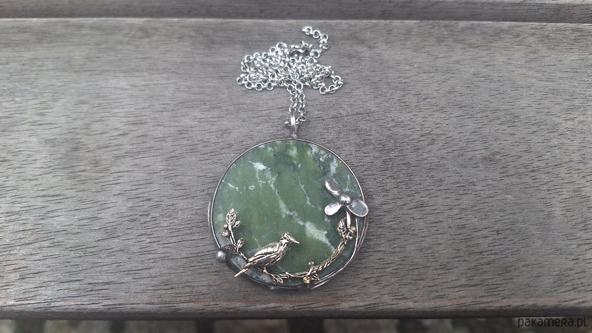 Wisiorek wykonany z miedzi, cyny i jadeitu. Wymiary ok. 5 na 5 cm. Zawieszony na łańcuszku o długości ok. 50 cm.