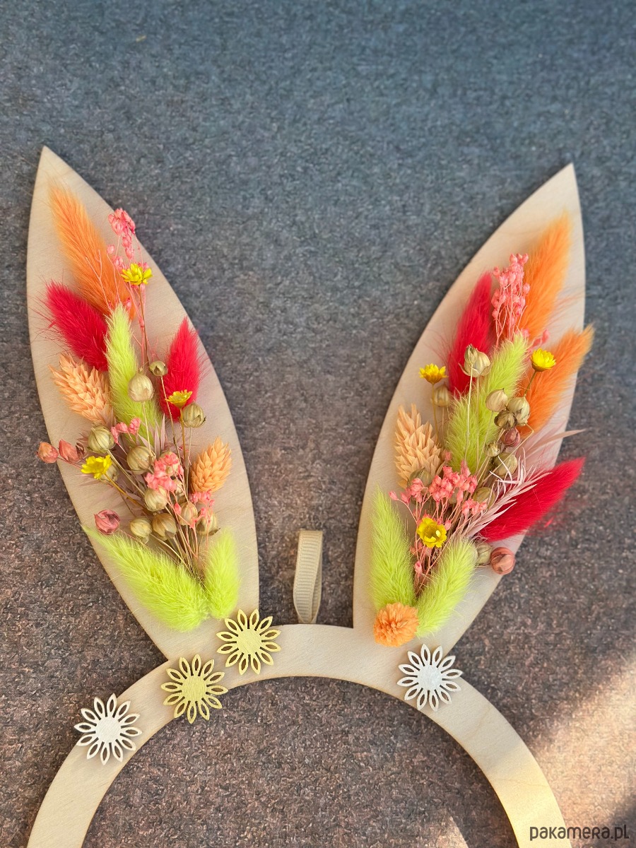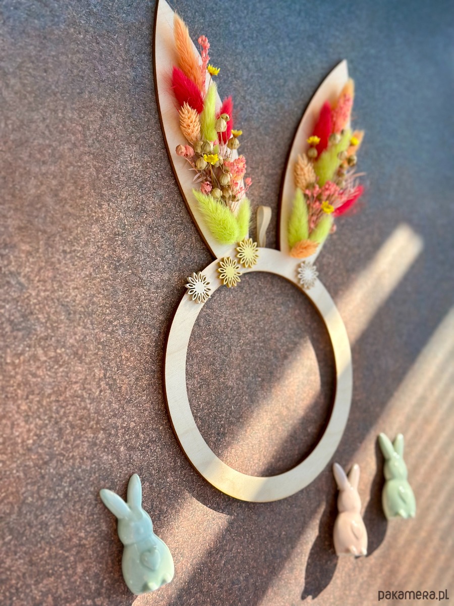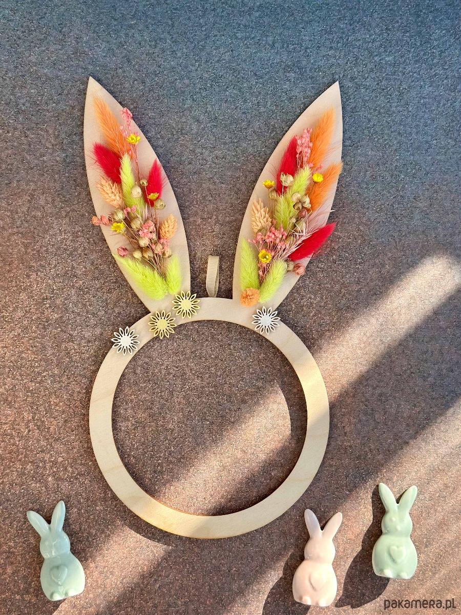 Wiosenna forma drewnianej obręczy z uszkami ozdobionymi suszonymi roślinami.