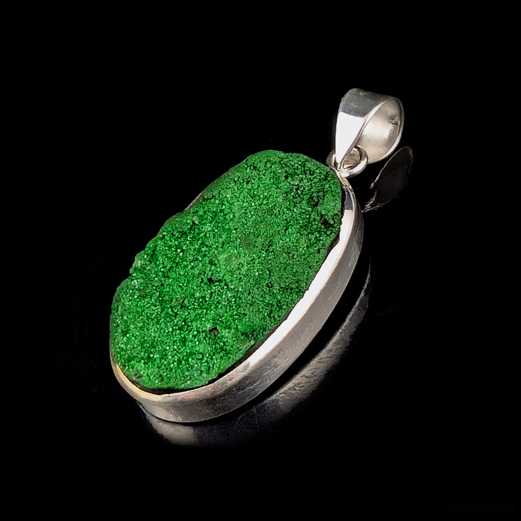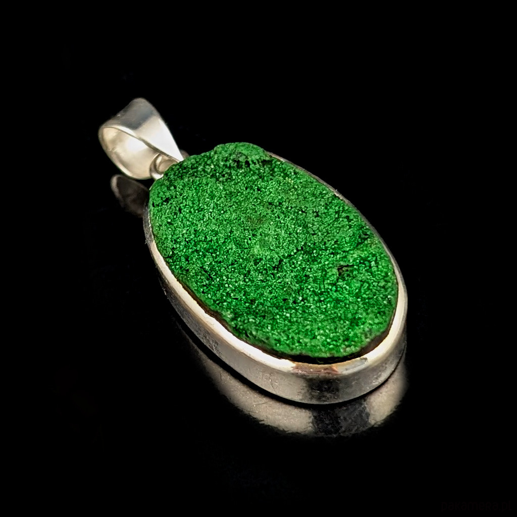 Uwarowit- unikalny i piękny, bardzo rzadko spotykany minerał, barwy szmaragdowozielonej, trawiasto- lub ciemnozielonej. Wspaniała krystaliczna struktura. Uwarowit jest zielonym granatem o zjawiskowej krystalizacji, gratką dla kolekcjonerów ze względu na coraz trudniejsze pozyskanie. Minerał oprawiony w srebro próby 925. Wymiary oprawy wisiora 33 x 20 mm, długość wraz z krawatką 45 mm. Waga wisiora 13 g. Wykonany przez dostawcę kamieni.