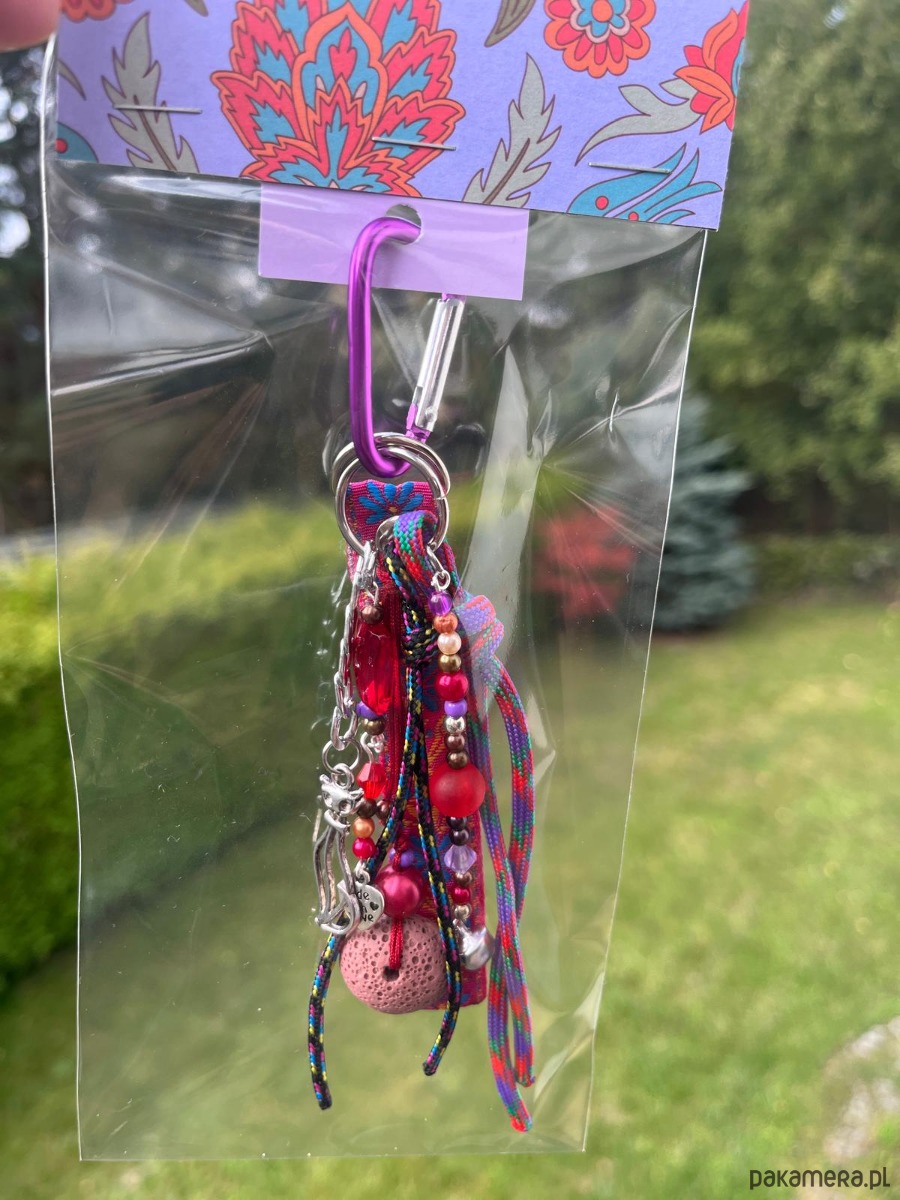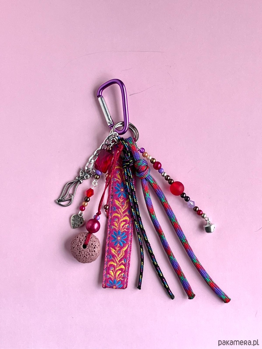 Ręcznie robiony brelok w odcieniach fioletu, fuksji i czerwieni, pełen uroku i pozytywnej energii.