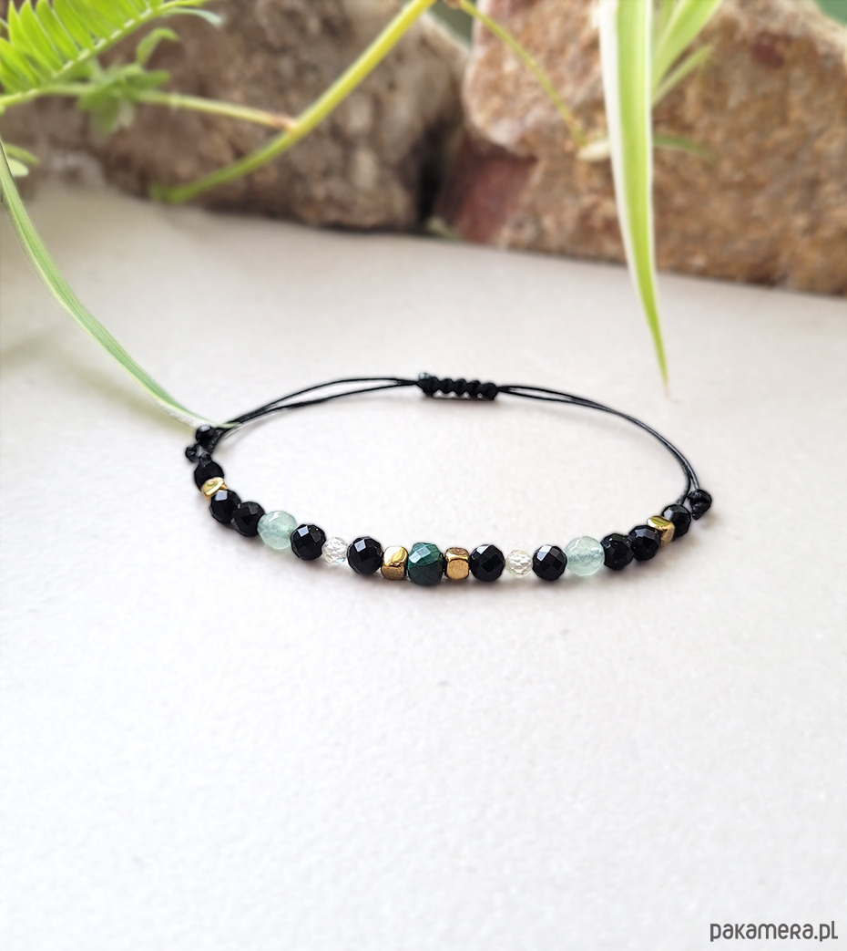 Przepiękna delikatna bransoletka zrobiona z kamieni naturalnych: Turmalinu, Malachitu naturalnego, Awenturynu, Hematytu oraz Cyrkonii.