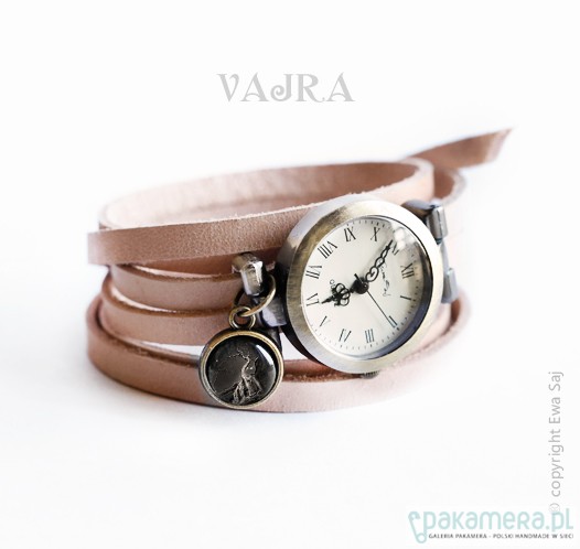 Oryginalna bransoletka - zegarek z kolekcji Vajra. Miękki skórzany rzemyk w kolorzenaturalnym szeroki na 5 mm sześciokrotnie owija nadgarstek. Zapięcie umożliwia regulację szerokości. Pasuje na nadgarstek 13-17 cm. Wielkość tarczy zegarka 25 mm, średnica charmsa 12 mm. Charms i zegarek w kolorze antycznego złota. Wolny od niklu i ołowiu - antyalergiczny. copyright Ewa Saj. All Rights Reserved.