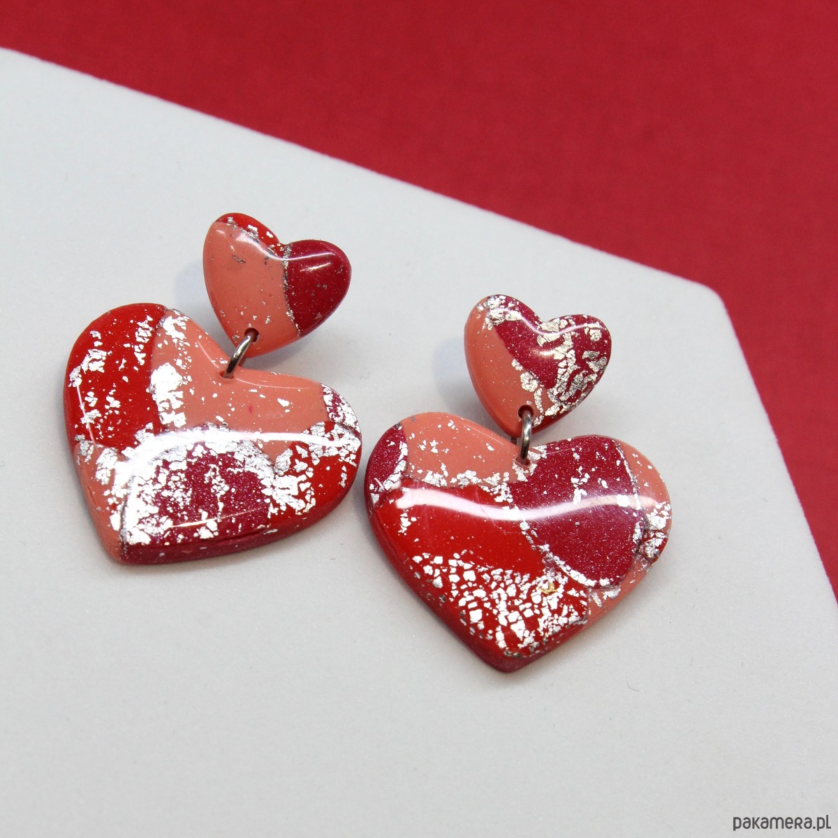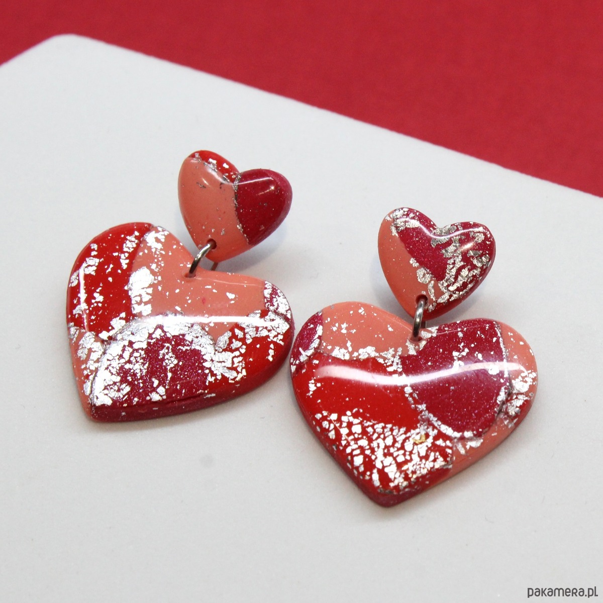 Kolczyki serca wykonane z wysokiej jakości glinki polimerowej Fimo, pokryte żywicą.