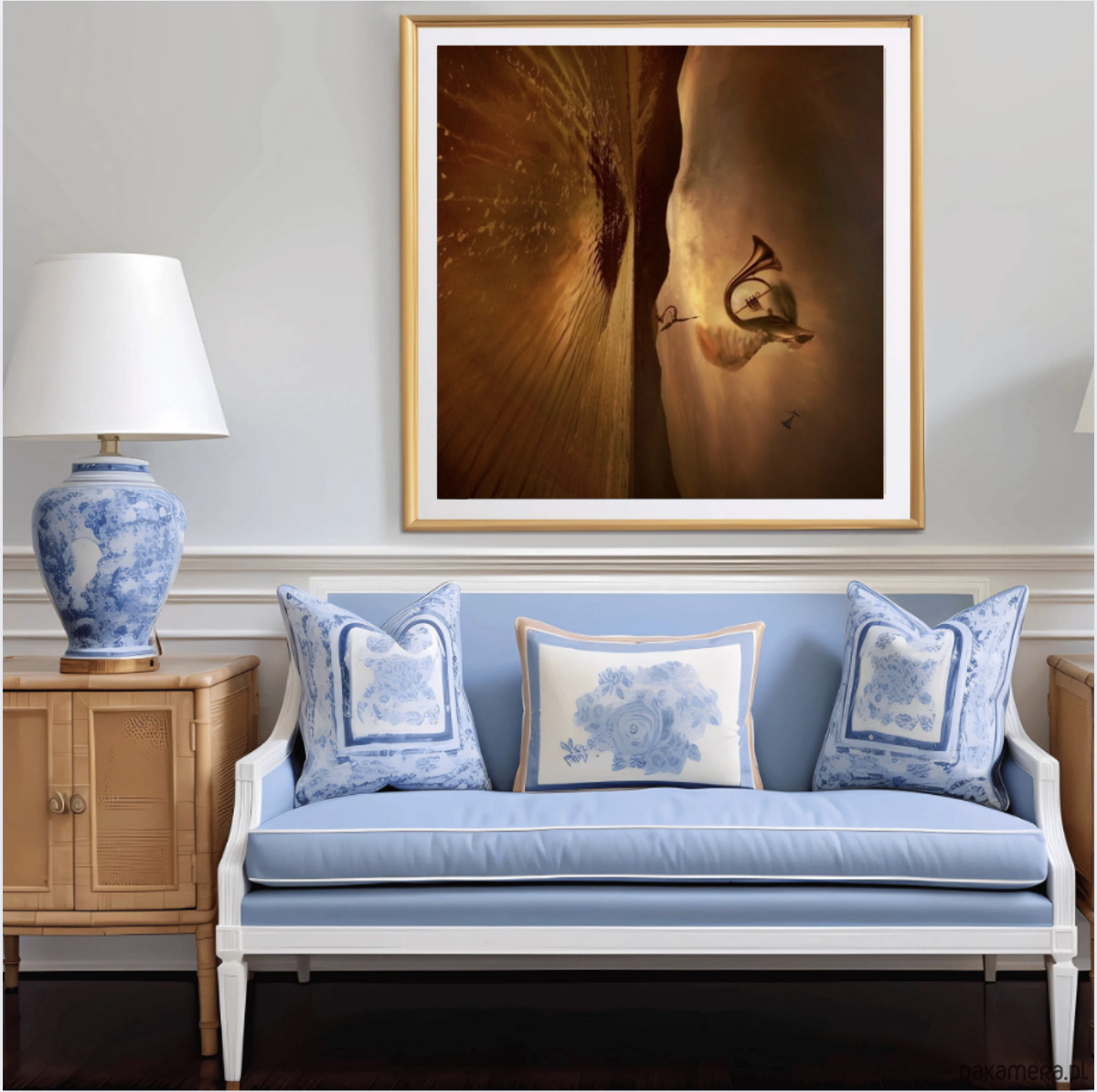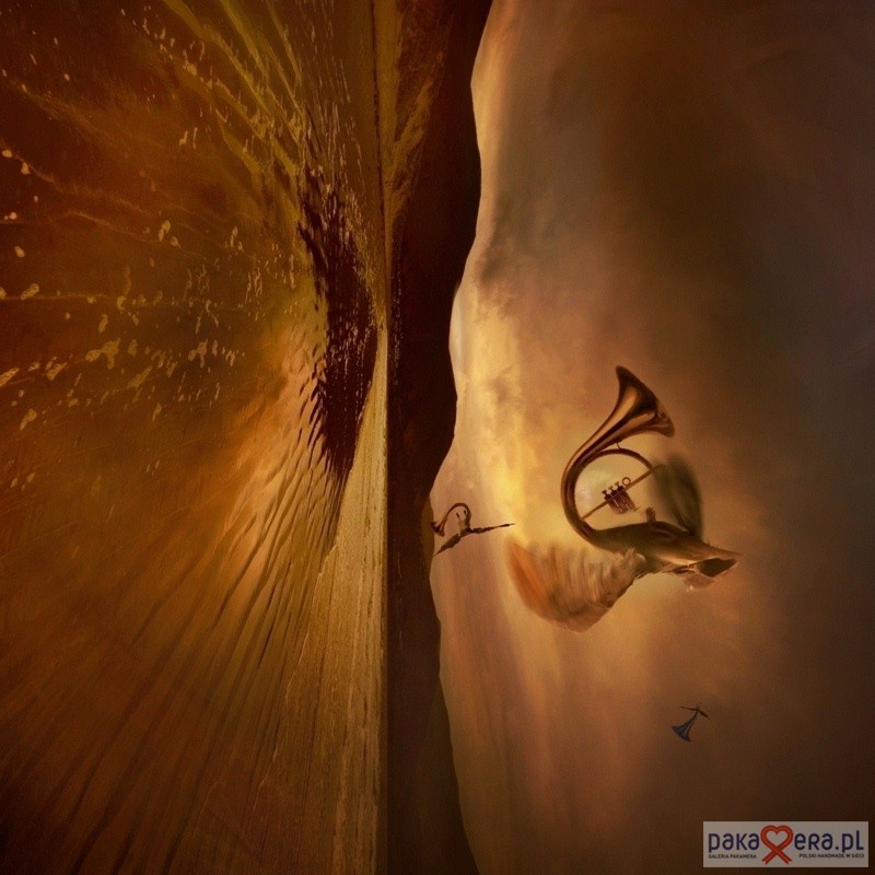 Fotomanipulacja surrealistyczna na płótnie satynowanym 60x60 cm, gotowa do zawieszenia na ścianie -naciągnięta na solidny blejtram i utrwalona werniksem (mat lub piękny pół połysk satynowy), co daje dodatkowe zabezpieczenie przed urazami zewnętrznymi. Werniks w bardzo elegancki sposób wydobywa fakturę płótna, a pół połysk dodatkowo ożywia kolory. Dzięki werniksowi można obraz od czasu do czasu delikatnie przetrzeć na sucho z kurzu.