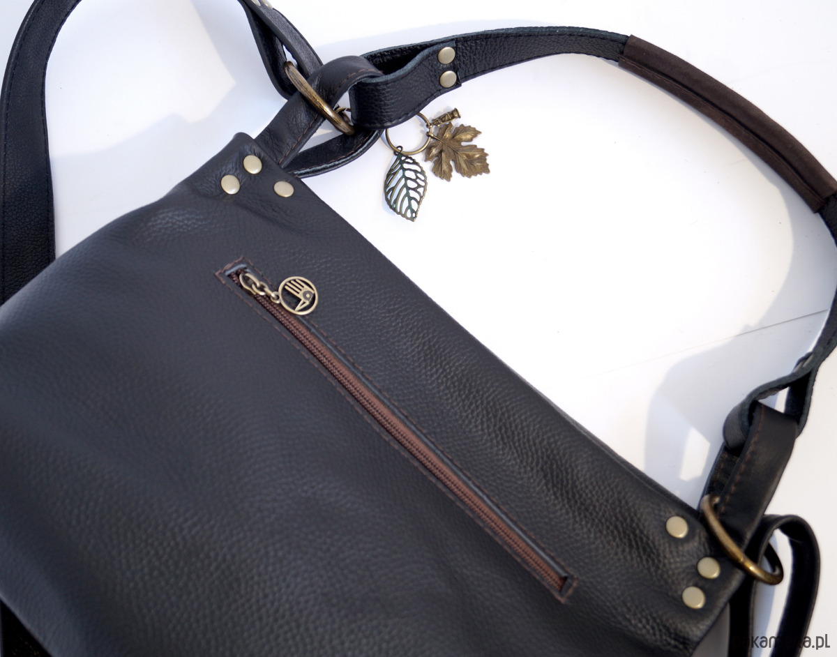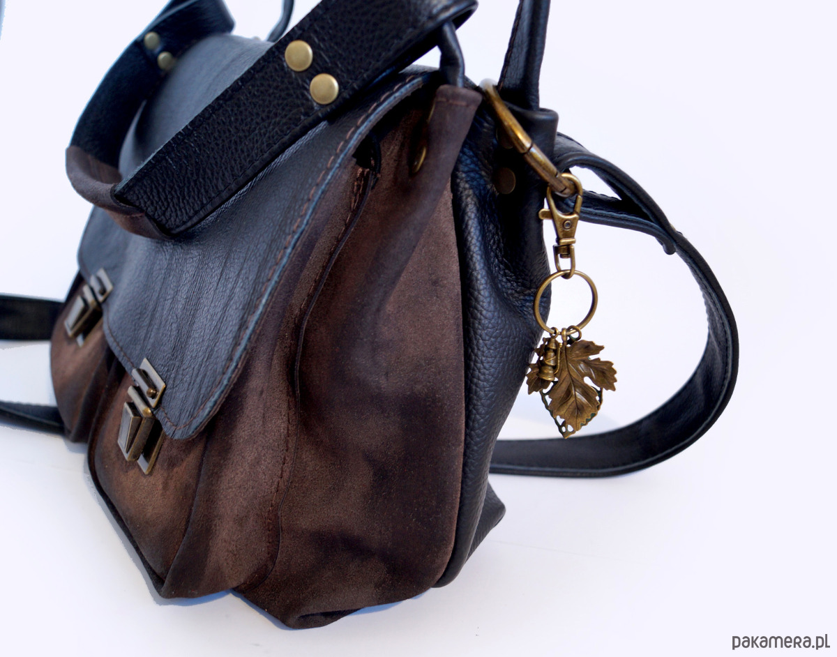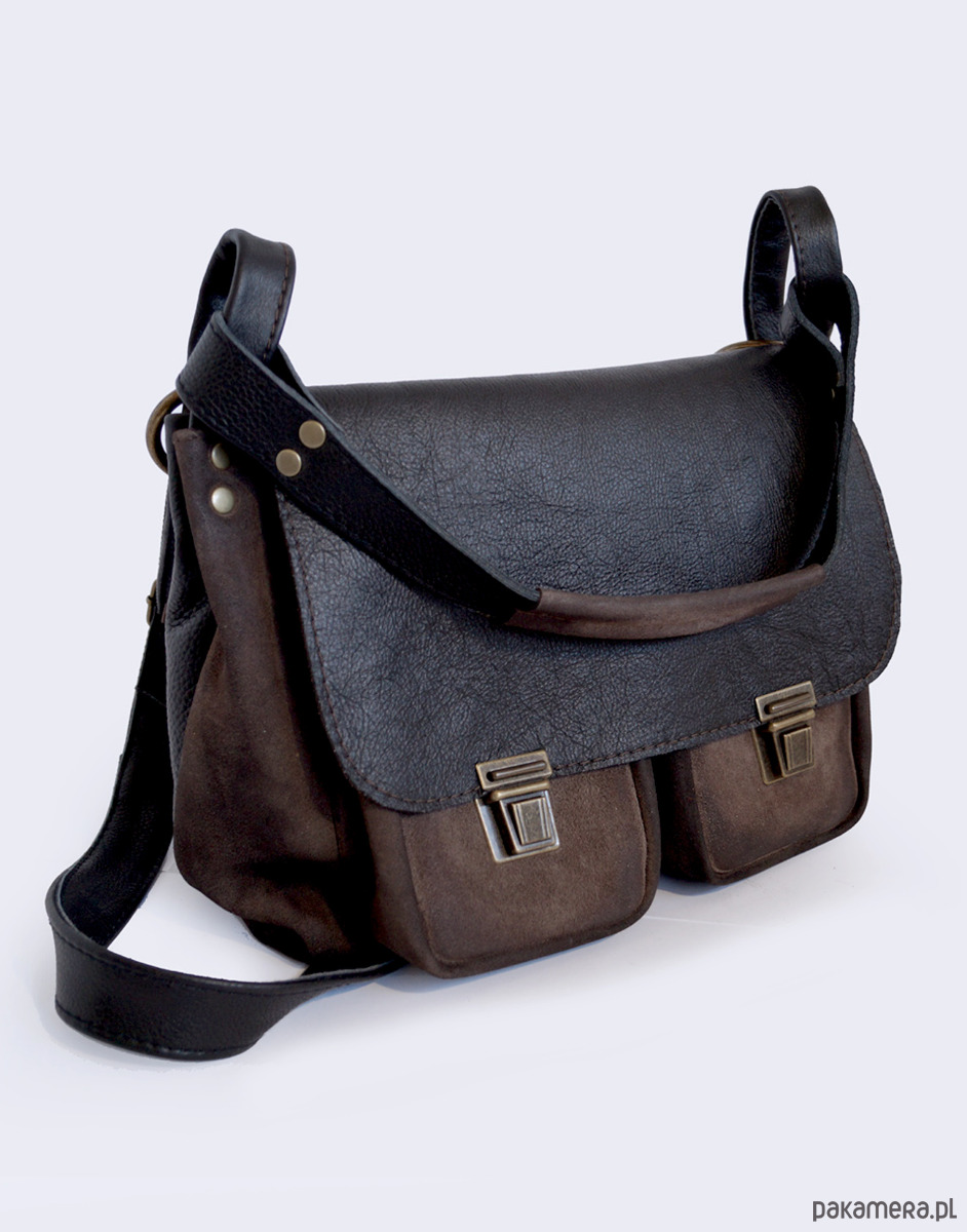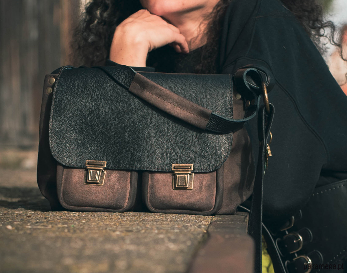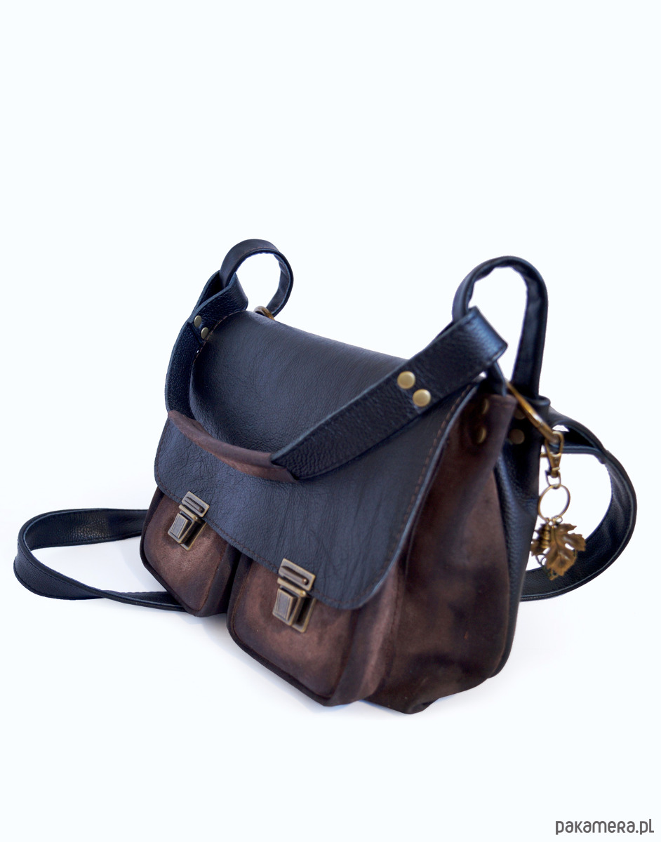 Torebka ewidentnie przykuwający spojrzenia. Uszyta ze świetnej jakości, pięknych skór naturalnych licowych i zamszowych. Część elementów zamszowych pokryta jest specjalną „patyną” dzięki której wygląda na postarzoną (wyświechtaną). Dwie duże, zewnętrzne kieszenie, przykryte są klapami z zatrzaskiem magnetycznym.