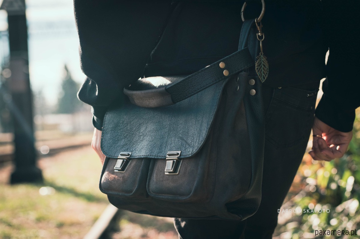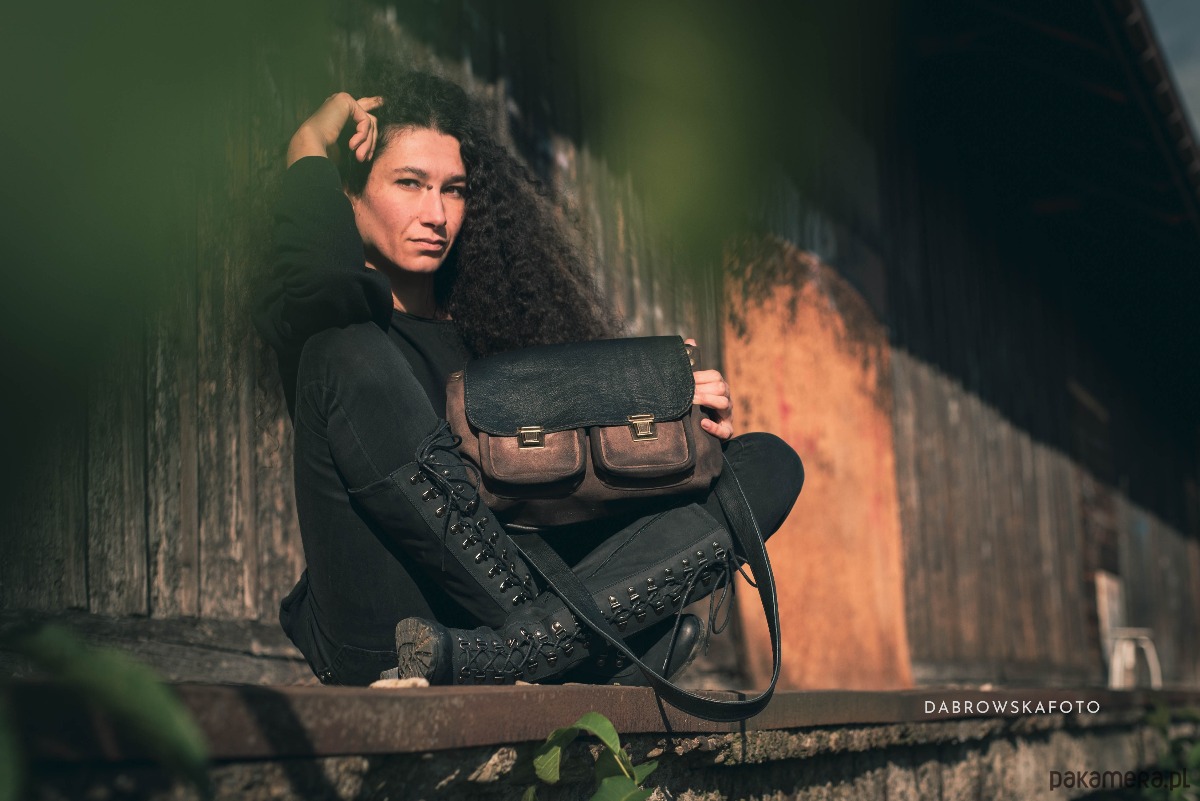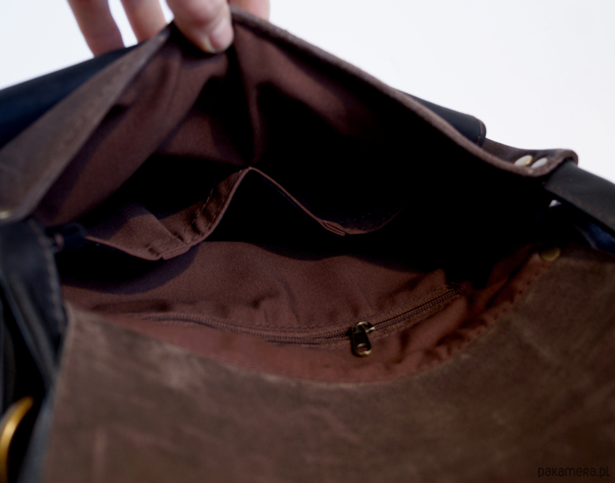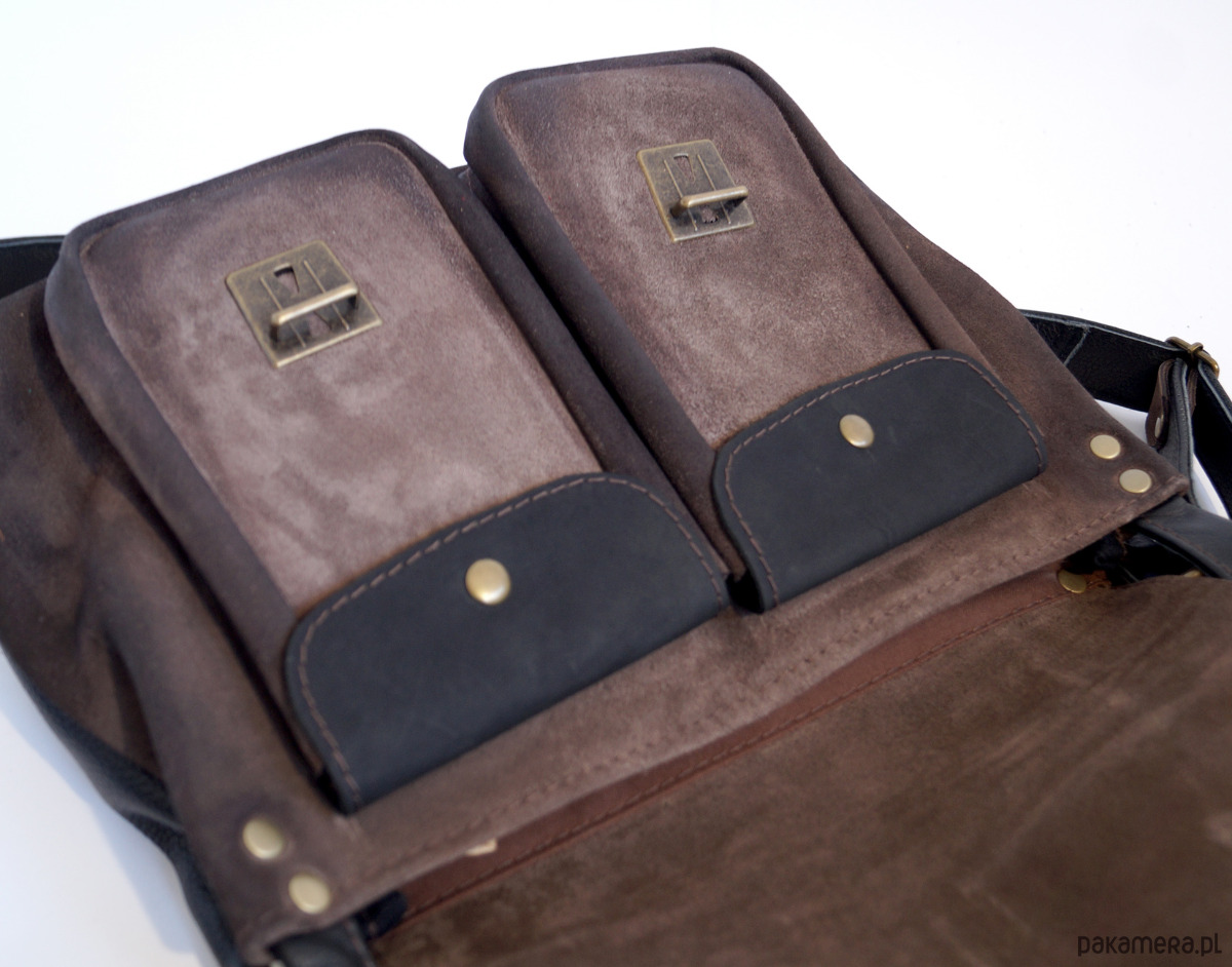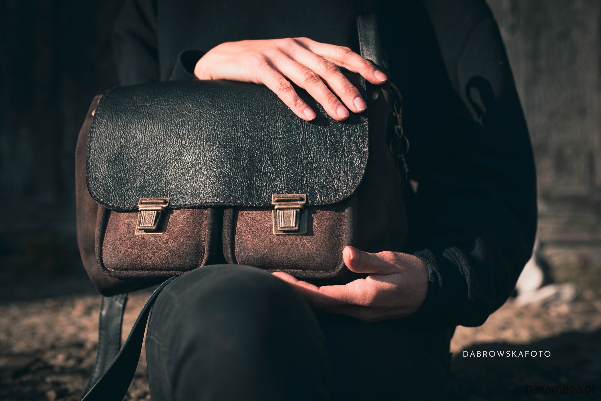 Torebka ewidentnie przykuwający spojrzenia. Uszyta ze świetnej jakości, pięknych skór naturalnych licowych i zamszowych. Część elementów zamszowych pokryta jest specjalną „patyną” dzięki której wygląda na postarzoną (wyświechtaną). Dwie duże, zewnętrzne kieszenie, przykryte są klapami z zatrzaskiem magnetycznym.
