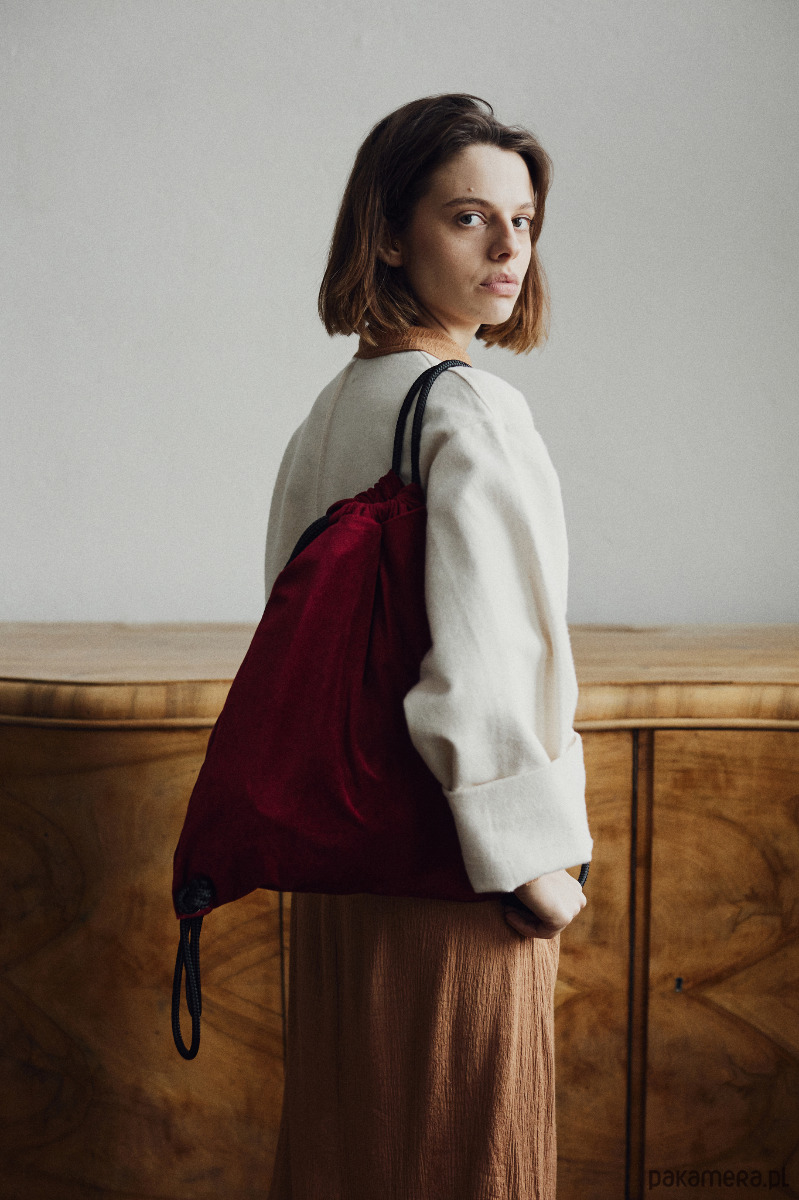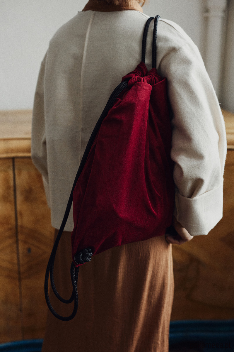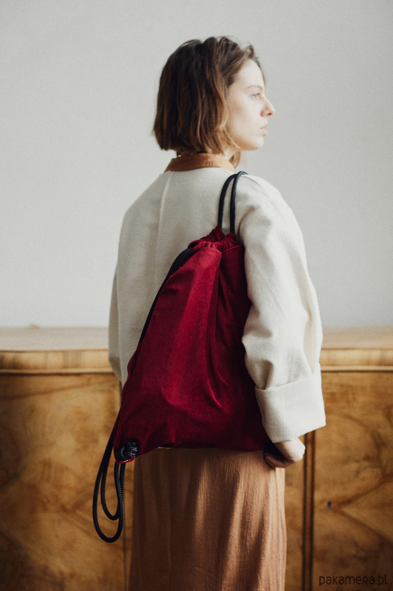 Niezwykły plecak w formie worka w kolorze głębokiej czerwieni. Pasuje do wielu stylizacji.