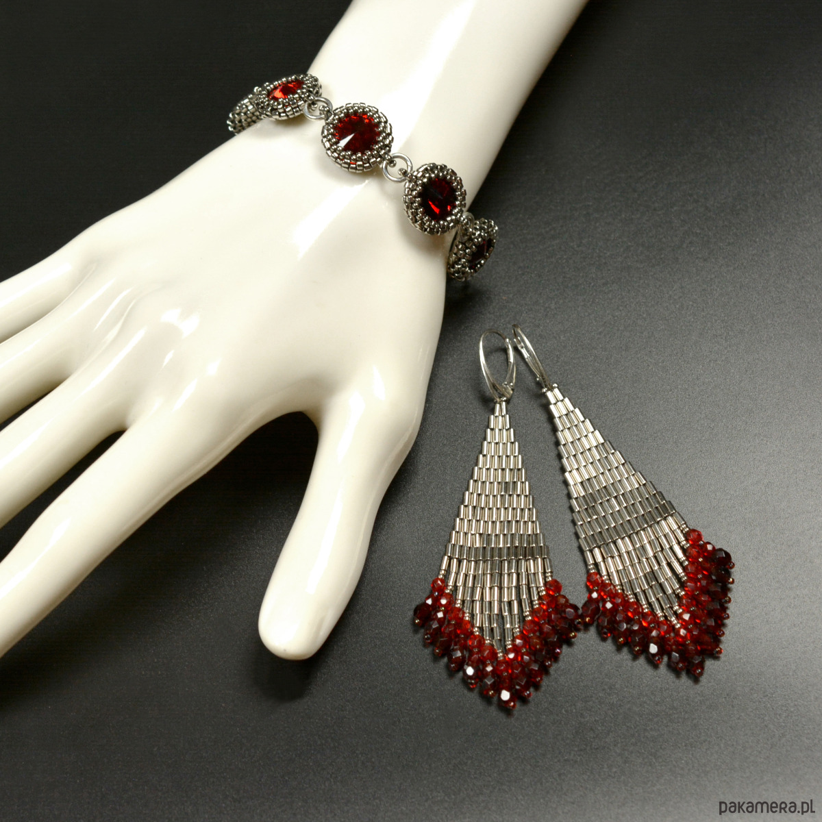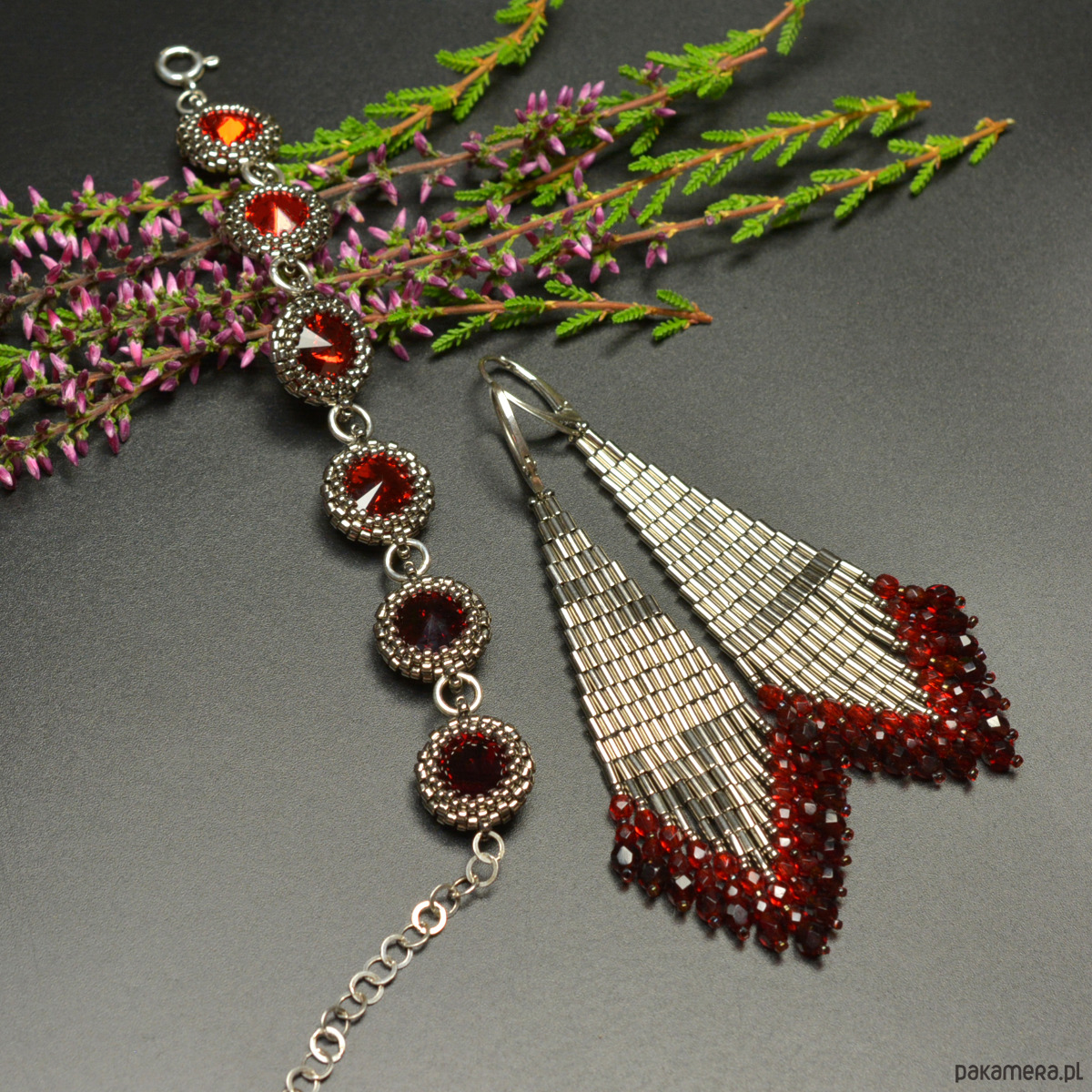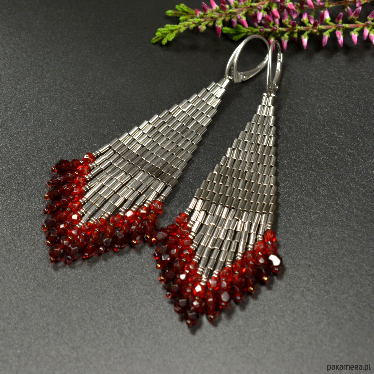 Wyplotłam je z najwyższej jakości japońskich koralików Toho w kolorze starego srebra z dodatkiem czerwieni, dodatkowo we frędzle wplotłam fasetowane czeskie kryształki fire polish w trzech odcieniach czerwieni.