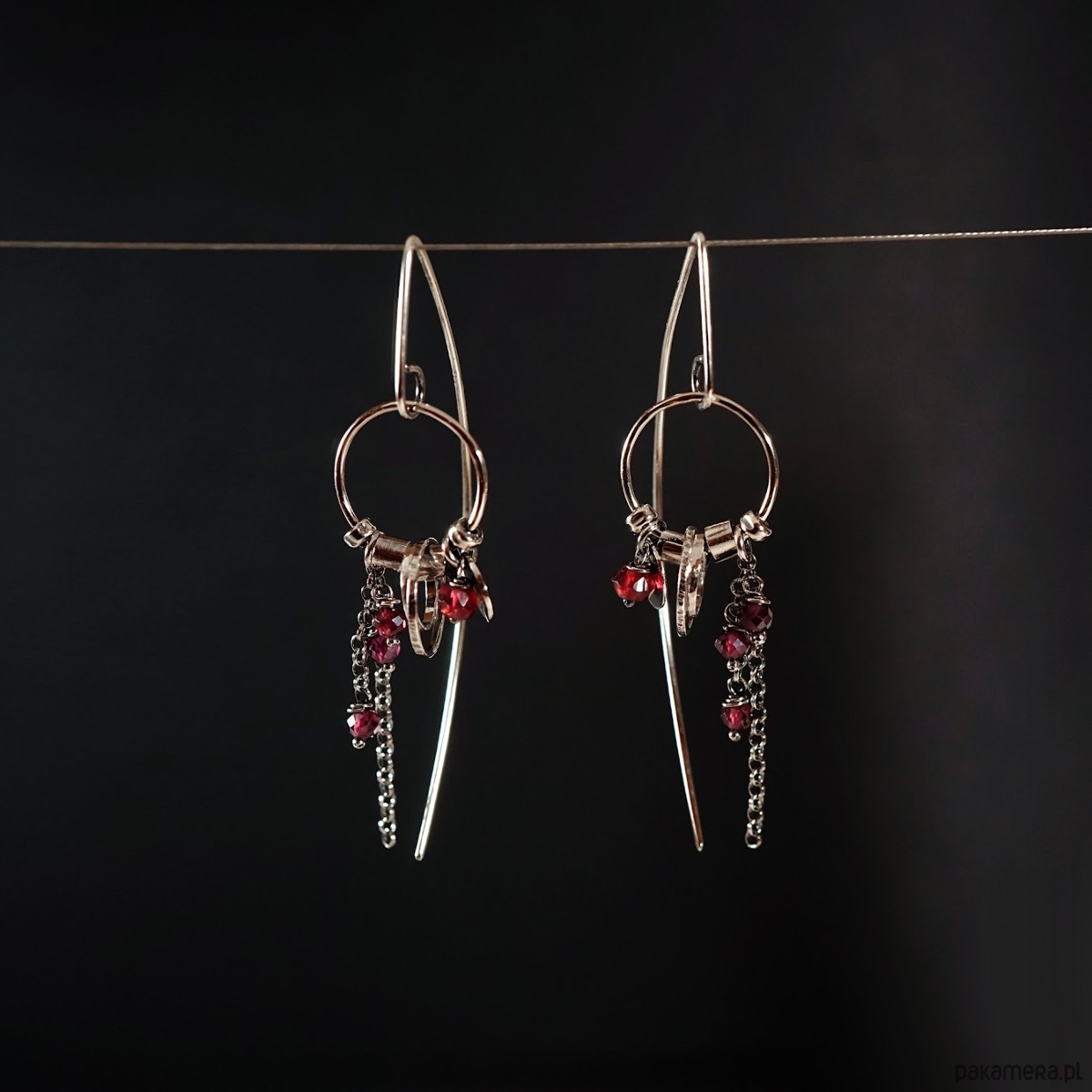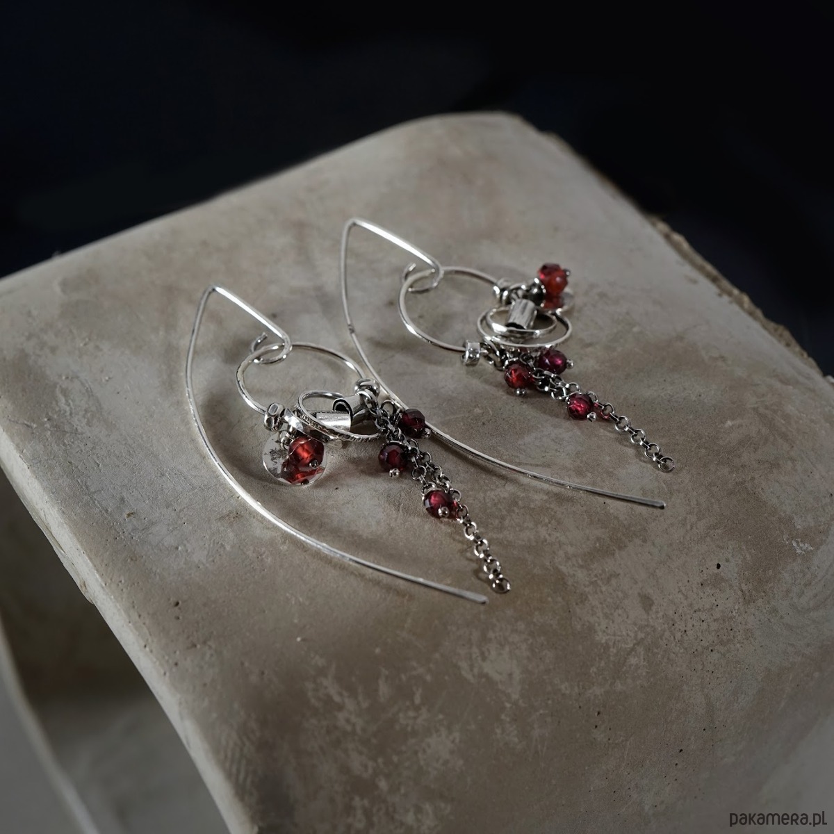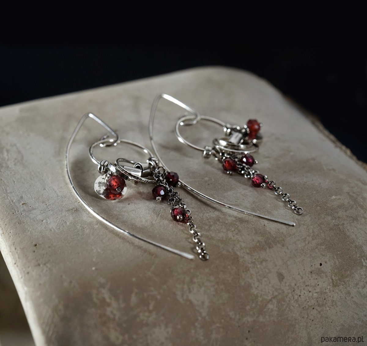 Srebrne kolczyki (srebro 925) z granatami. Srebro oksydowane i polerowane.