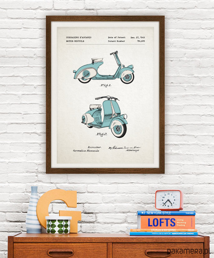Plakat z reprodukcją patentu na skuter Vespa, zaprojektowany przez Corradino D'Ascanio. Patent o numerze 156,609 został udzielony w 1949 roku przez Urząd Patentów i Znaków Towarowych Stanów Zjednoczonych.