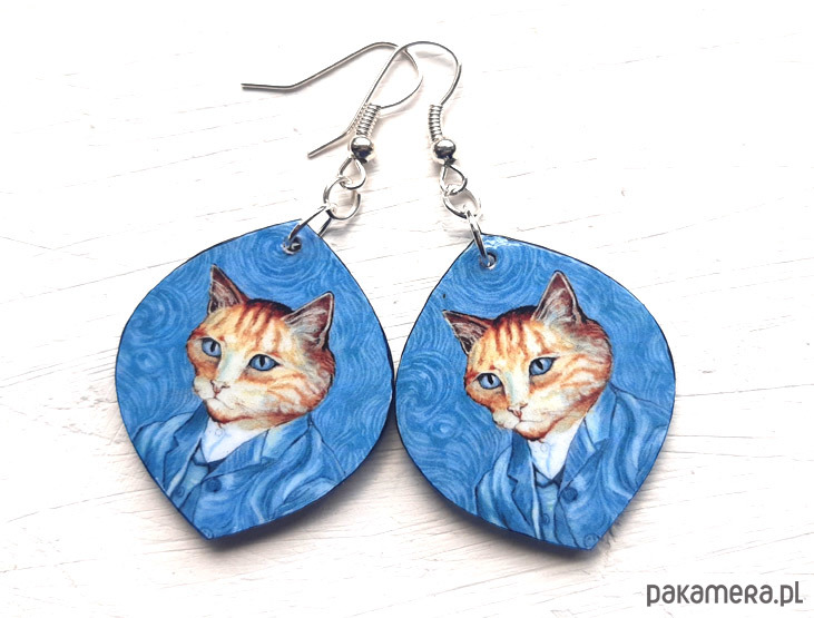 kolczyki drewniane, ozdobione metodą decoupage, dwustronne, starannie wykończone farbami akrylowymi i zabezpieczone wielokrotnie lakierem, bigle posrebrzane, długość kolczyków bez bigli: 4 cm, szerokość: 3 cm, bardzo lekkie