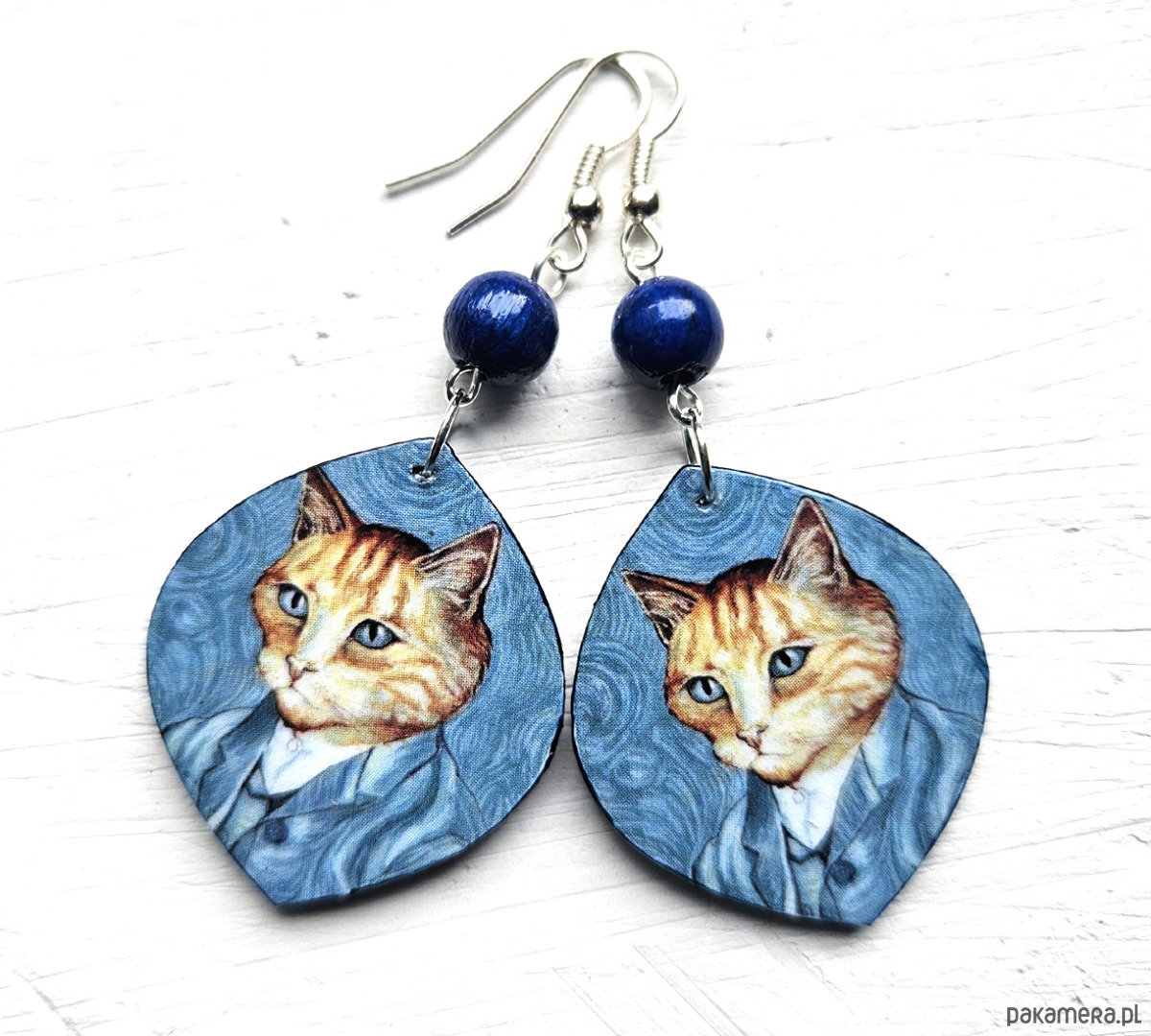 kolczyki drewniane, ozdobione metodą decoupage, dwustronne, starannie wykończone farbami akrylowymi i zabezpieczone wielokrotnie lakierem, bigle posrebrzane, długość kolczyków bez bigli: 4,5 cm, szerokość: 3 cm, bardzo lekkie