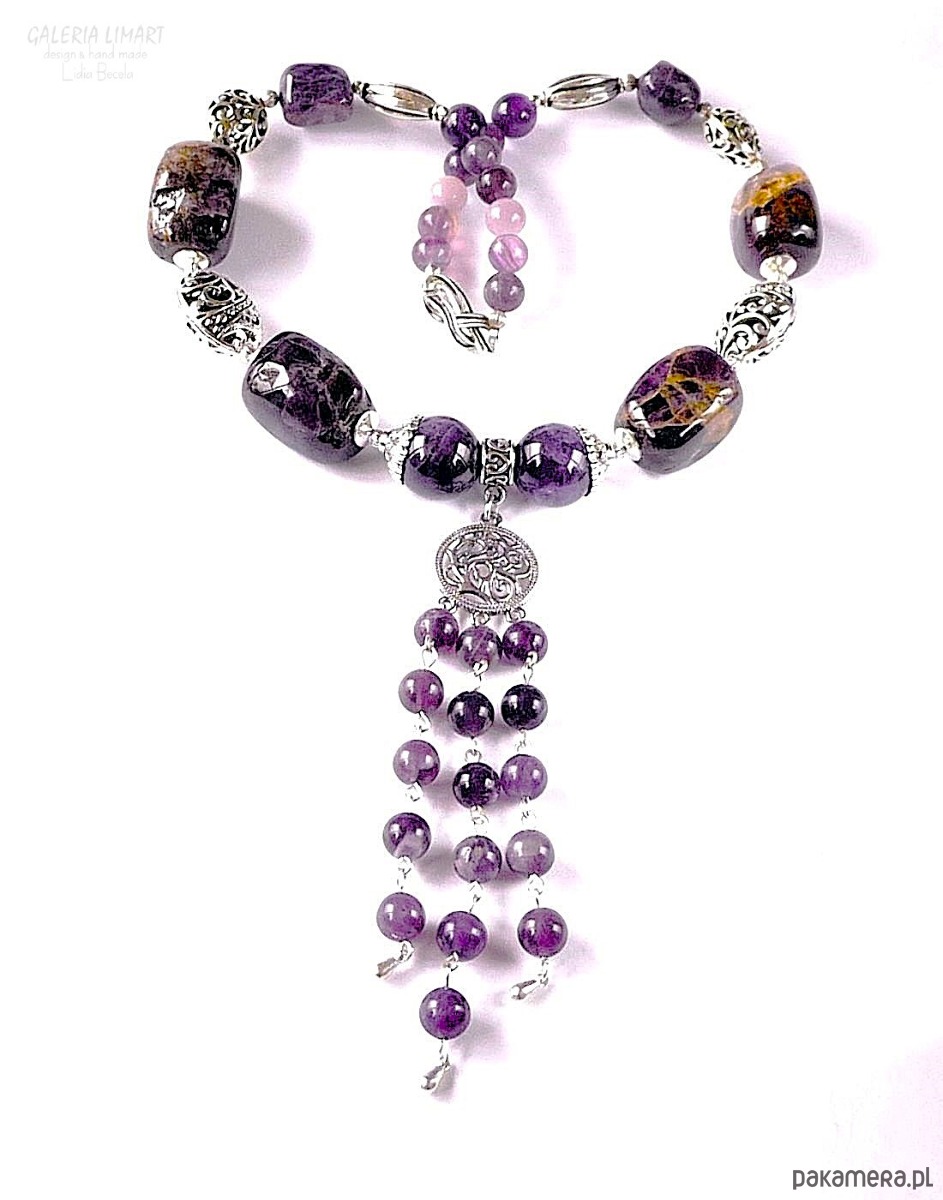 Moja elegancka i efektowna, kompozycja naszyjnika z naturalnych ametystów i etnicznych elementów ozdobnych typu bali.