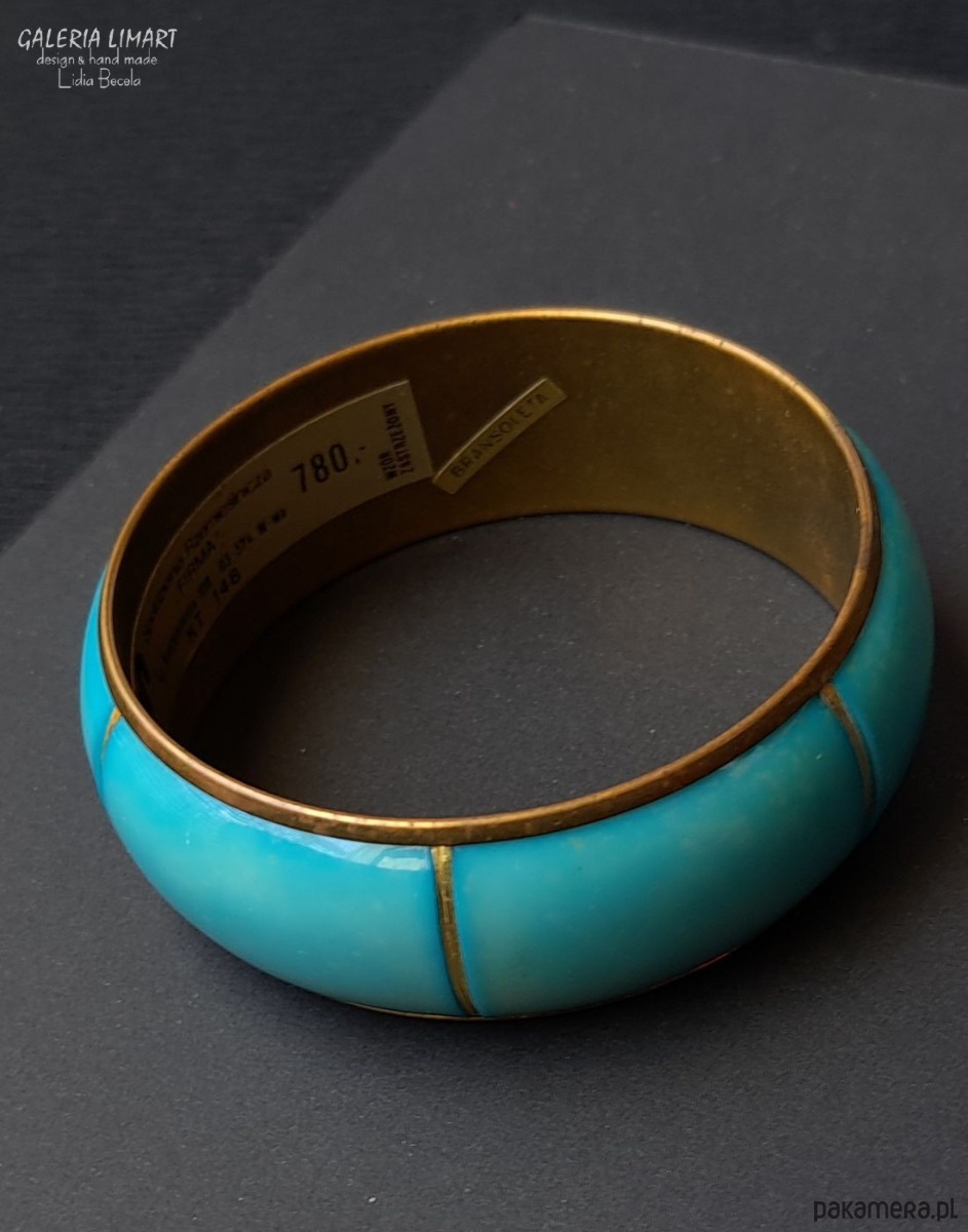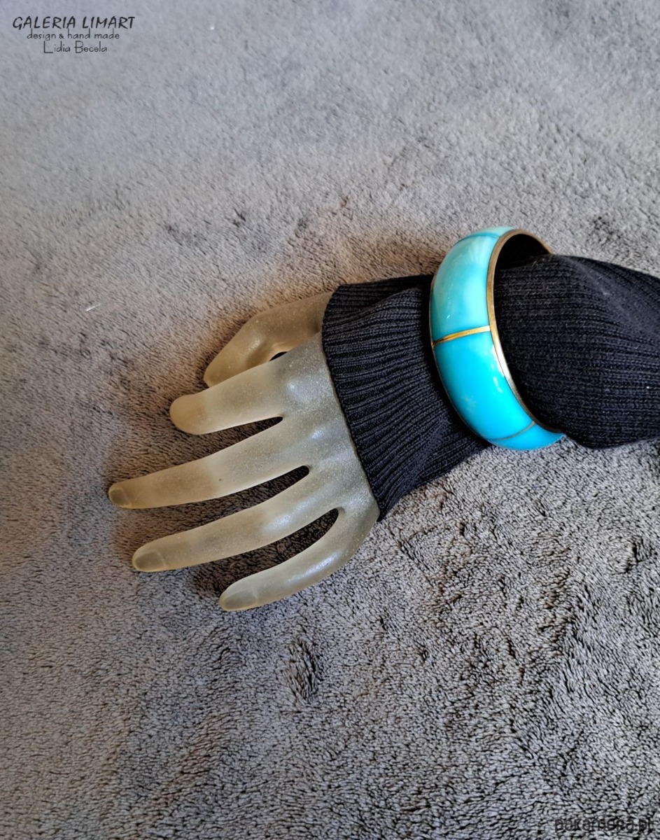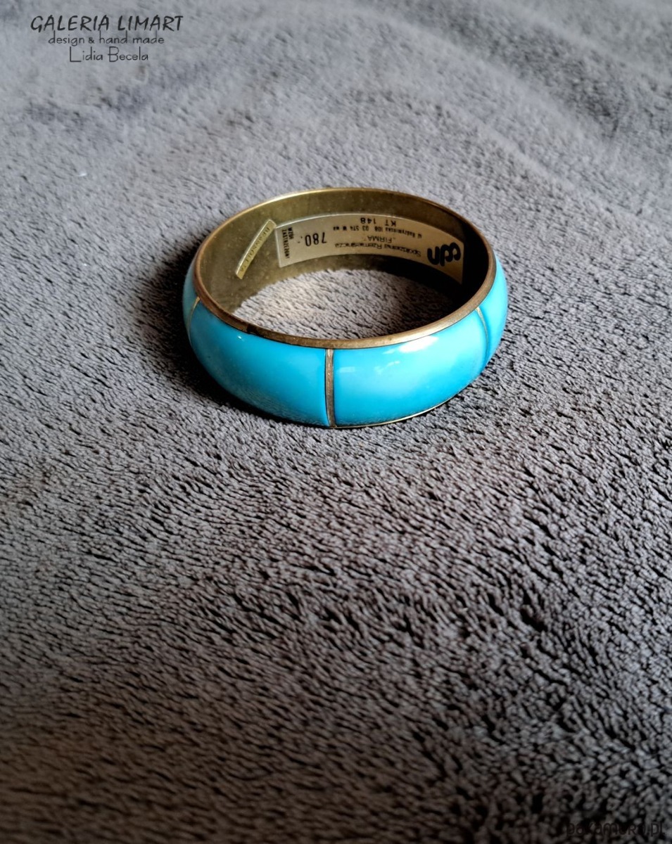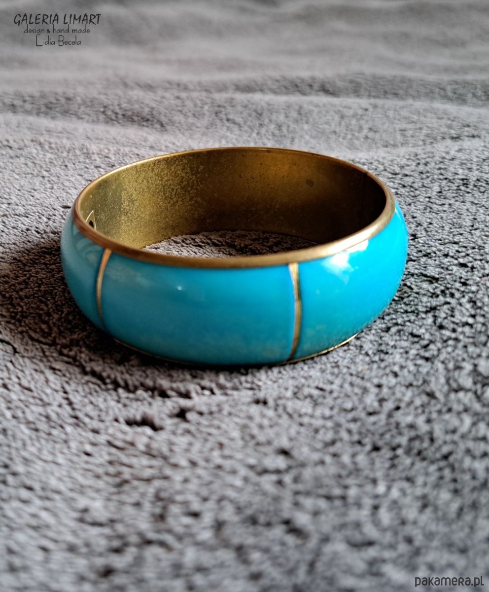 Urocza stara bransoletka z mosiądzu i żywicy w turkusowym kolorze w kształcie obręczy o średni ok. 6,6 cm. Taki uroczy drobiazg biżuteryjny w modnym ostatnio stylu vintage.