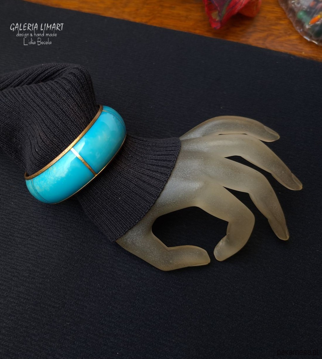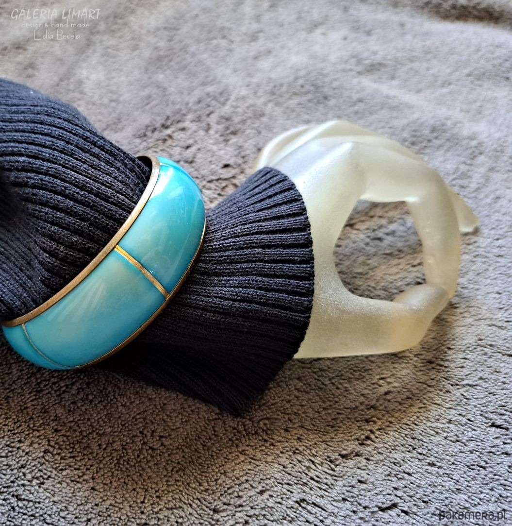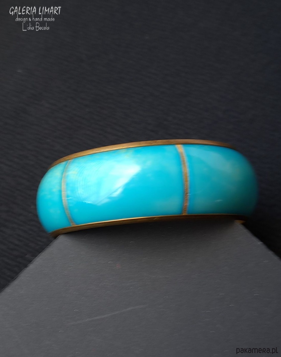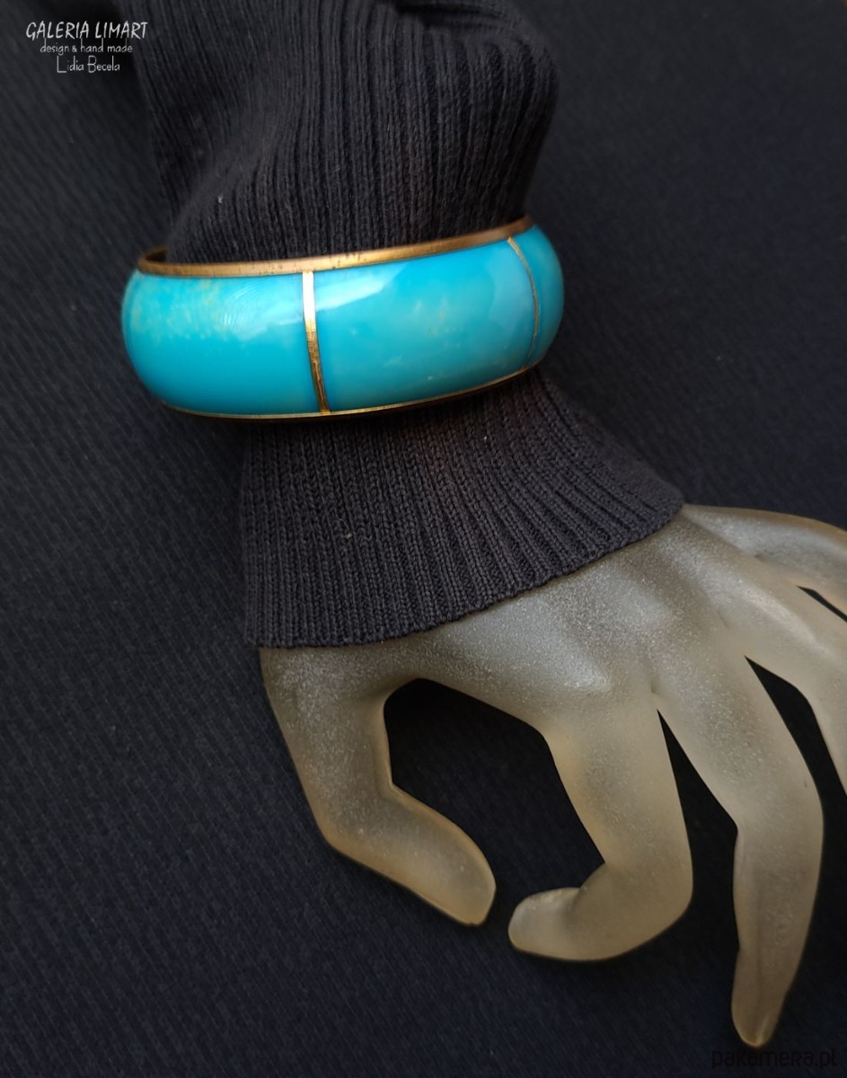 Urocza stara bransoletka z mosiądzu i żywicy w turkusowym kolorze w kształcie obręczy o średni ok. 6,6 cm. Taki uroczy drobiazg biżuteryjny w modnym ostatnio stylu vintage.