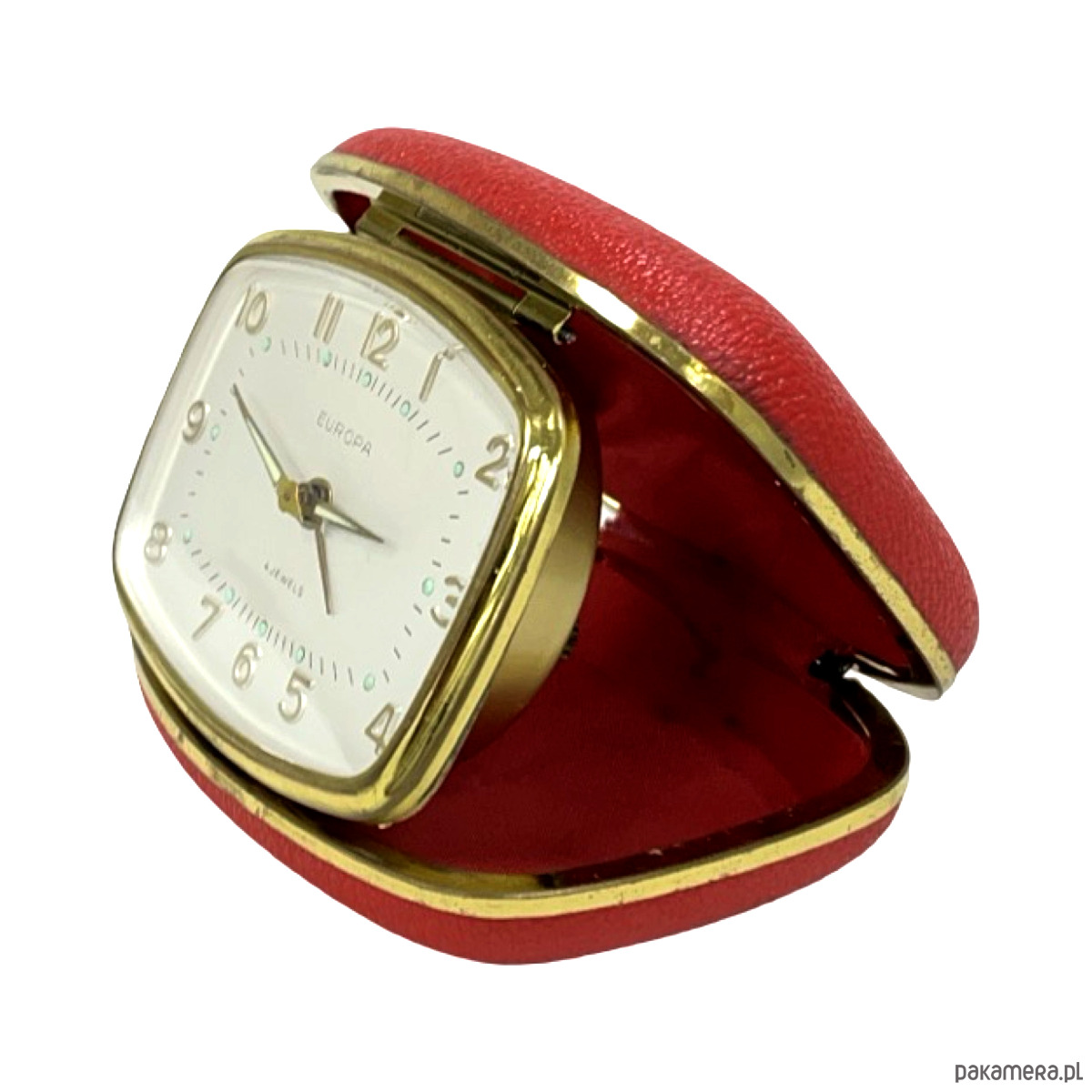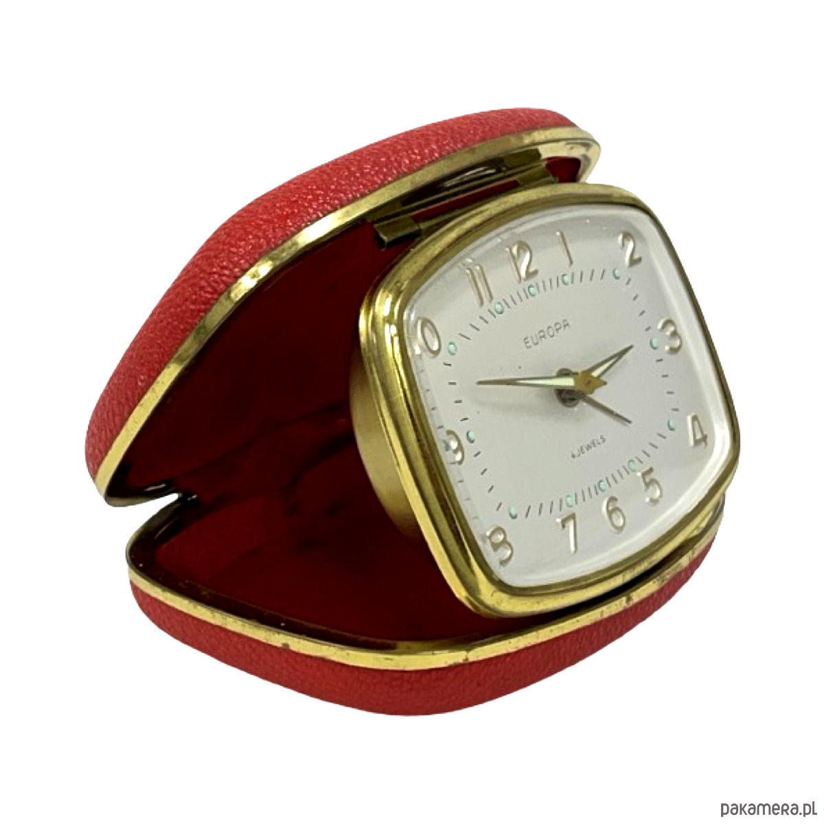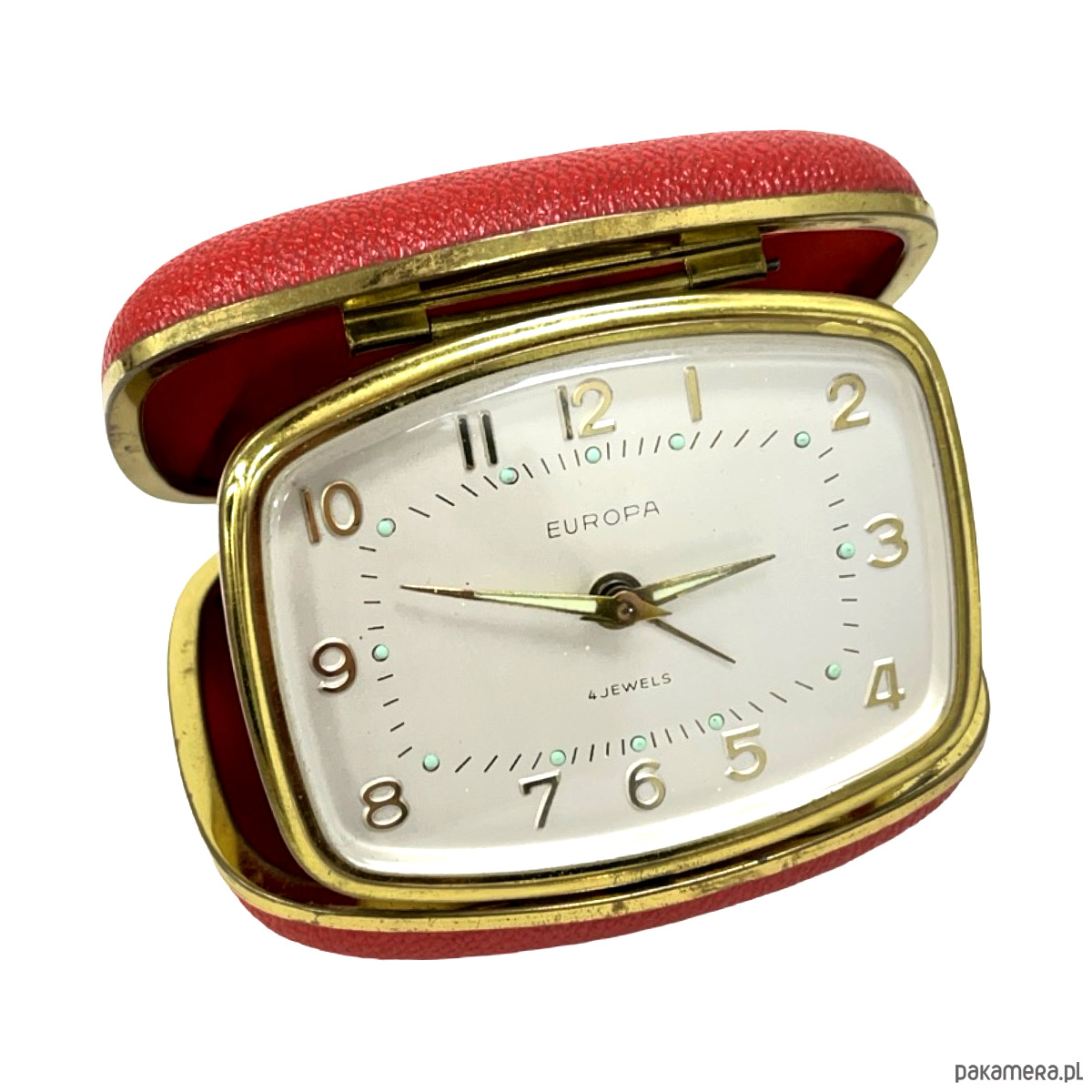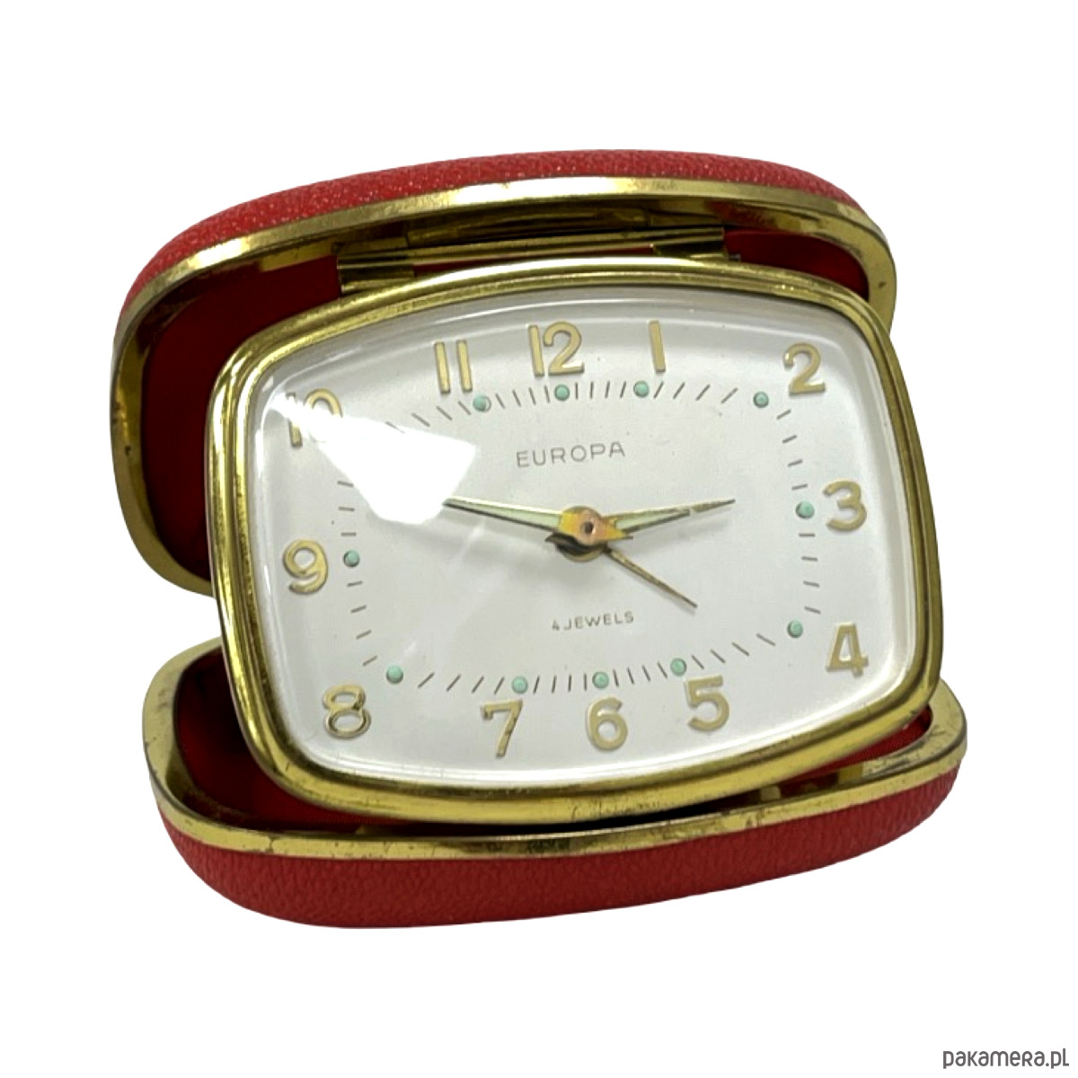 Vintage budzik, podróżny, EUROPA, lata 60, mechaniczny, 4 Jewels, retro designOryginalny budzik podróżny marki EUROPA, produkcja europejska, datowany na lata 60.–70. XX wieku. Klasyczny przykład wzornictwa retro z epoki mid-century, łączący elegancką formę z praktycznym, składanym etui podróżnym.