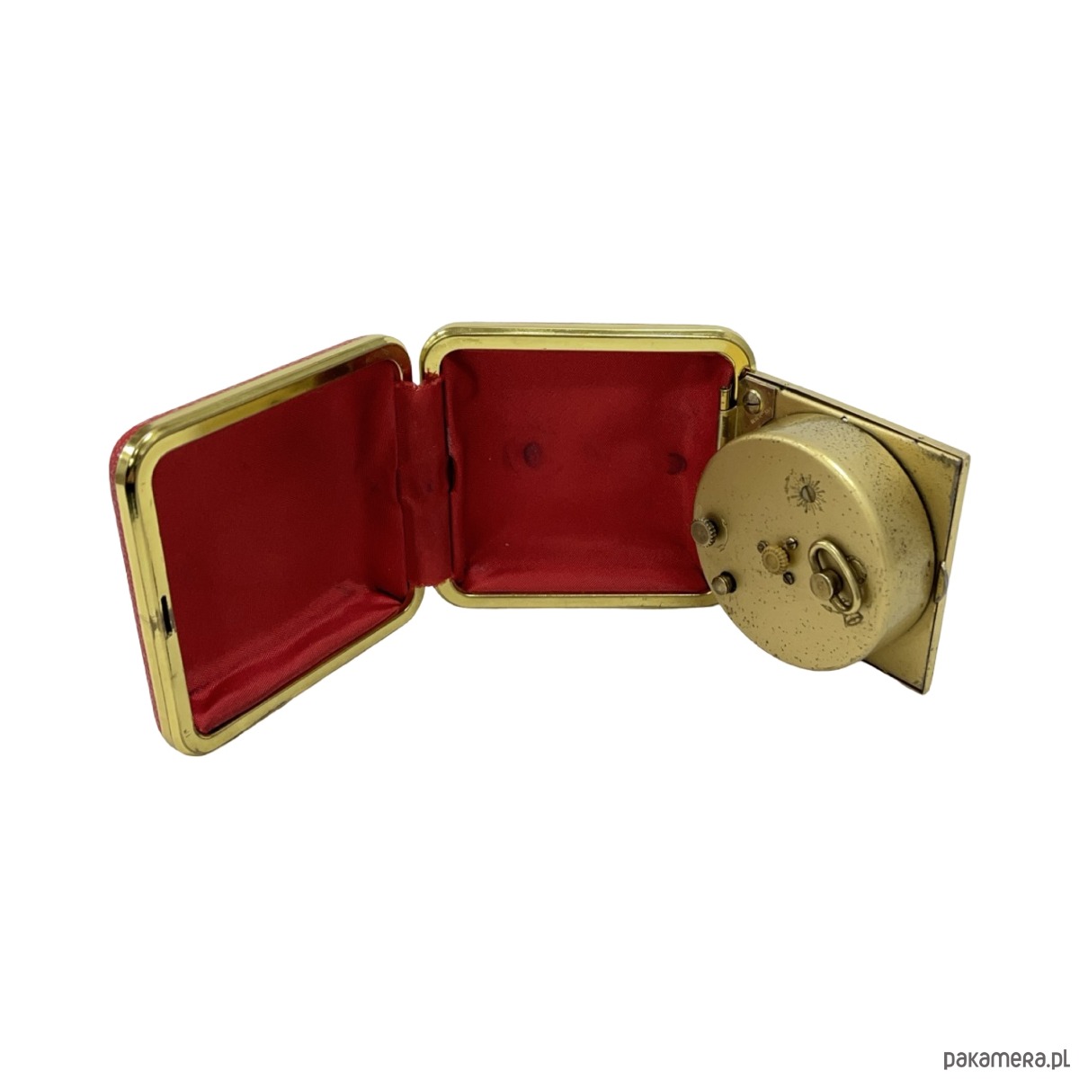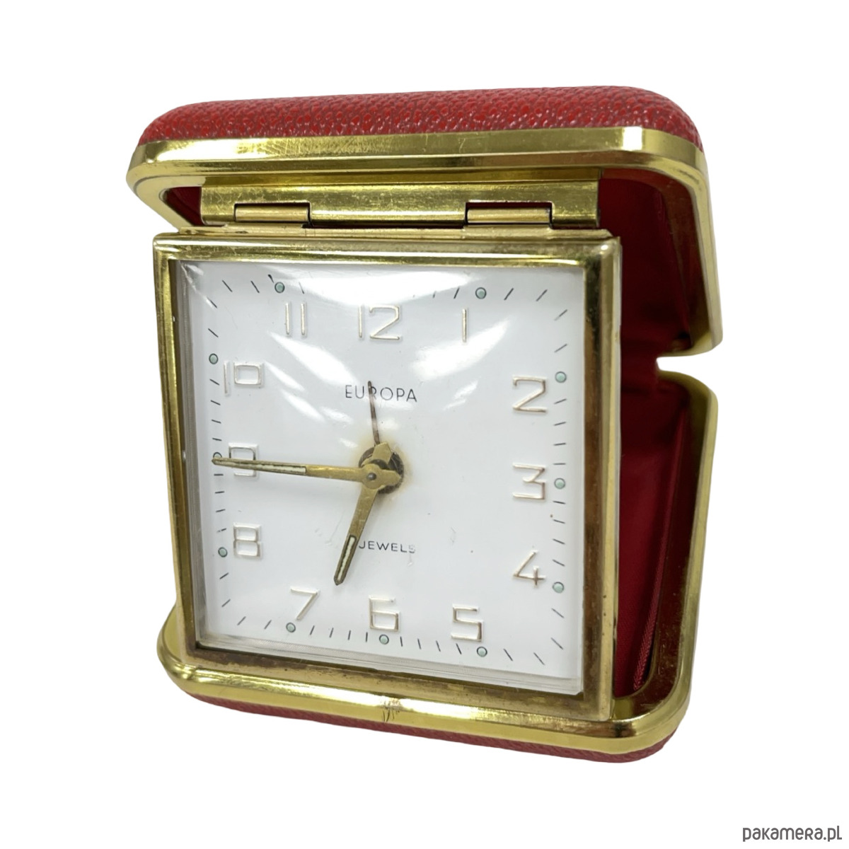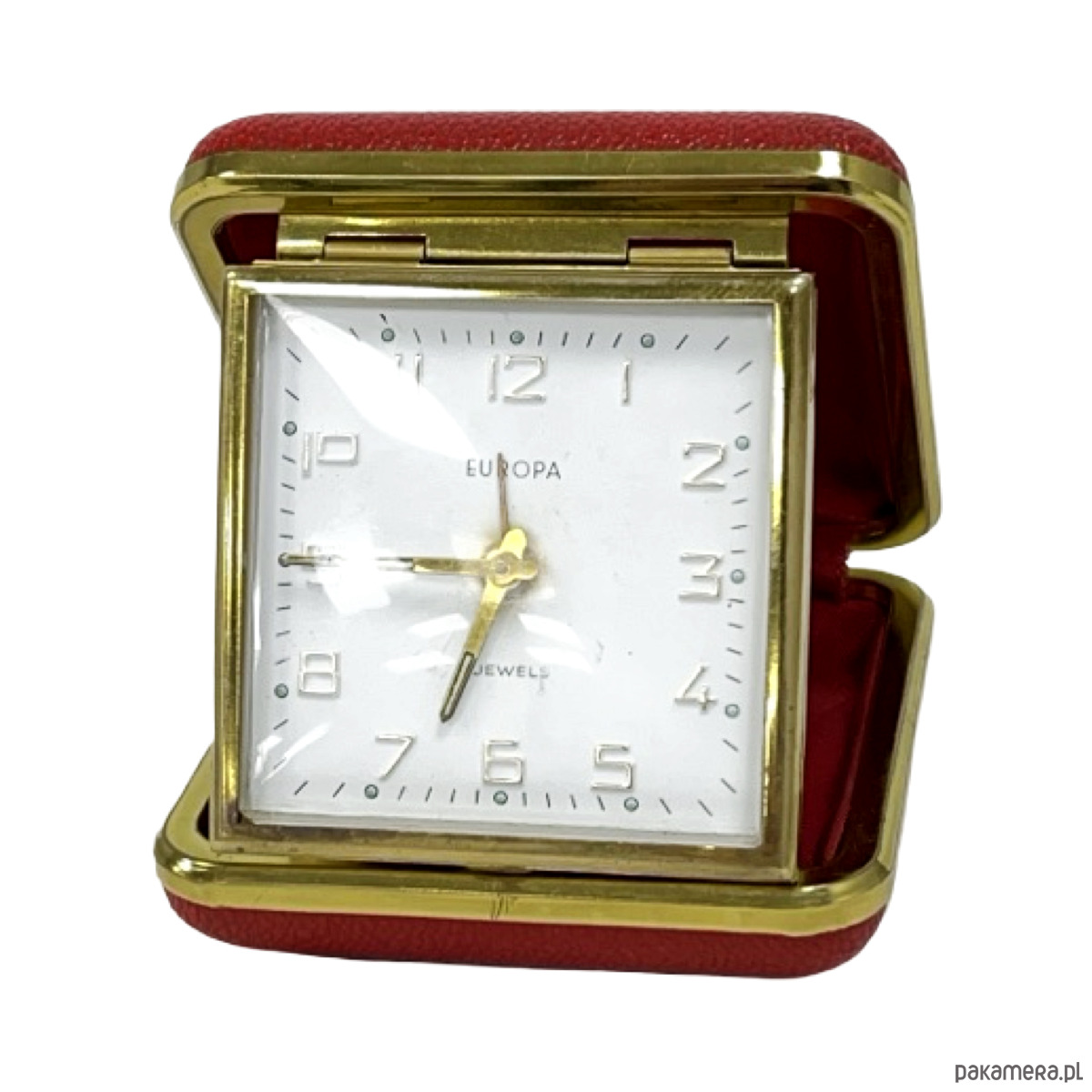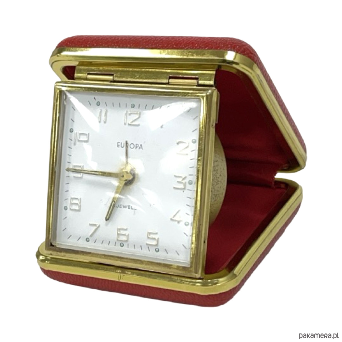 Vintage budzik, podróżny, EUROPA, lata 60, mechaniczny, 4 Jewels, retro designOryginalny budzik podróżny marki EUROPA, produkcja europejska, datowany na lata 60.–70. XX wieku. Klasyczny przykład wzornictwa retro z epoki mid-century, łączący elegancką formę z praktycznym, składanym etui podróżnym.