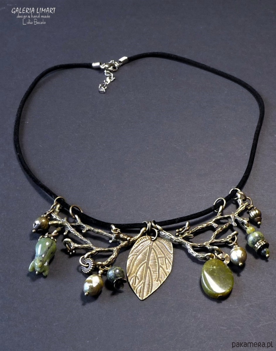 Lubisz taki styl? Jeśli tak to polecam ten uroczy eklektyczny i bardzo ozdobny, delikatny i uroczy naszyjnik z chryzoprazem i pięknymi zielonymi naturalnym perłami oraz oryginalnymi ciekawymi stylizowanymi gałązkami z mosiądzu. Wszystko utrzymane w eleganckiej starozłoto-zielonej tonacji, co dało niezwykle efektowny i spektakularny rezultat, tworząc naszyjnik w stylu dobrej starej biżuterii i modnego stylu boho. Lekki.