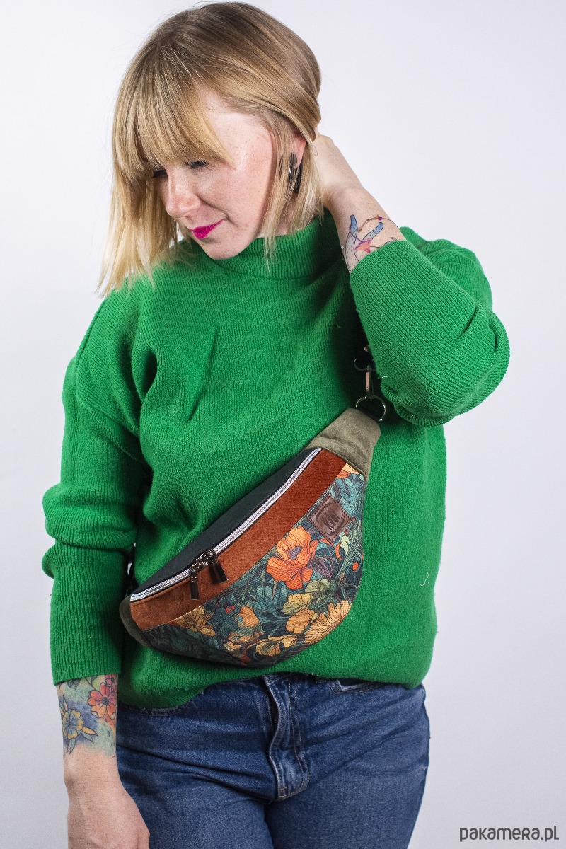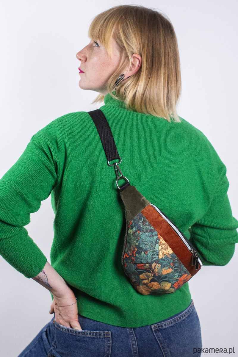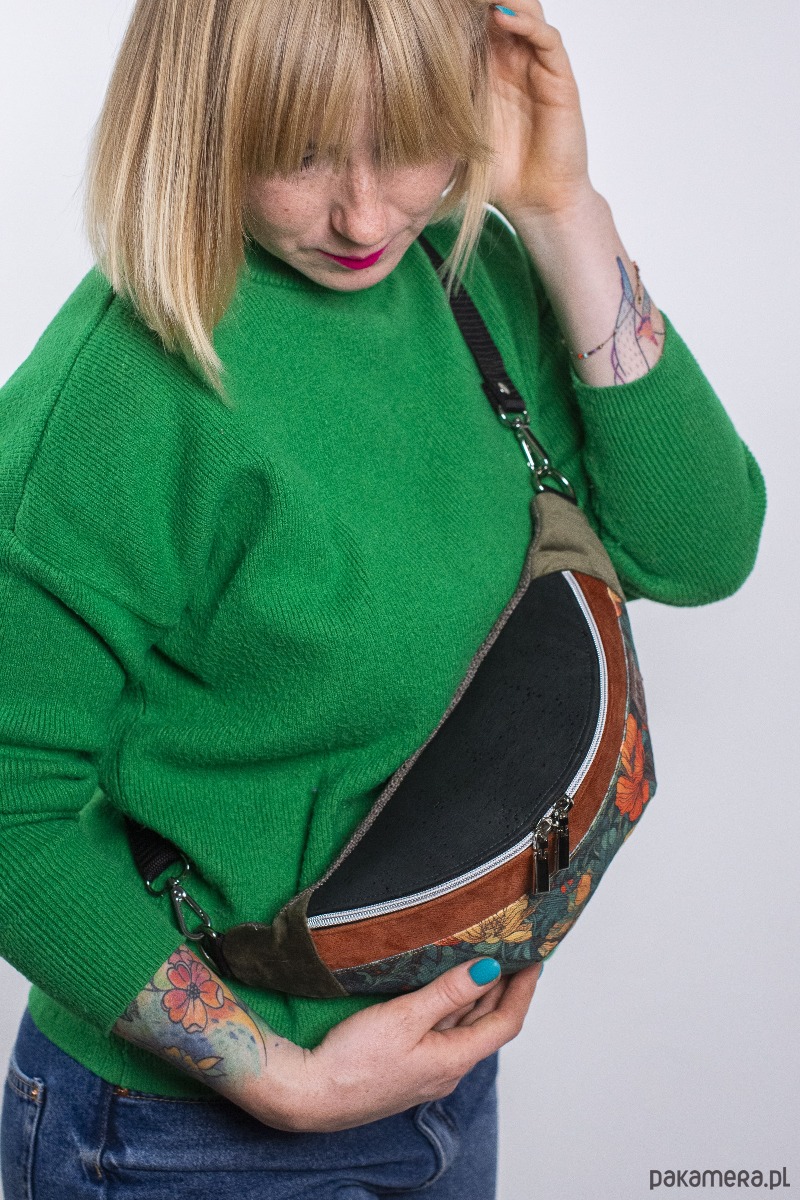 MATERIAŁ: kolorowa tkanina korkowa, drukowana gabardyna bawełniana 272 g/m2, tkanina tapicerska, wersja z bawełnianą podszewką 125 g/m2, pas samochodowy czarny 25 mm.