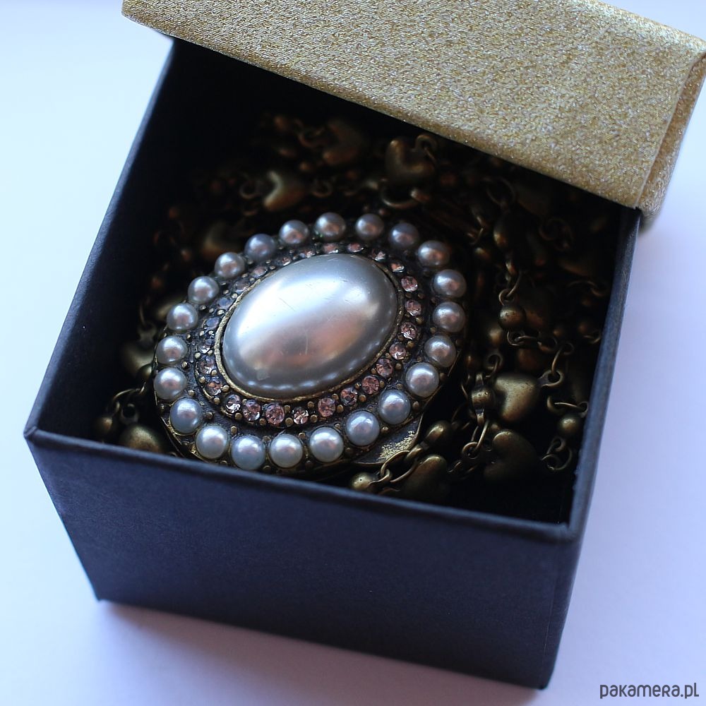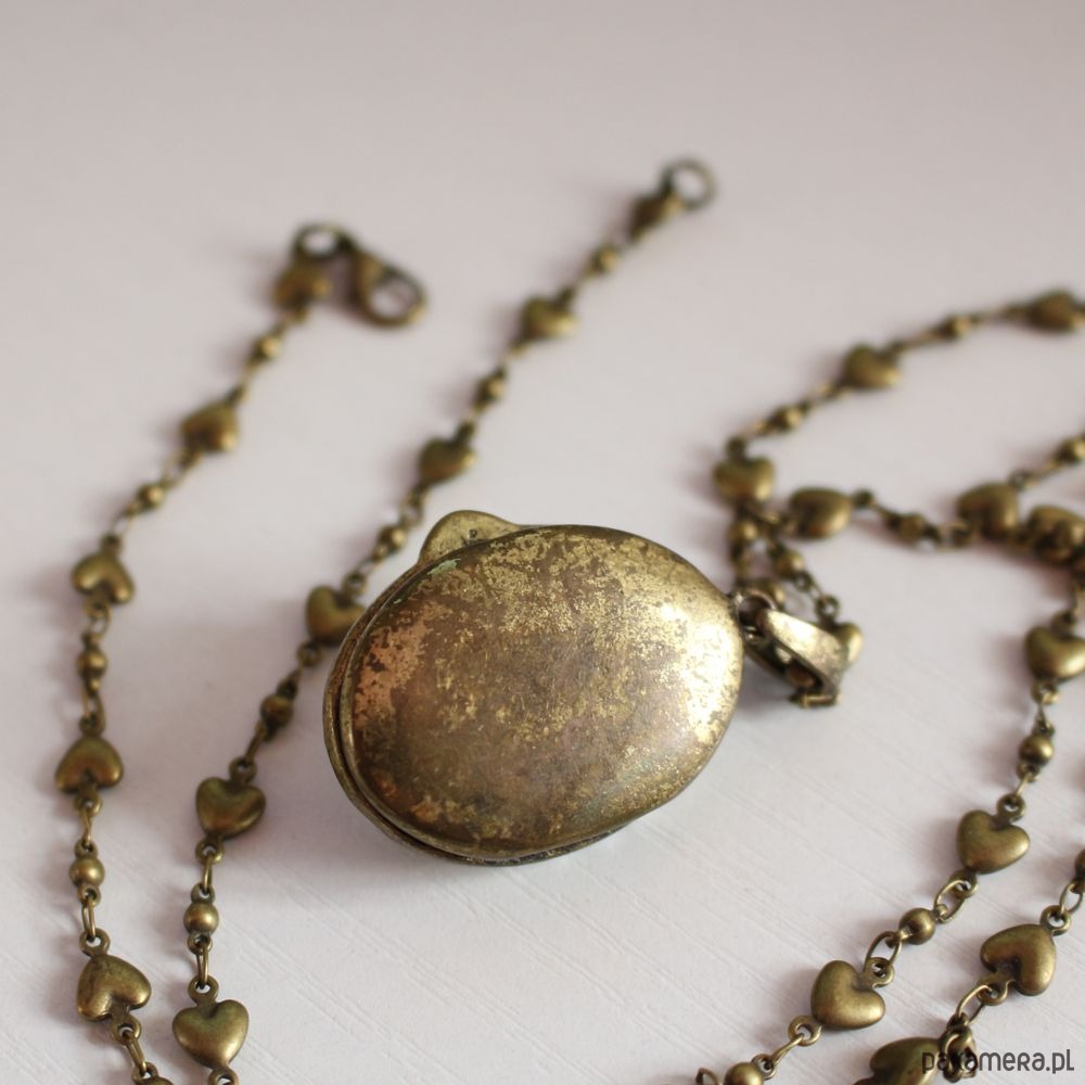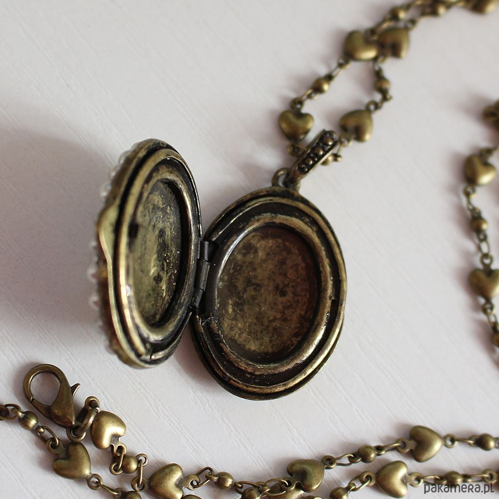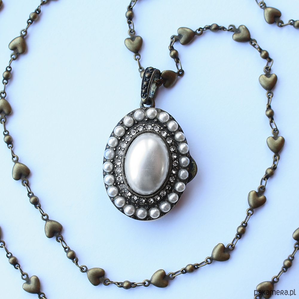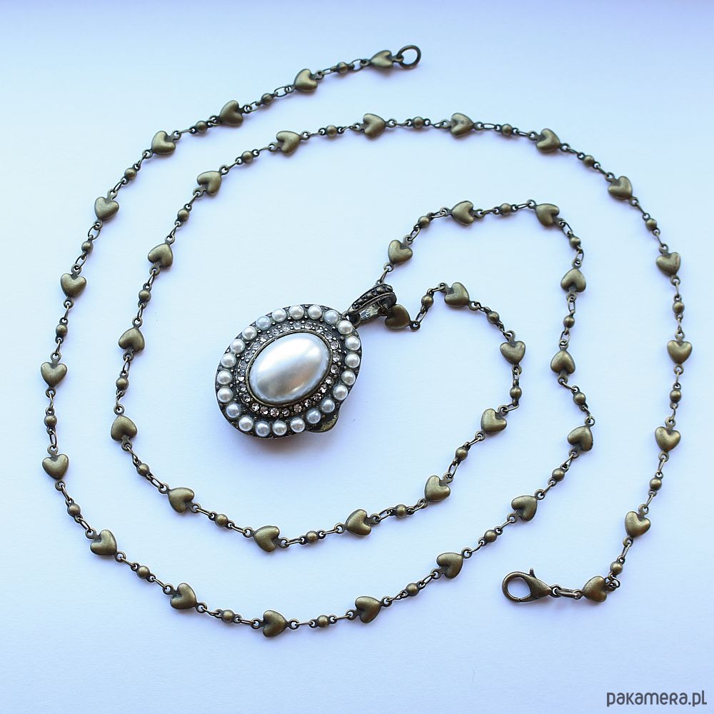 Autorski naszyjnik vintage z sekretnikiem wysadzanym perełkami i cyrkoniami, na oryginalnym łańcuszku wykonanym ręcznie, z elementami z motywem serduszek ze stopu metali bez niklu i ołowiu.