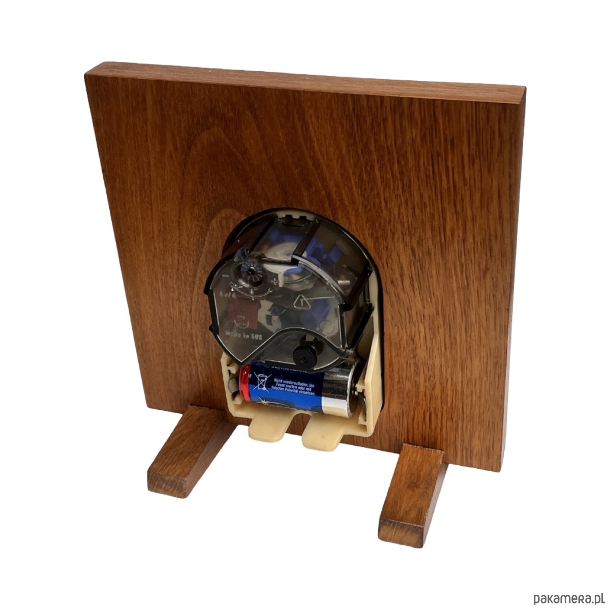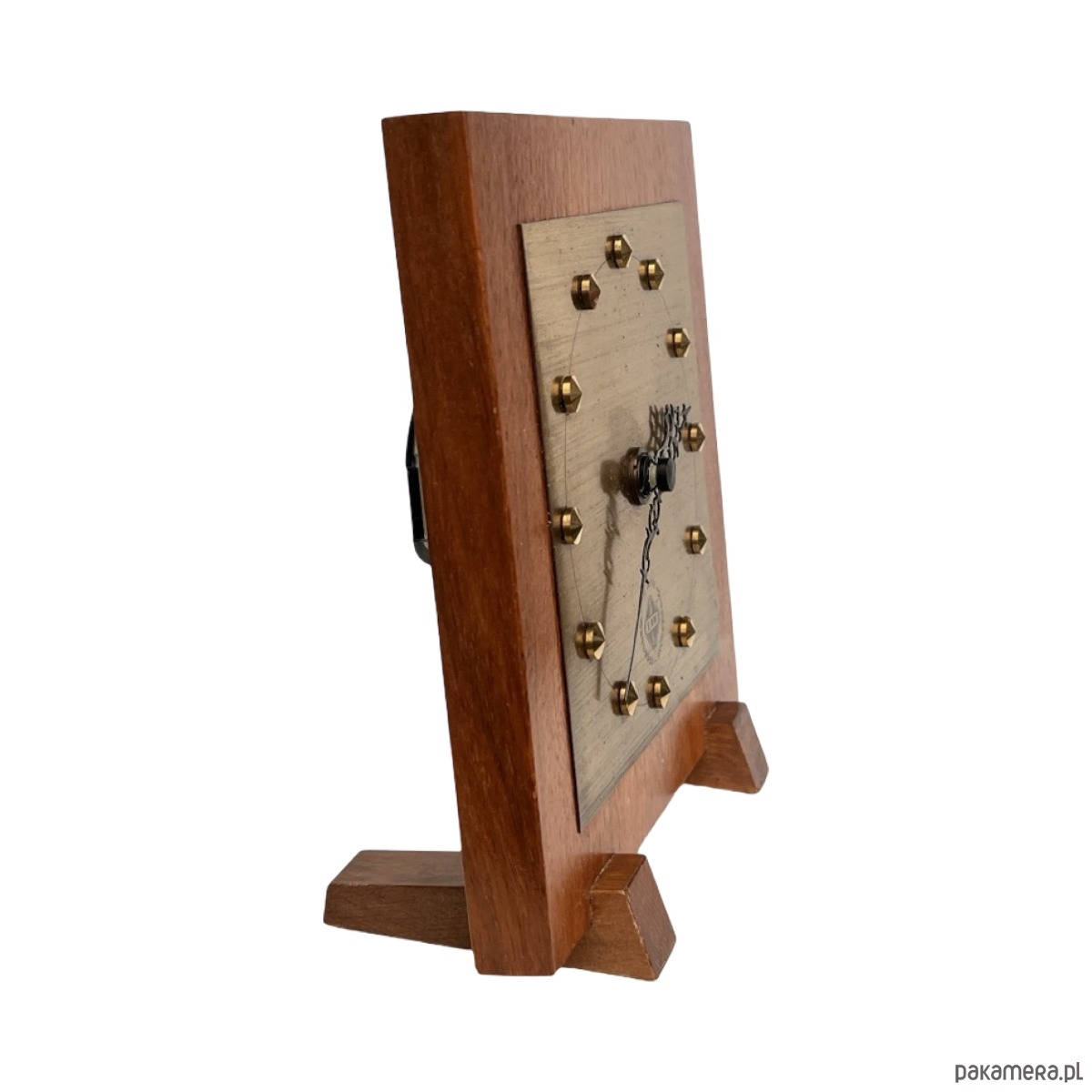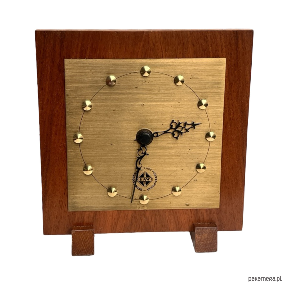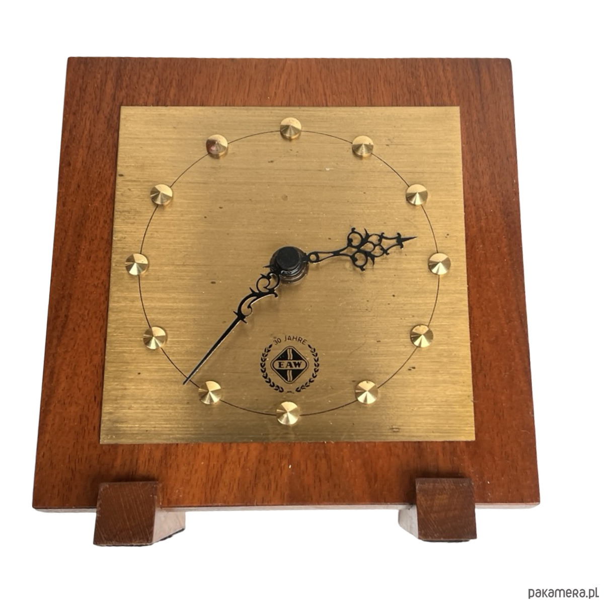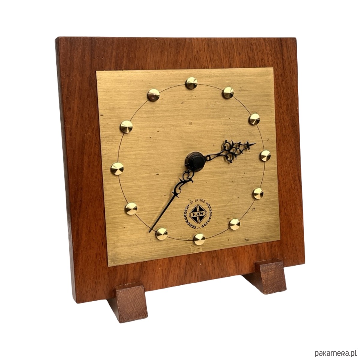 Stylowy, jubileuszowy zegar stołowy EAW (Elektro-Apparate-Werke) z lat 60., wykonany w Niemczech. Model zaprojektowany z myślą o elegancji i trwałości – łączy mosiężną tarczę z dekoracyjnymi indeksami oraz pięknie wyciętymi wskazówkami z solidną drewnianą obudową w odcieniu ciepłego brązu.