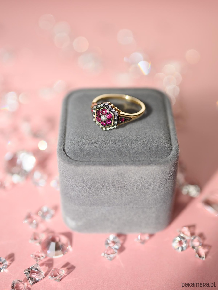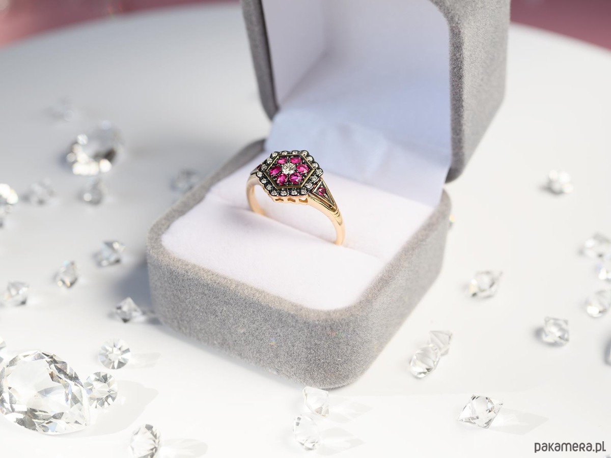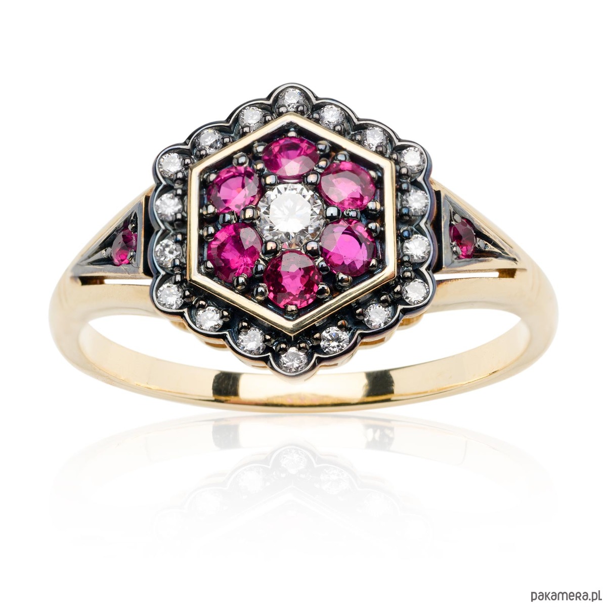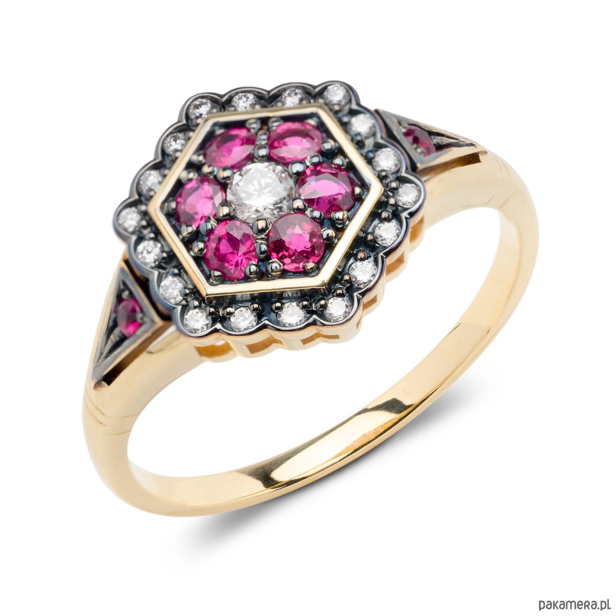 Pierścionek wyróżnia się geometrycznym, heksagonalnym motywem, typowym dla epoki Art Deco. Centralną ozdobą jest kompozycja ułożona w kwiat, składająca się z siedmiu kamieni. Centrum stanowi duży, lśniący diament, otoczony wiankiem sześciu szlachetnych rubinów. Całość podkreśla misterny, podwójny wieniec z diamentów, co dodaje pierścionkowi blasku i elegancji.