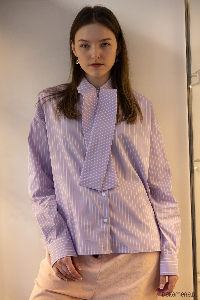 Elegancka koszula w lawendowym kolorze w białe prążki. Koszula ma przedłużony kołnierzyk, który możesz puścić luźno, lub przewiązać wg swojej fantazji, np. w kokardkę. Prosta forma o luźnym kroju, zapinana na guziczki. Mankiety zapinane na guziczek.