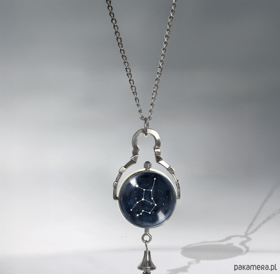 Zaprojektowany i wyprodukowany ręcznie w pracowni na krakowskim Kazimierzu. Niczym w magicznej kuli zamknęłam z jednej strony miniaturkę mojej grafiki, z drugiej zegarek. Baza zegarka w kolorze antycznego srebra. Średnica naszyjnika 25 mm. Naszyjnik ozdobiony jest dzwoneczkiem. Zegarek posiada wysokiej jakości mechanizm kwarcowy Miyota oraz wymienialną baterię. Długość łańcuszka 80 cm. Wolny od niklu i ołowiu - antyalergiczny.