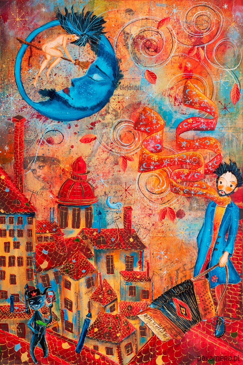 Voland na dachu - wydruk na płótnie z oryginału (akryle i kolaż na płótnie).