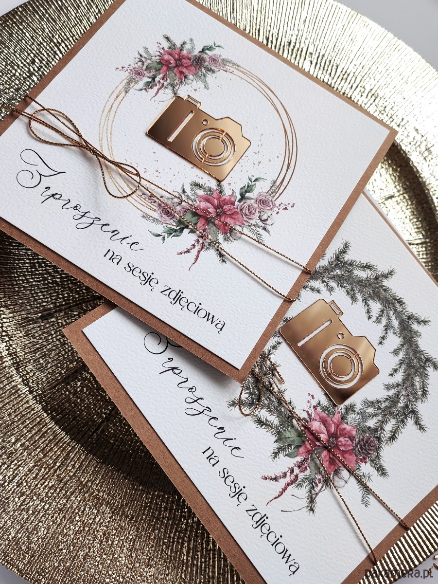 Voucher - zaproszenie na sesję fotograficzną w komplecie z kopertą śmietankową lub czarną.