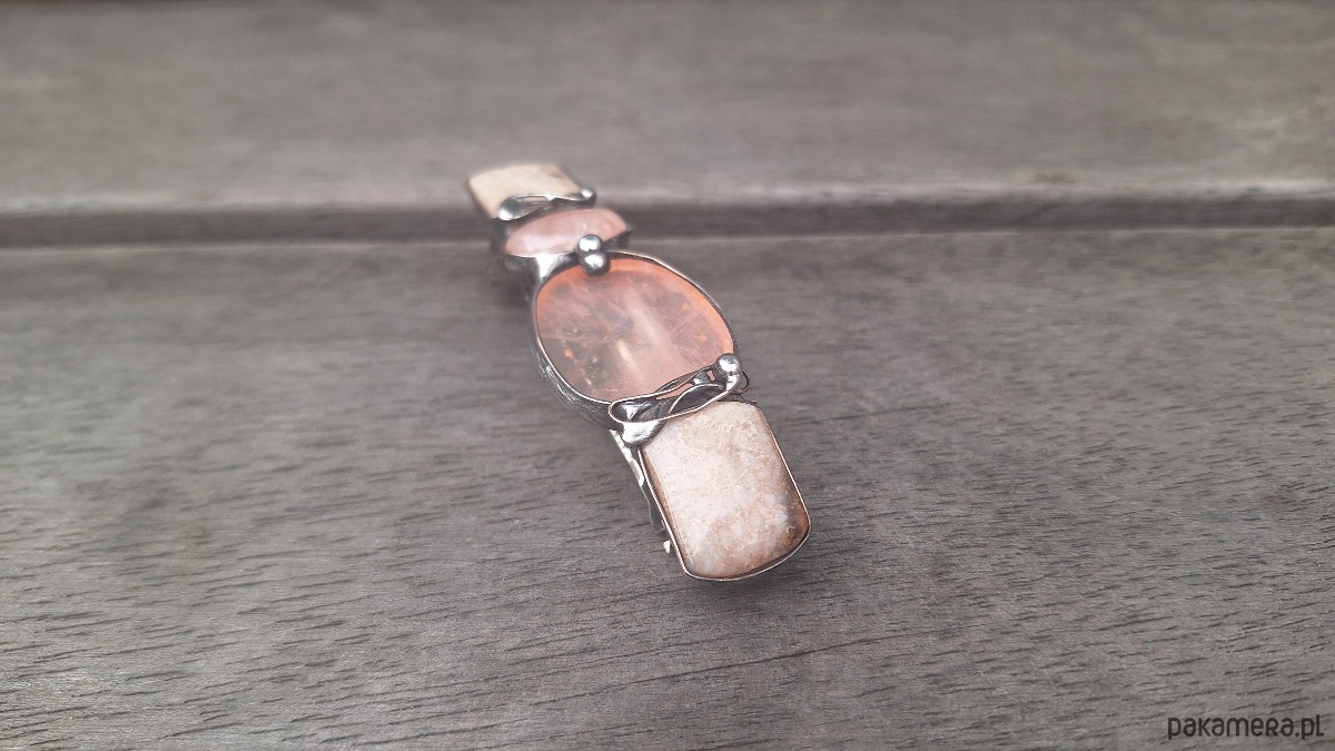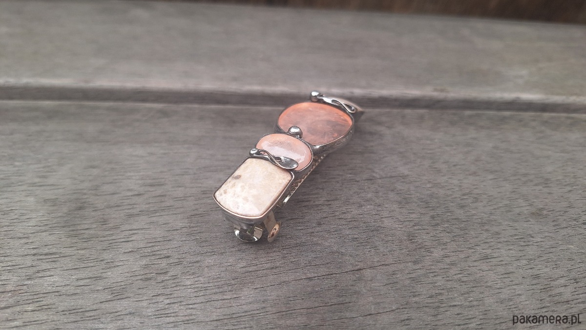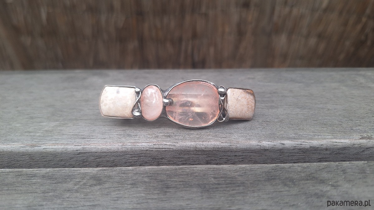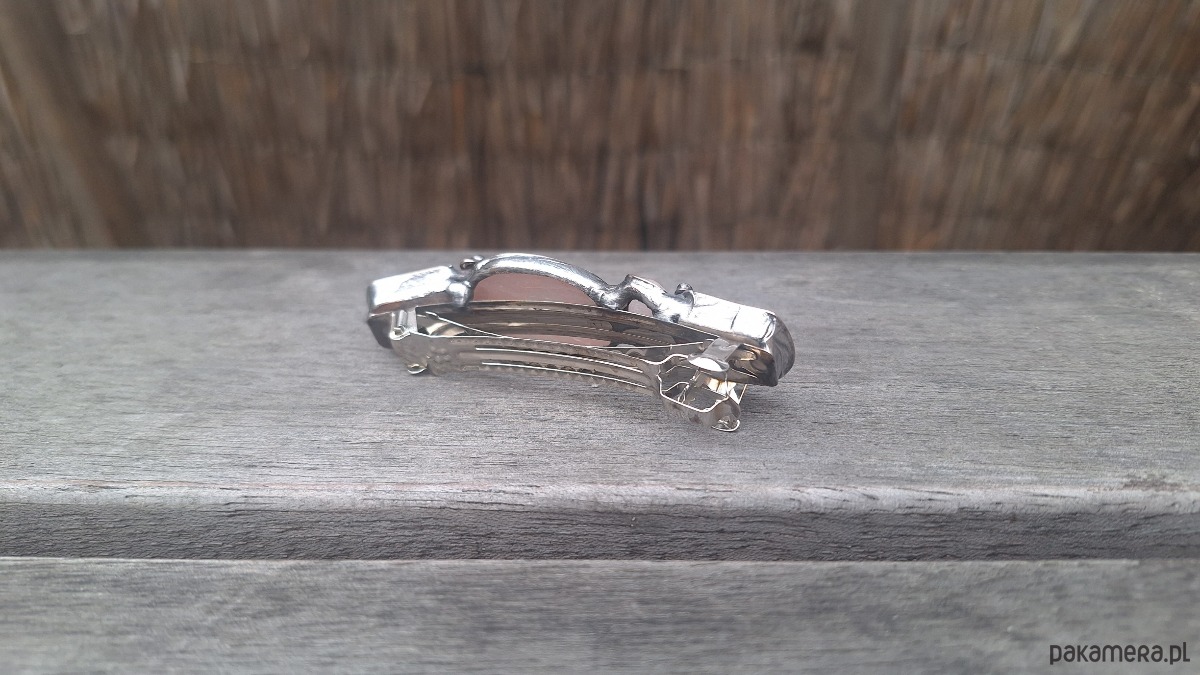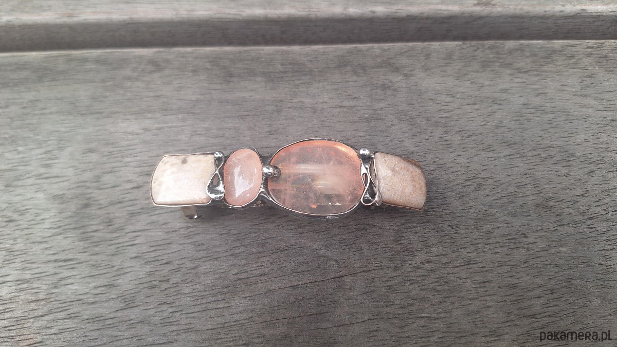 Klamra do włosów, wykonana z miedzi, cyny, koralowców i kwarców. Wymiary ok. 8 na 2 cm. Zapięcie 6 cm, metalowe.
