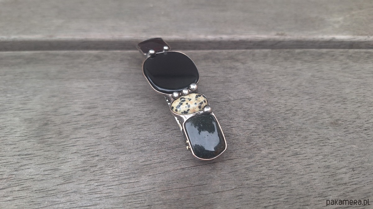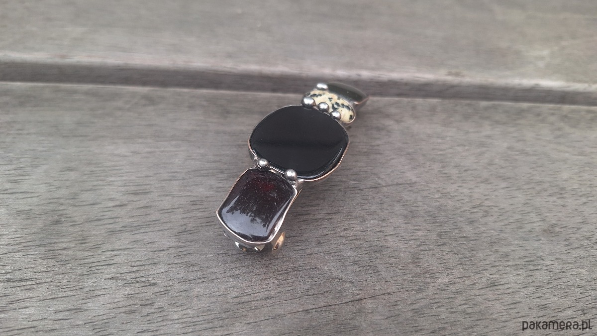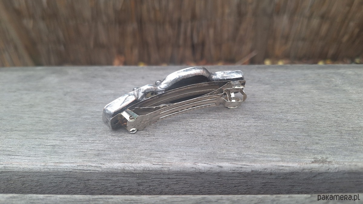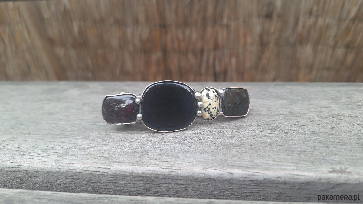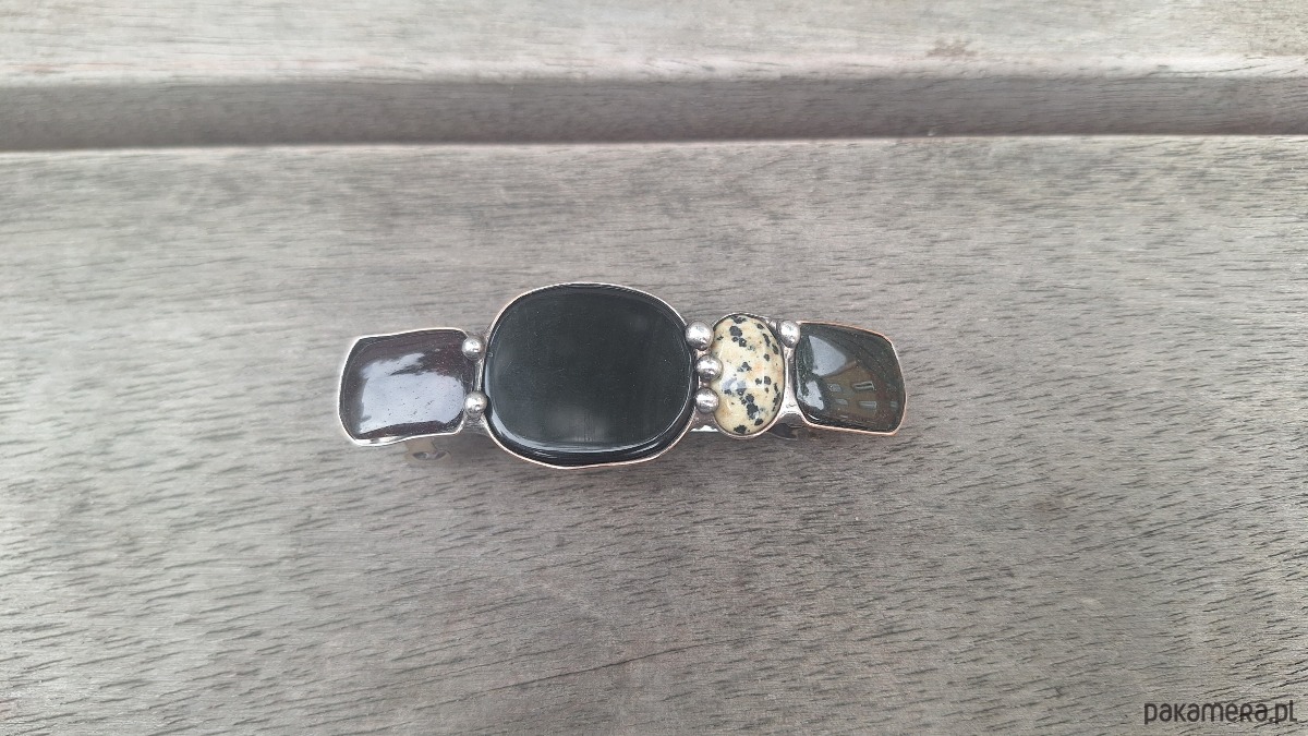 Klamra do włosów, wykonana z miedzi, cyny, jaspisów i onyksu. Wymiary ok. 8 na 2.5 cm. Zapięcie 6 cm, metalowe.