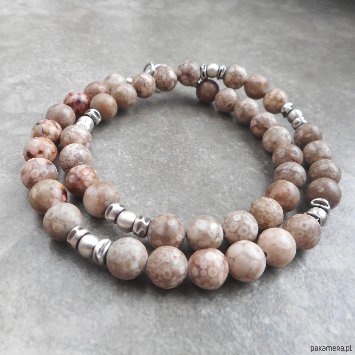 Piękny, bardzo kobiecy naszyjnik wykonany ze szlachetnego srebra i kamieni naturalnych; dla wielbicielek naturalnych barw ziemi, korale w beżach i brązach, wyraziste kule 10 mm.