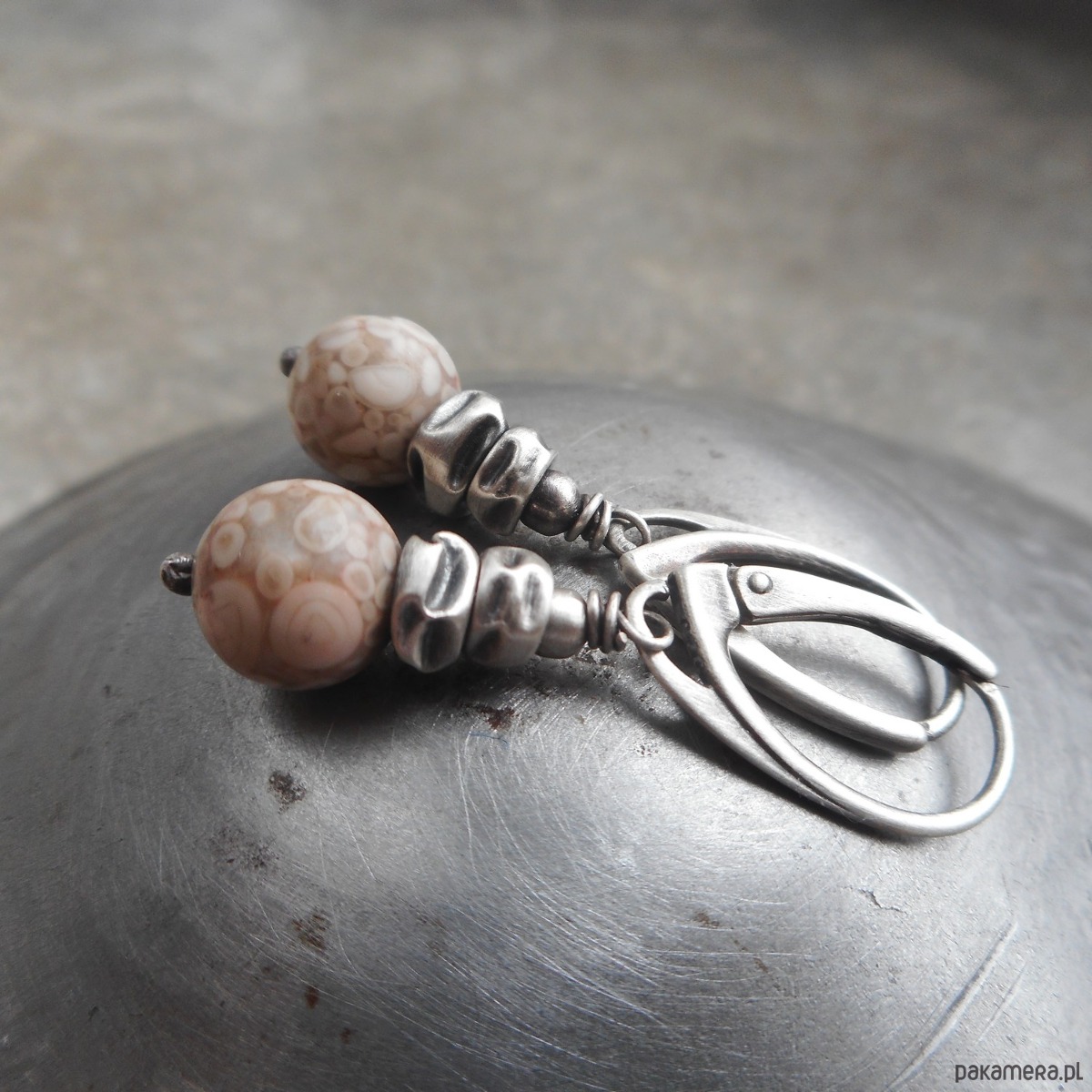 Kolczyki z kamieni naturalnych i szlachetnego srebra; klasyczne, wiszące, ciekawe beżowe kamienie przełożone gniecionymi przekładkami.