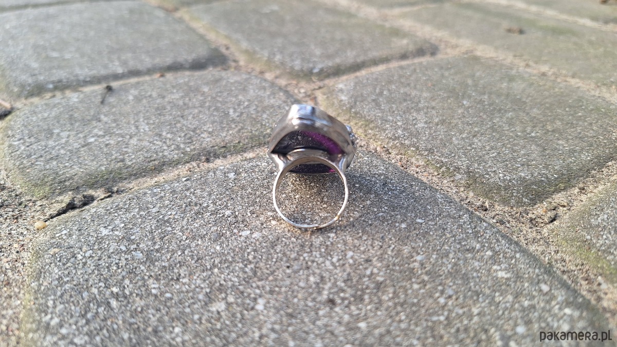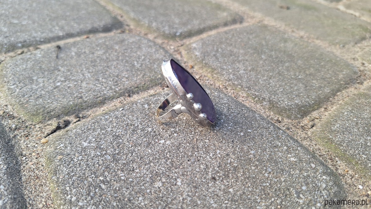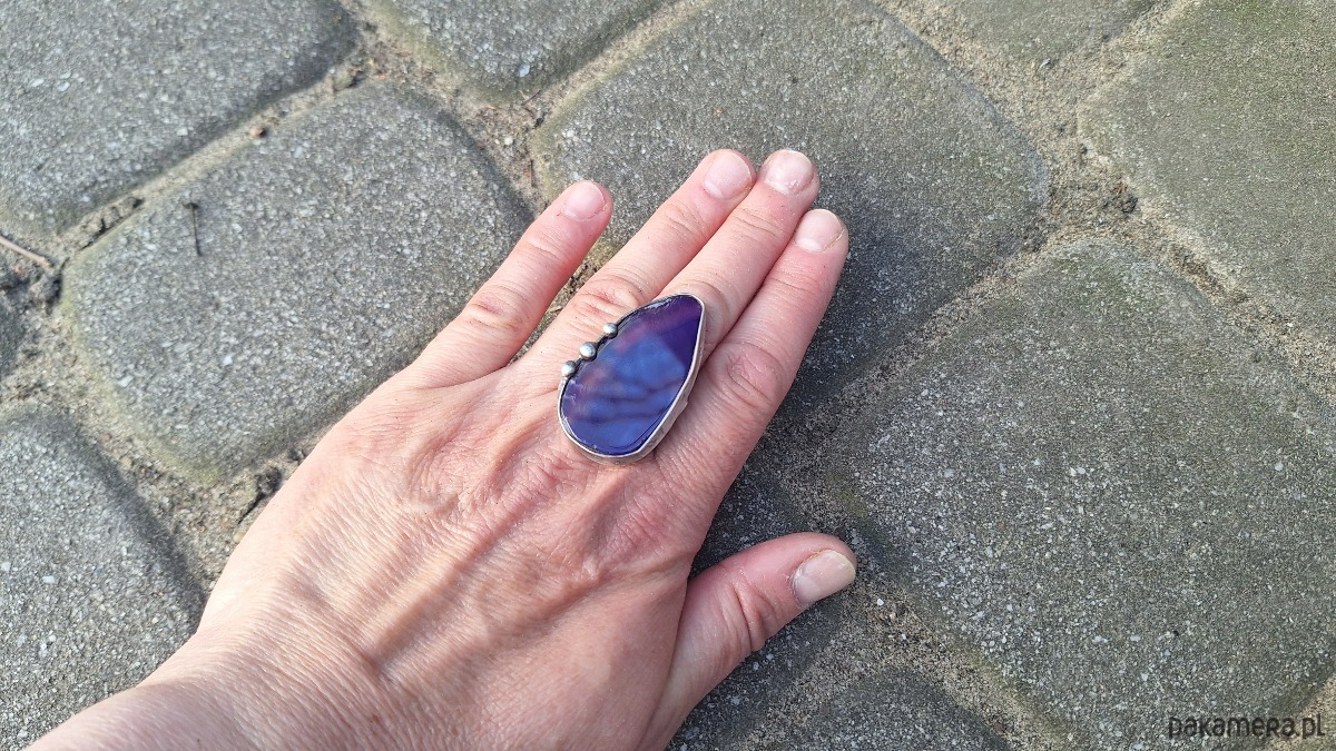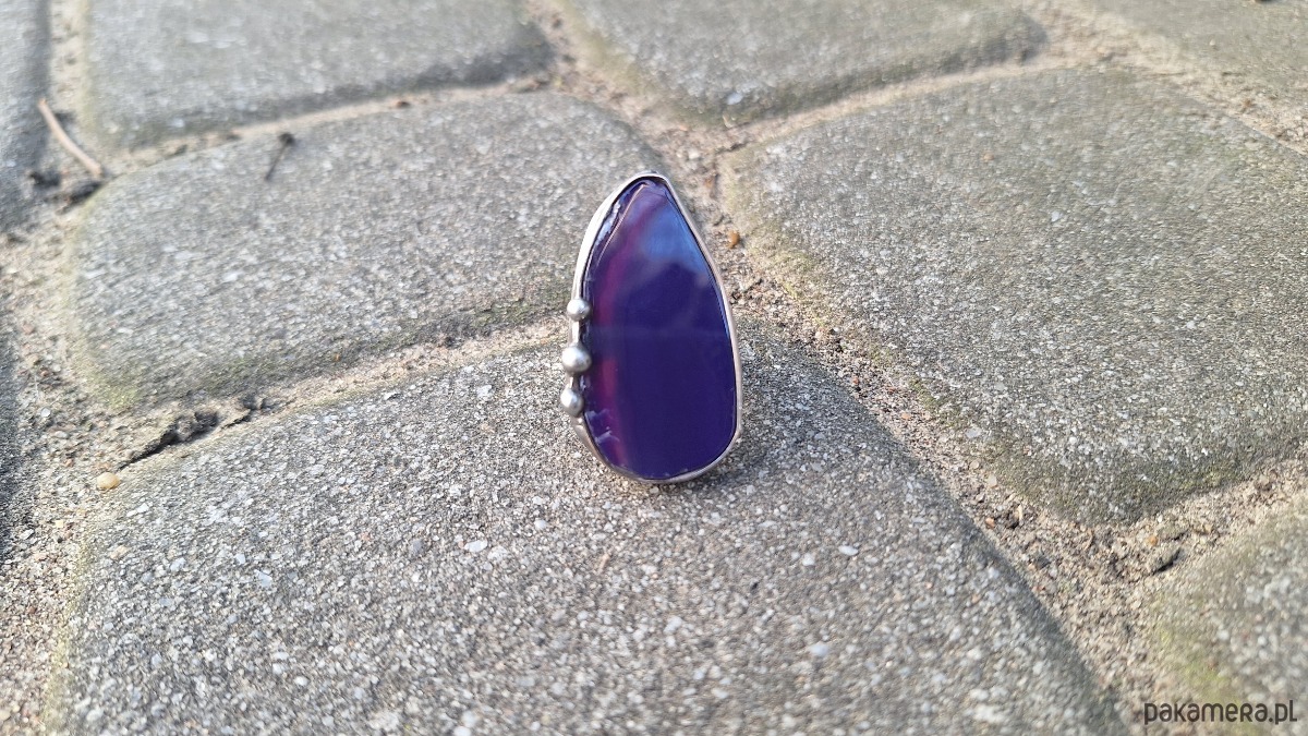 Pierścionek wykonany z miedzi, cyny i agatu. Wymiary ok. 4 na 2 cm. Regulowany. Nie jest ciężki.