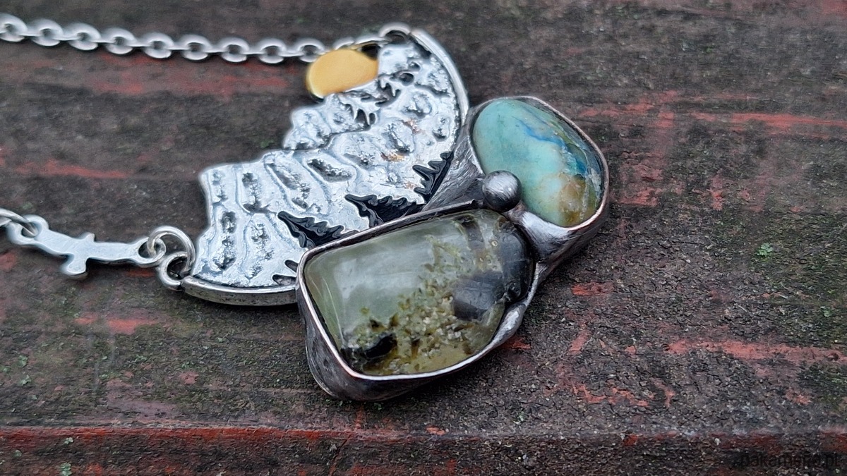 Wisiorek wykonany z miedzi, cyny, prenitu i chryzoprazu