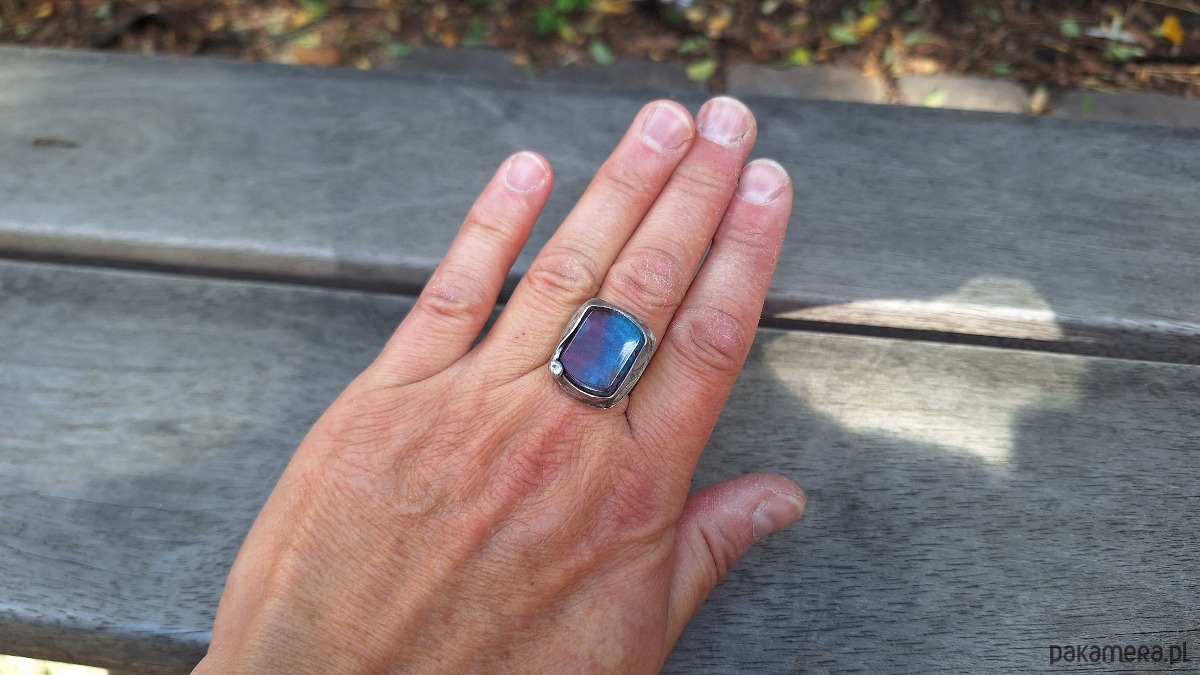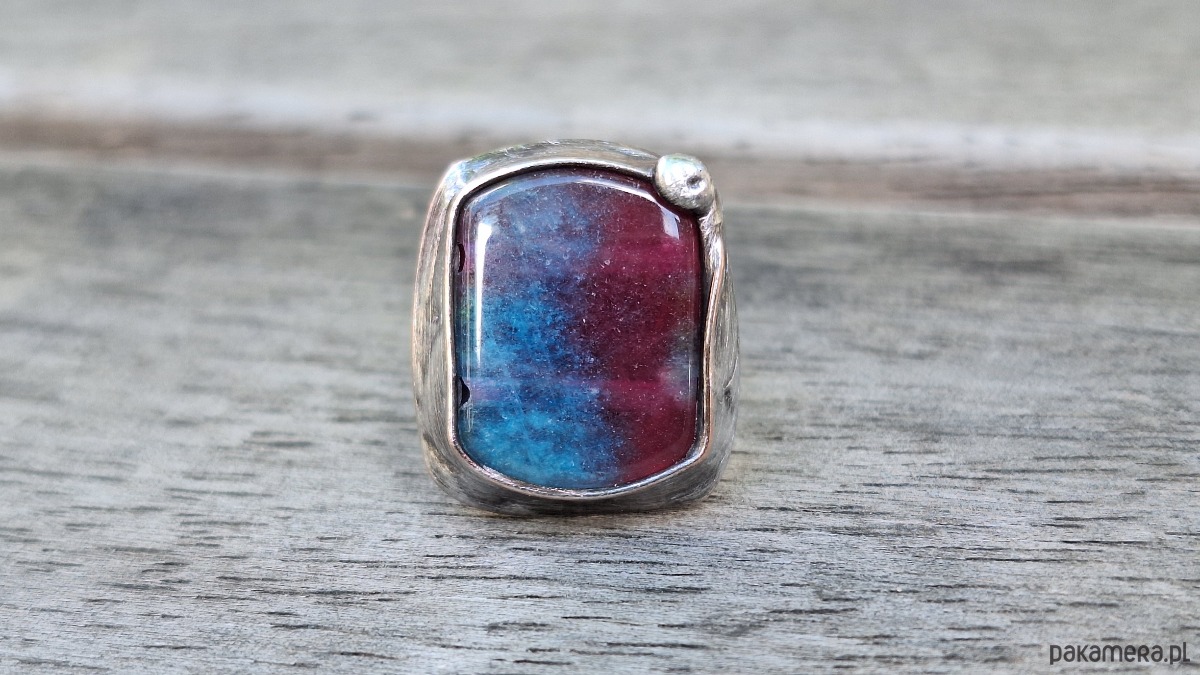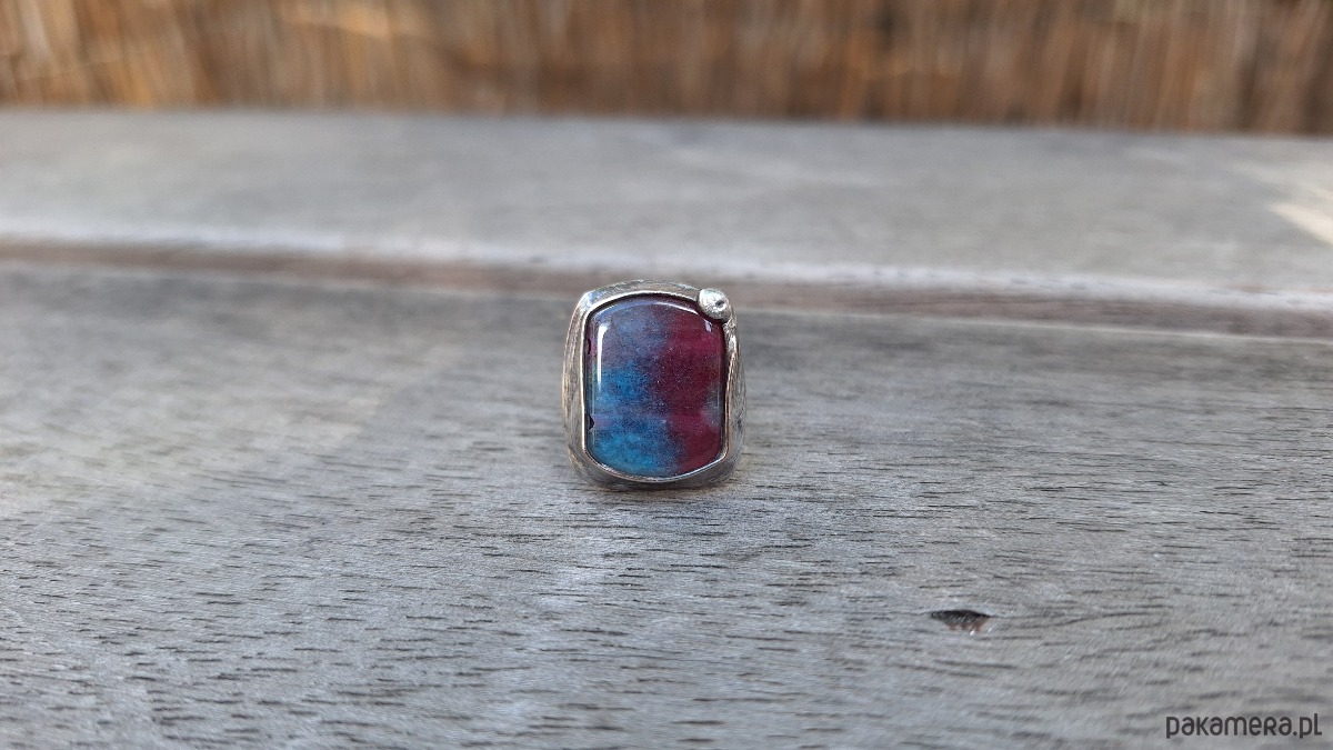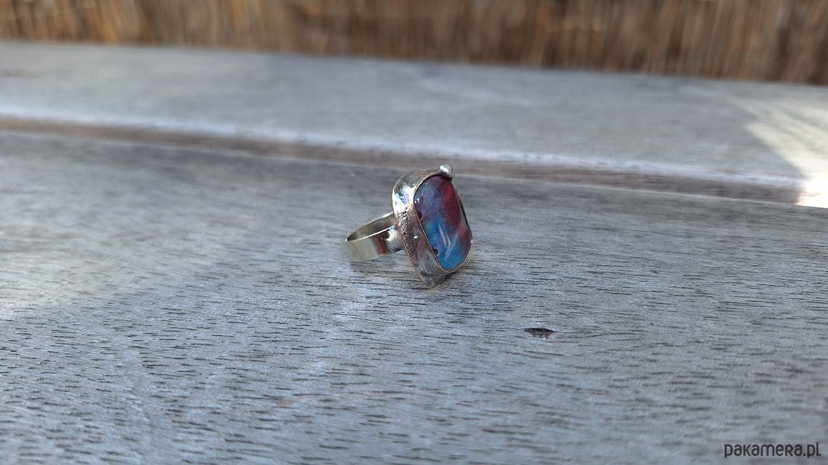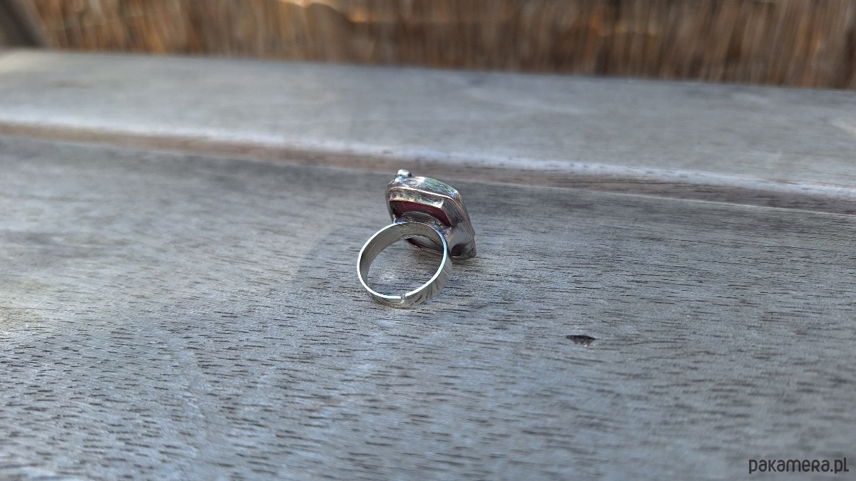 Pierścionek wykonany z miedzi, cyny i jaspisu. Wymiary ok. 2 na 1.8 cm. Regulowany. Nie jest ciężki.